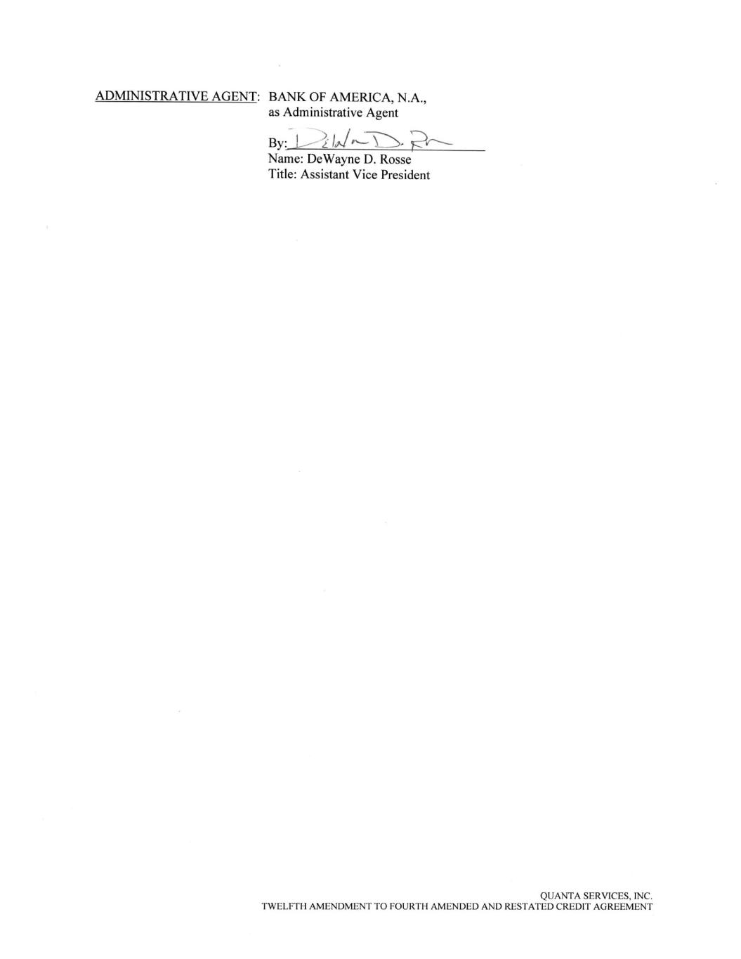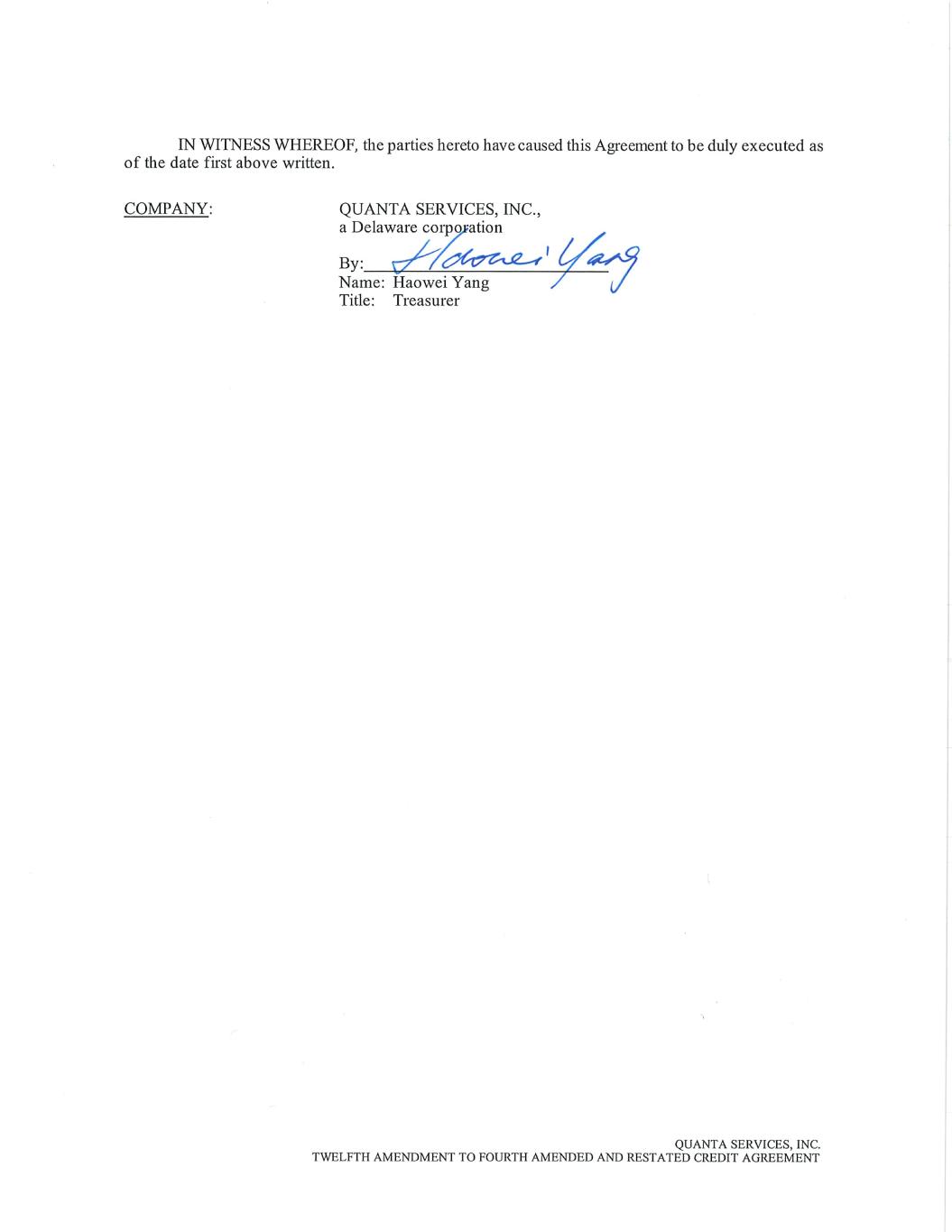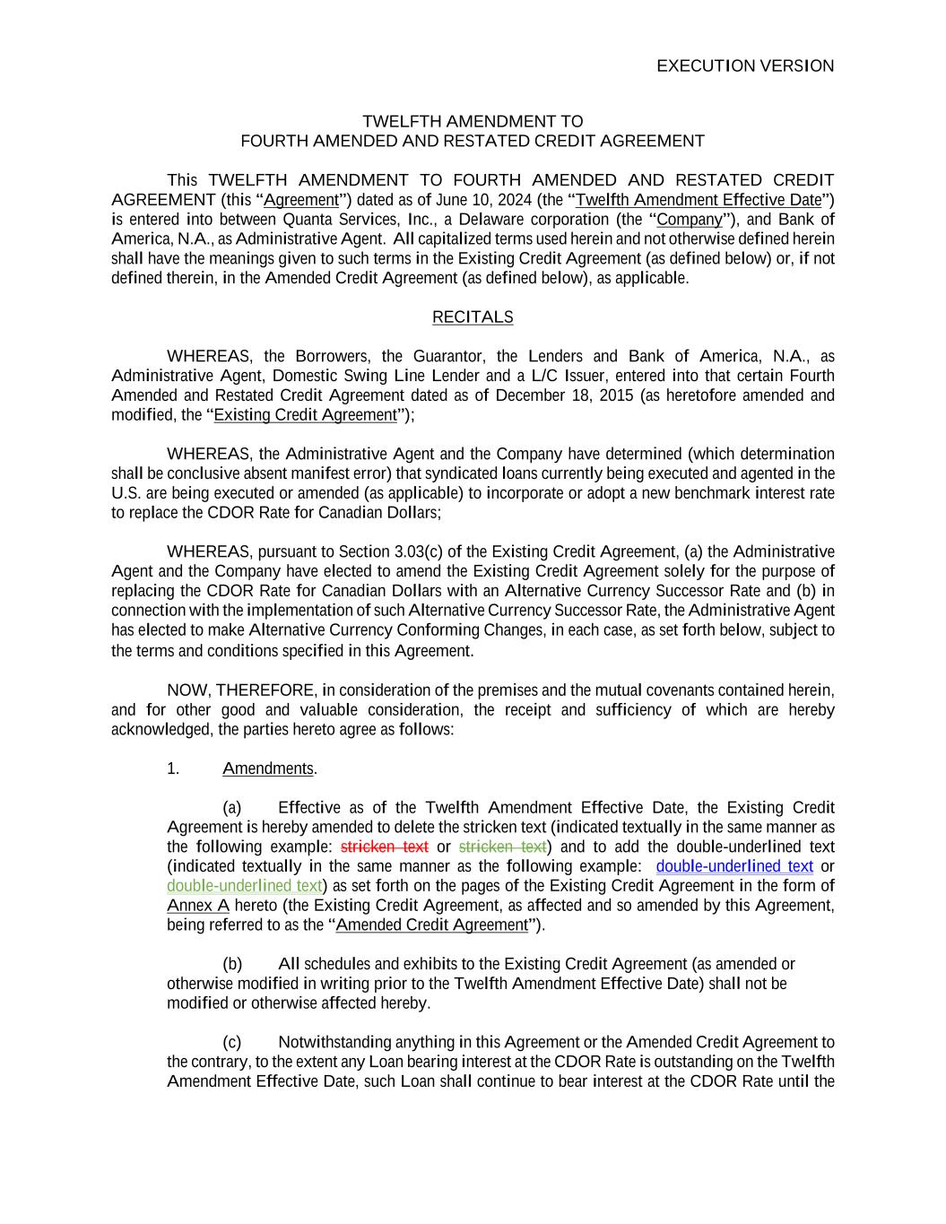 EXECUTION VERSION TWELFTH AMENDMENT TO FOURTH AMENDED AND RESTATED CREDIT AGREEMENT This TWELFTH AMENDMENT TO FOURTH AMENDED AND RESTATED CREDIT AGREEMENT (this “Agreement”) dated as of June 10, 2024 (the “Twelfth Amendment Effective Date”) is entered into between Quanta Services, Inc., a Delaware corporation (the “Company”), and Bank of America, N.A., as Administrative Agent. All capitalized terms used herein and not otherwise defined herein shall have the meanings given to such terms in the Existing Credit Agreement (as defined below) or, if not defined therein, in the Amended Credit Agreement (as defined below), as applicable. RECITALS WHEREAS, the Borrowers, the Guarantor, the Lenders and Bank of America, N.A., as Administrative Agent, Domestic Swing Line Lender and a L/C Issuer, entered into that certain Fourth Amended and Restated Credit Agreement dated as of December 18, 2015 (as heretofore amended and modified, the “Existing Credit Agreement”); WHEREAS, the Administrative Agent and the Company have determined (which determination shall be conclusive absent manifest error) that syndicated loans currently being executed and agented in the U.S. are being executed or amended (as applicable) to incorporate or adopt a new benchmark interest rate to replace the CDOR Rate for Canadian Dollars; WHEREAS, pursuant to Section 3.03(c) of the Existing Credit Agreement, (a) the Administrative Agent and the Company have elected to amend the Existing Credit Agreement solely for the purpose of replacing the CDOR Rate for Canadian Dollars with an Alternative Currency Successor Rate and (b) in connection with the implementation of such Alternative Currency Successor Rate, the Administrative Agent has elected to make Alternative Currency Conforming Changes, in each case, as set forth below, subject to the terms and conditions specified in this Agreement. NOW, THEREFORE, in consideration of the premises and the mutual covenants contained herein, and for other good and valuable consideration, the receipt and sufficiency of which are hereby acknowledged, the parties hereto agree as follows: 1. Amendments. (a) Effective as of the Twelfth Amendment Effective Date, the Existing Credit Agreement is hereby amended to delete the stricken text (indicated textually in the same manner as the following example: stricken text or stricken text) and to add the double-underlined text (indicated textually in the same manner as the following example: double-underlined text or double-underlined text) as set forth on the pages of the Existing Credit Agreement in the form of Annex A hereto (the Existing Credit Agreement, as affected and so amended by this Agreement, being referred to as the “Amended Credit Agreement”). (b) All schedules and exhibits to the Existing Credit Agreement (as amended or otherwise modified in writing prior to the Twelfth Amendment Effective Date) shall not be modified or otherwise affected hereby. (c) Notwithstanding anything in this Agreement or the Amended Credit Agreement to the contrary, to the extent any Loan bearing interest at the CDOR Rate is outstanding on the Twelfth Amendment Effective Date, such Loan shall continue to bear interest at the CDOR Rate until the