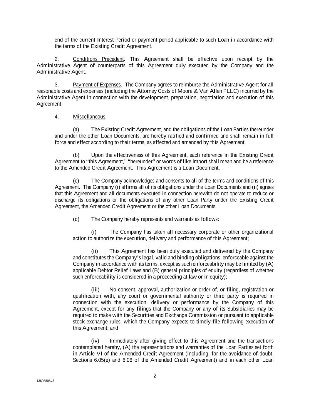 2 13608806v3 end of the current Interest Period or payment period applicable to such Loan in accordance with the terms of the Existing Credit Agreement. 2. Conditions Precedent. This Agreement shall be effective upon receipt by the Administrative Agent of counterparts of this Agreement duly executed by the Company and the Administrative Agent. 3. Payment of Expenses. The Company agrees to reimburse the Administrative Agent for all reasonable costs and expenses (including the Attorney Costs of Moore & Van Allen PLLC) incurred by the Administrative Agent in connection with the development, preparation, negotiation and execution of this Agreement. 4. Miscellaneous. (a) The Existing Credit Agreement, and the obligations of the Loan Parties thereunder and under the other Loan Documents, are hereby ratified and confirmed and shall remain in full force and effect according to their terms, as affected and amended by this Agreement. (b) Upon the effectiveness of this Agreement, each reference in the Existing Credit Agreement to “this Agreement,” “hereunder” or words of like import shall mean and be a reference to the Amended Credit Agreement. This Agreement is a Loan Document. (c) The Company acknowledges and consents to all of the terms and conditions of this Agreement. The Company (i) affirms all of its obligations under the Loan Documents and (ii) agrees that this Agreement and all documents executed in connection herewith do not operate to reduce or discharge its obligations or the obligations of any other Loan Party under the Existing Credit Agreement, the Amended Credit Agreement or the other Loan Documents. (d) The Company hereby represents and warrants as follows: (i) The Company has taken all necessary corporate or other organizational action to authorize the execution, delivery and performance of this Agreement; (ii) This Agreement has been duly executed and delivered by the Company and constitutes the Company’s legal, valid and binding obligations, enforceable against the Company in accordance with its terms, except as such enforceability may be limited by (A) applicable Debtor Relief Laws and (B) general principles of equity (regardless of whether such enforceability is considered in a proceeding at law or in equity); (iii) No consent, approval, authorization or order of, or filing, registration or qualification with, any court or governmental authority or third party is required in connection with the execution, delivery or performance by the Company of this Agreement, except for any filings that the Company or any of its Subsidiaries may be required to make with the Securities and Exchange Commission or pursuant to applicable stock exchange rules, which the Company expects to timely file following execution of this Agreement; and (iv) Immediately after giving effect to this Agreement and the transactions contemplated hereby, (A) the representations and warranties of the Loan Parties set forth in Article VI of the Amended Credit Agreement (including, for the avoidance of doubt, Sections 6.05(e) and 6.06 of the Amended Credit Agreement) and in each other Loan
