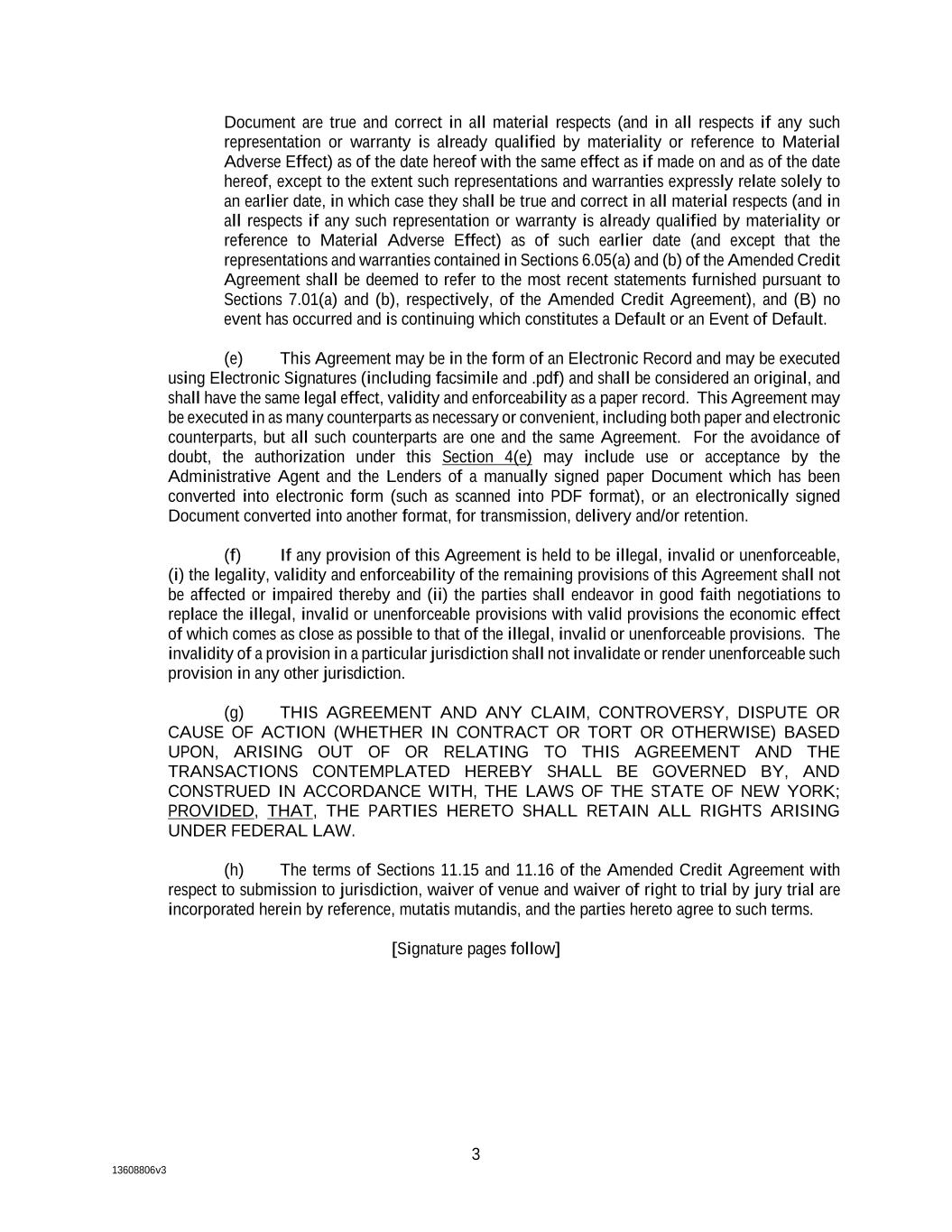 3 13608806v3 Document are true and correct in all material respects (and in all respects if any such representation or warranty is already qualified by materiality or reference to Material Adverse Effect) as of the date hereof with the same effect as if made on and as of the date hereof, except to the extent such representations and warranties expressly relate solely to an earlier date, in which case they shall be true and correct in all material respects (and in all respects if any such representation or warranty is already qualified by materiality or reference to Material Adverse Effect) as of such earlier date (and except that the representations and warranties contained in Sections 6.05(a) and (b) of the Amended Credit Agreement shall be deemed to refer to the most recent statements furnished pursuant to Sections 7.01(a) and (b), respectively, of the Amended Credit Agreement), and (B) no event has occurred and is continuing which constitutes a Default or an Event of Default. (e) This Agreement may be in the form of an Electronic Record and may be executed using Electronic Signatures (including facsimile and .pdf) and shall be considered an original, and shall have the same legal effect, validity and enforceability as a paper record. This Agreement may be executed in as many counterparts as necessary or convenient, including both paper and electronic counterparts, but all such counterparts are one and the same Agreement. For the avoidance of doubt, the authorization under this Section 4(e) may include use or acceptance by the Administrative Agent and the Lenders of a manually signed paper Document which has been converted into electronic form (such as scanned into PDF format), or an electronically signed Document converted into another format, for transmission, delivery and/or retention. (f) If any provision of this Agreement is held to be illegal, invalid or unenforceable, (i) the legality, validity and enforceability of the remaining provisions of this Agreement shall not be affected or impaired thereby and (ii) the parties shall endeavor in good faith negotiations to replace the illegal, invalid or unenforceable provisions with valid provisions the economic effect of which comes as close as possible to that of the illegal, invalid or unenforceable provisions. The invalidity of a provision in a particular jurisdiction shall not invalidate or render unenforceable such provision in any other jurisdiction. (g) THIS AGREEMENT AND ANY CLAIM, CONTROVERSY, DISPUTE OR CAUSE OF ACTION (WHETHER IN CONTRACT OR TORT OR OTHERWISE) BASED UPON, ARISING OUT OF OR RELATING TO THIS AGREEMENT AND THE TRANSACTIONS CONTEMPLATED HEREBY SHALL BE GOVERNED BY, AND CONSTRUED IN ACCORDANCE WITH, THE LAWS OF THE STATE OF NEW YORK; PROVIDED, THAT, THE PARTIES HERETO SHALL RETAIN ALL RIGHTS ARISING UNDER FEDERAL LAW. (h) The terms of Sections 11.15 and 11.16 of the Amended Credit Agreement with respect to submission to jurisdiction, waiver of venue and waiver of right to trial by jury trial are incorporated herein by reference, mutatis mutandis, and the parties hereto agree to such terms. [Signature pages follow]