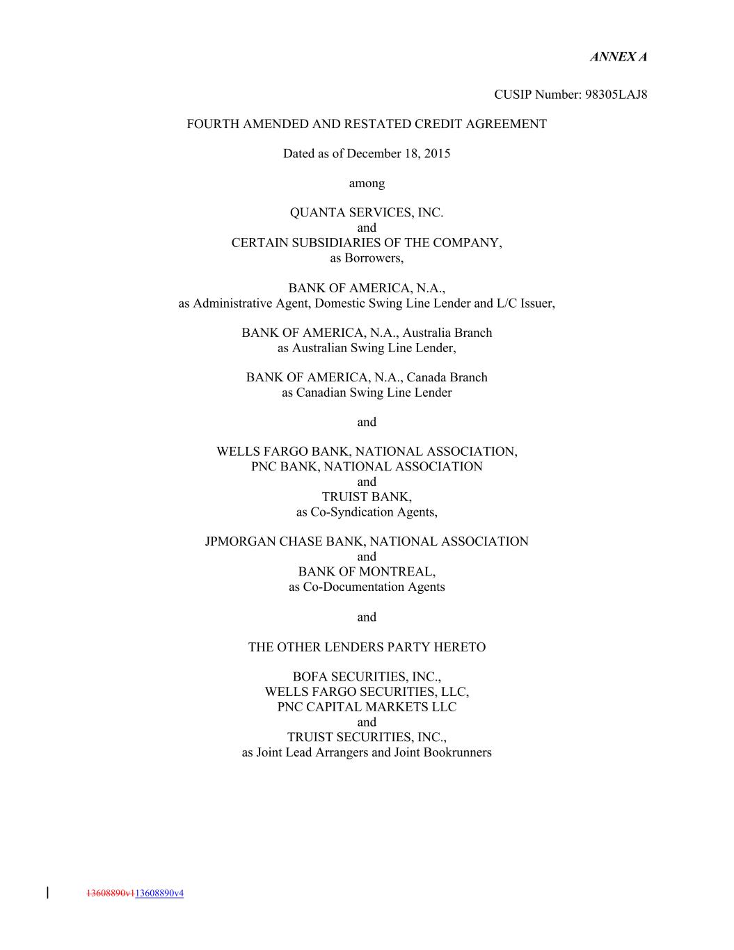 ANNEX A CUSIP Number: 98305LAJ8 FOURTH AMENDED AND RESTATED CREDIT AGREEMENT Dated as of December 18, 2015 among QUANTA SERVICES, INC. and CERTAIN SUBSIDIARIES OF THE COMPANY, as Borrowers, BANK OF AMERICA, N.A., as Administrative Agent, Domestic Swing Line Lender and L/C Issuer, BANK OF AMERICA, N.A., Australia Branch as Australian Swing Line Lender, BANK OF AMERICA, N.A., Canada Branch as Canadian Swing Line Lender and WELLS FARGO BANK, NATIONAL ASSOCIATION, PNC BANK, NATIONAL ASSOCIATION and TRUIST BANK, as Co-Syndication Agents, JPMORGAN CHASE BANK, NATIONAL ASSOCIATION and BANK OF MONTREAL, as Co-Documentation Agents and THE OTHER LENDERS PARTY HERETO BOFA SECURITIES, INC., WELLS FARGO SECURITIES, LLC, PNC CAPITAL MARKETS LLC and TRUIST SECURITIES, INC., as Joint Lead Arrangers and Joint Bookrunners 13608890v113608890v4