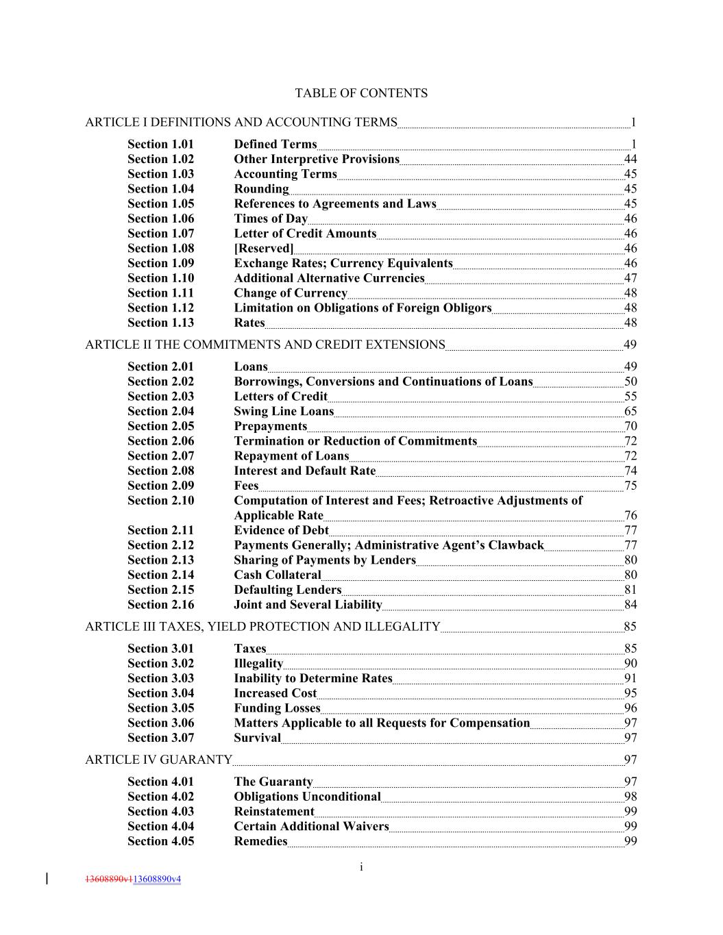 TABLE OF CONTENTS ARTICLE I DEFINITIONS AND ACCOUNTING TERMS 1 Section 1.01 Defined Terms 1 Section 1.02 Other Interpretive Provisions 44 Section 1.03 Accounting Terms 45 Section 1.04 Rounding 45 Section 1.05 References to Agreements and Laws 45 Section 1.06 Times of Day 46 Section 1.07 Letter of Credit Amounts 46 Section 1.08 [Reserved] 46 Section 1.09 Exchange Rates; Currency Equivalents 46 Section 1.10 Additional Alternative Currencies 47 Section 1.11 Change of Currency 48 Section 1.12 Limitation on Obligations of Foreign Obligors 48 Section 1.13 Rates 48 ARTICLE II THE COMMITMENTS AND CREDIT EXTENSIONS 49 Section 2.01 Loans 49 Section 2.02 Borrowings, Conversions and Continuations of Loans 50 Section 2.03 Letters of Credit 55 Section 2.04 Swing Line Loans 65 Section 2.05 Prepayments 70 Section 2.06 Termination or Reduction of Commitments 72 Section 2.07 Repayment of Loans 72 Section 2.08 Interest and Default Rate 74 Section 2.09 Fees 75 Section 2.10 Computation of Interest and Fees; Retroactive Adjustments of Applicable Rate 76 Section 2.11 Evidence of Debt 77 Section 2.12 Payments Generally; Administrative Agent’s Clawback 77 Section 2.13 Sharing of Payments by Lenders 80 Section 2.14 Cash Collateral 80 Section 2.15 Defaulting Lenders 81 Section 2.16 Joint and Several Liability 84 ARTICLE III TAXES, YIELD PROTECTION AND ILLEGALITY 85 Section 3.01 Taxes 85 Section 3.02 Illegality 90 Section 3.03 Inability to Determine Rates 91 Section 3.04 Increased Cost 95 Section 3.05 Funding Losses 96 Section 3.06 Matters Applicable to all Requests for Compensation 97 Section 3.07 Survival 97 ARTICLE IV GUARANTY 97 Section 4.01 The Guaranty 97 Section 4.02 Obligations Unconditional 98 Section 4.03 Reinstatement 99 Section 4.04 Certain Additional Waivers 99 Section 4.05 Remedies 99 i 13608890v113608890v4