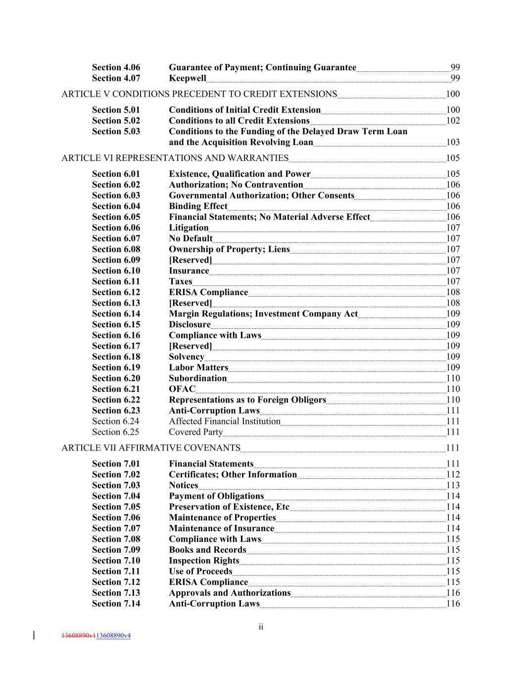 Section 4.06 Guarantee of Payment; Continuing Guarantee 99 Section 4.07 Keepwell 99 ARTICLE V CONDITIONS PRECEDENT TO CREDIT EXTENSIONS 100 Section 5.01 Conditions of Initial Credit Extension 100 Section 5.02 Conditions to all Credit Extensions 102 Section 5.03 Conditions to the Funding of the Delayed Draw Term Loan and the Acquisition Revolving Loan 103 ARTICLE VI REPRESENTATIONS AND WARRANTIES 105 Section 6.01 Existence, Qualification and Power 105 Section 6.02 Authorization; No Contravention 106 Section 6.03 Governmental Authorization; Other Consents 106 Section 6.04 Binding Effect 106 Section 6.05 Financial Statements; No Material Adverse Effect 106 Section 6.06 Litigation 107 Section 6.07 No Default 107 Section 6.08 Ownership of Property; Liens 107 Section 6.09 [Reserved] 107 Section 6.10 Insurance 107 Section 6.11 Taxes 107 Section 6.12 ERISA Compliance 108 Section 6.13 [Reserved] 108 Section 6.14 Margin Regulations; Investment Company Act 109 Section 6.15 Disclosure 109 Section 6.16 Compliance with Laws 109 Section 6.17 [Reserved] 109 Section 6.18 Solvency 109 Section 6.19 Labor Matters 109 Section 6.20 Subordination 110 Section 6.21 OFAC 110 Section 6.22 Representations as to Foreign Obligors 110 Section 6.23 Anti-Corruption Laws 111 Section 6.24 Affected Financial Institution 111 Section 6.25 Covered Party 111 ARTICLE VII AFFIRMATIVE COVENANTS 111 Section 7.01 Financial Statements 111 Section 7.02 Certificates; Other Information 112 Section 7.03 Notices 113 Section 7.04 Payment of Obligations 114 Section 7.05 Preservation of Existence, Etc 114 Section 7.06 Maintenance of Properties 114 Section 7.07 Maintenance of Insurance 114 Section 7.08 Compliance with Laws 115 Section 7.09 Books and Records 115 Section 7.10 Inspection Rights 115 Section 7.11 Use of Proceeds 115 Section 7.12 ERISA Compliance 115 Section 7.13 Approvals and Authorizations 116 Section 7.14 Anti-Corruption Laws 116 ii 13608890v113608890v4
