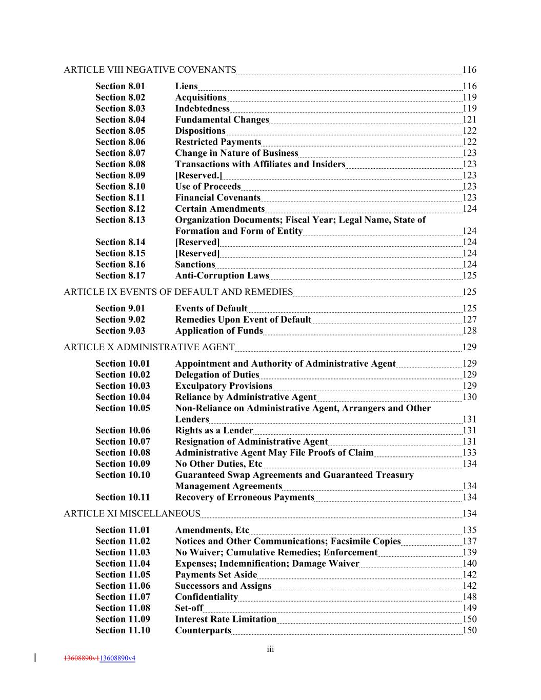 ARTICLE VIII NEGATIVE COVENANTS 116 Section 8.01 Liens 116 Section 8.02 Acquisitions 119 Section 8.03 Indebtedness 119 Section 8.04 Fundamental Changes 121 Section 8.05 Dispositions 122 Section 8.06 Restricted Payments 122 Section 8.07 Change in Nature of Business 123 Section 8.08 Transactions with Affiliates and Insiders 123 Section 8.09 [Reserved.] 123 Section 8.10 Use of Proceeds 123 Section 8.11 Financial Covenants 123 Section 8.12 Certain Amendments 124 Section 8.13 Organization Documents; Fiscal Year; Legal Name, State of Formation and Form of Entity 124 Section 8.14 [Reserved] 124 Section 8.15 [Reserved] 124 Section 8.16 Sanctions 124 Section 8.17 Anti-Corruption Laws 125 ARTICLE IX EVENTS OF DEFAULT AND REMEDIES 125 Section 9.01 Events of Default 125 Section 9.02 Remedies Upon Event of Default 127 Section 9.03 Application of Funds 128 ARTICLE X ADMINISTRATIVE AGENT 129 Section 10.01 Appointment and Authority of Administrative Agent 129 Section 10.02 Delegation of Duties 129 Section 10.03 Exculpatory Provisions 129 Section 10.04 Reliance by Administrative Agent 130 Section 10.05 Non-Reliance on Administrative Agent, Arrangers and Other Lenders 131 Section 10.06 Rights as a Lender 131 Section 10.07 Resignation of Administrative Agent 131 Section 10.08 Administrative Agent May File Proofs of Claim 133 Section 10.09 No Other Duties, Etc 134 Section 10.10 Guaranteed Swap Agreements and Guaranteed Treasury Management Agreements 134 Section 10.11 Recovery of Erroneous Payments 134 ARTICLE XI MISCELLANEOUS 134 Section 11.01 Amendments, Etc 135 Section 11.02 Notices and Other Communications; Facsimile Copies 137 Section 11.03 No Waiver; Cumulative Remedies; Enforcement 139 Section 11.04 Expenses; Indemnification; Damage Waiver 140 Section 11.05 Payments Set Aside 142 Section 11.06 Successors and Assigns 142 Section 11.07 Confidentiality 148 Section 11.08 Set-off 149 Section 11.09 Interest Rate Limitation 150 Section 11.10 Counterparts 150 iii 13608890v113608890v4