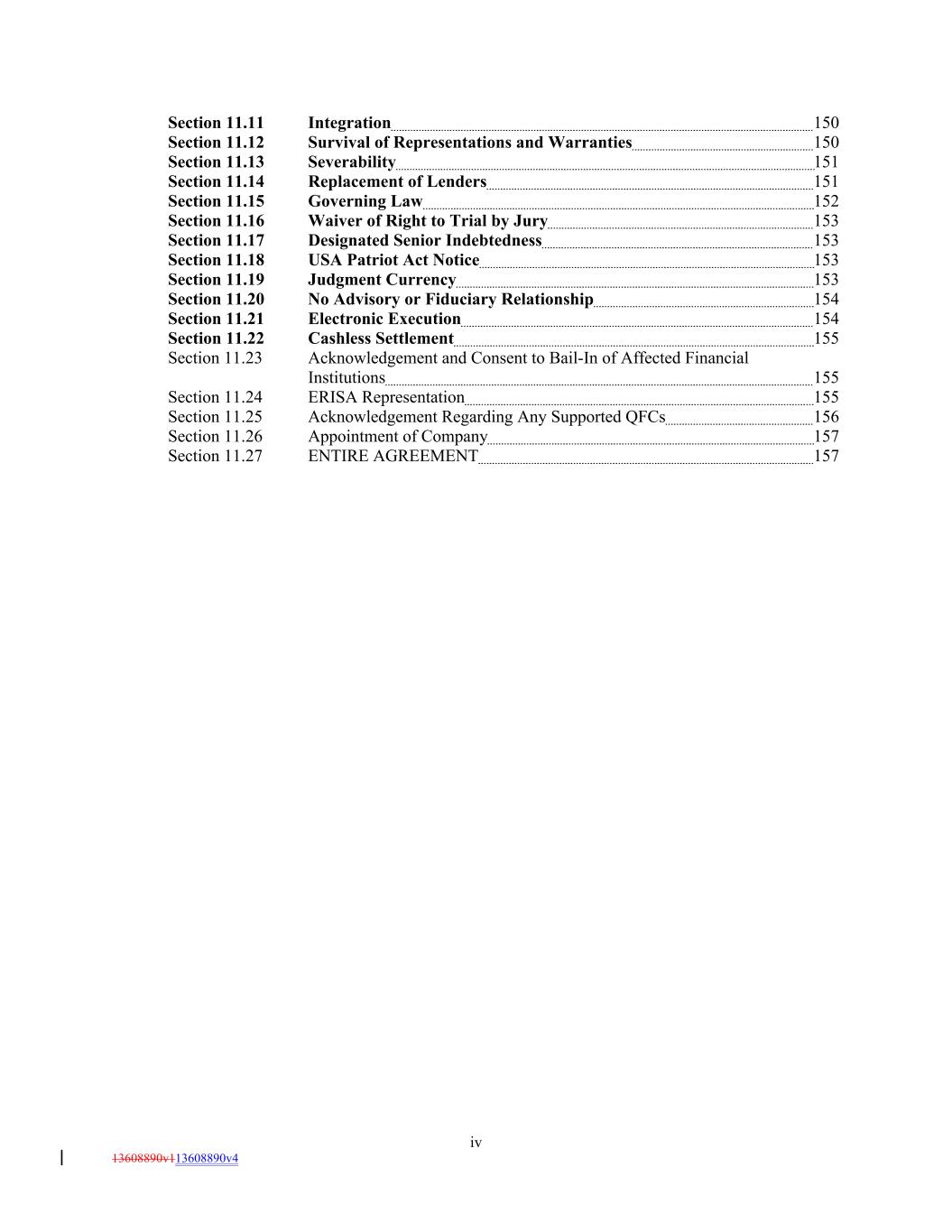 Section 11.11 Integration 150 Section 11.12 Survival of Representations and Warranties 150 Section 11.13 Severability 151 Section 11.14 Replacement of Lenders 151 Section 11.15 Governing Law 152 Section 11.16 Waiver of Right to Trial by Jury 153 Section 11.17 Designated Senior Indebtedness 153 Section 11.18 USA Patriot Act Notice 153 Section 11.19 Judgment Currency 153 Section 11.20 No Advisory or Fiduciary Relationship 154 Section 11.21 Electronic Execution 154 Section 11.22 Cashless Settlement 155 Section 11.23 Acknowledgement and Consent to Bail-In of Affected Financial Institutions 155 Section 11.24 ERISA Representation 155 Section 11.25 Acknowledgement Regarding Any Supported QFCs 156 Section 11.26 Appointment of Company 157 Section 11.27 ENTIRE AGREEMENT 157 iv 13608890v113608890v4