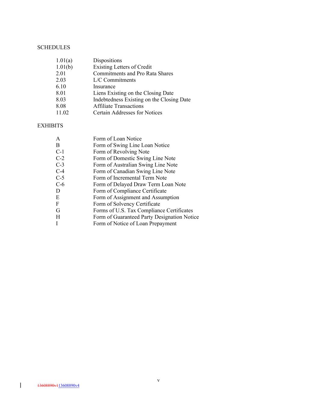 SCHEDULES 1.01(a) Dispositions 1.01(b) Existing Letters of Credit 2.01 Commitments and Pro Rata Shares 2.03 L/C Commitments 6.10 Insurance 8.01 Liens Existing on the Closing Date 8.03 Indebtedness Existing on the Closing Date 8.08 Affiliate Transactions 11.02 Certain Addresses for Notices EXHIBITS A Form of Loan Notice B Form of Swing Line Loan Notice C-1 Form of Revolving Note C-2 Form of Domestic Swing Line Note C-3 Form of Australian Swing Line Note C-4 Form of Canadian Swing Line Note C-5 Form of Incremental Term Note C-6 Form of Delayed Draw Term Loan Note D Form of Compliance Certificate E Form of Assignment and Assumption F Form of Solvency Certificate G Forms of U.S. Tax Compliance Certificates H Form of Guaranteed Party Designation Notice I Form of Notice of Loan Prepayment v 13608890v113608890v4