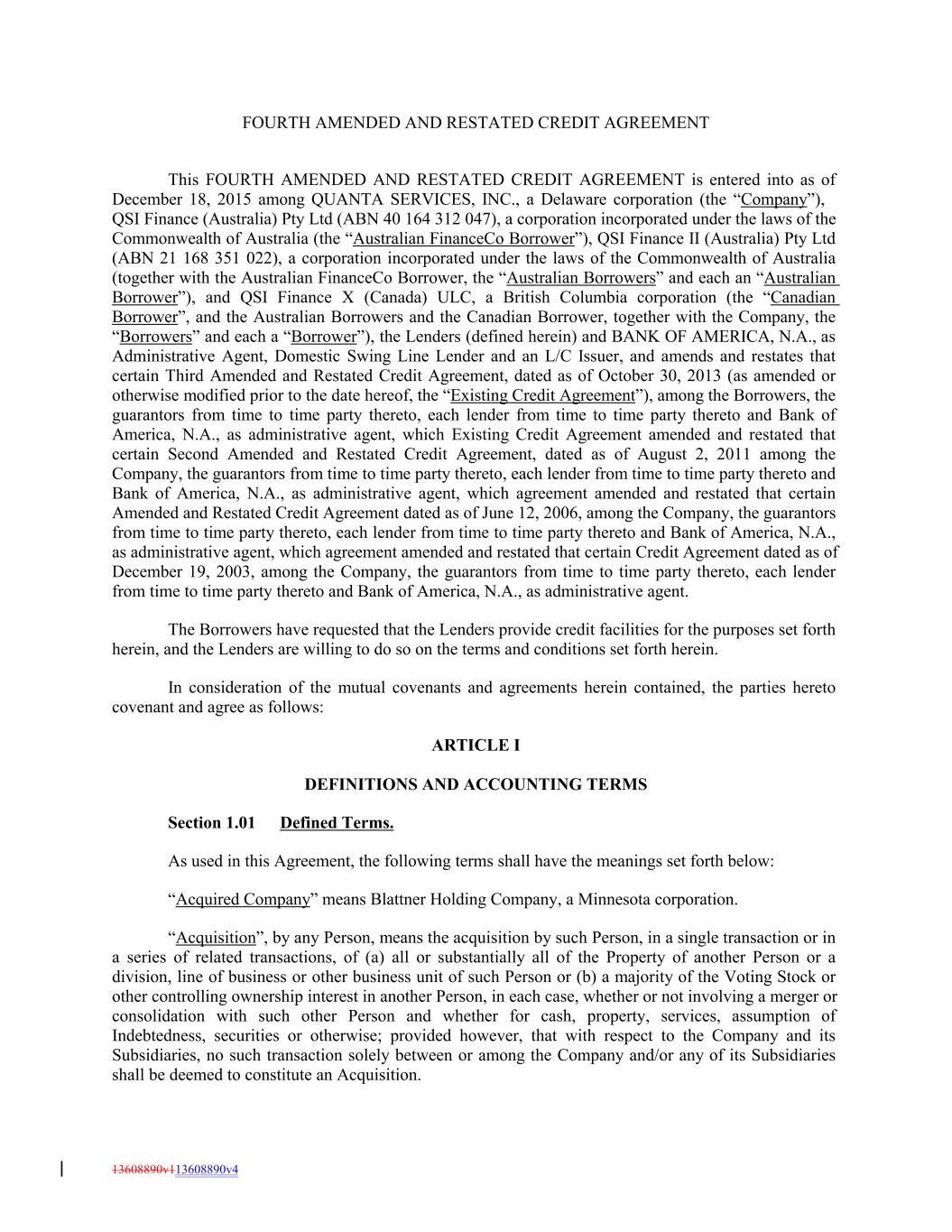 FOURTH AMENDED AND RESTATED CREDIT AGREEMENT This FOURTH AMENDED AND RESTATED CREDIT AGREEMENT is entered into as of December 18, 2015 among QUANTA SERVICES, INC., a Delaware corporation (the “Company”), QSI Finance (Australia) Pty Ltd (ABN 40 164 312 047), a corporation incorporated under the laws of the Commonwealth of Australia (the “Australian FinanceCo Borrower”), QSI Finance II (Australia) Pty Ltd (ABN 21 168 351 022), a corporation incorporated under the laws of the Commonwealth of Australia (together with the Australian FinanceCo Borrower, the “Australian Borrowers” and each an “Australian Borrower”), and QSI Finance X (Canada) ULC, a British Columbia corporation (the “Canadian Borrower”, and the Australian Borrowers and the Canadian Borrower, together with the Company, the “Borrowers” and each a “Borrower”), the Lenders (defined herein) and BANK OF AMERICA, N.A., as Administrative Agent, Domestic Swing Line Lender and an L/C Issuer, and amends and restates that certain Third Amended and Restated Credit Agreement, dated as of October 30, 2013 (as amended or otherwise modified prior to the date hereof, the “Existing Credit Agreement”), among the Borrowers, the guarantors from time to time party thereto, each lender from time to time party thereto and Bank of America, N.A., as administrative agent, which Existing Credit Agreement amended and restated that certain Second Amended and Restated Credit Agreement, dated as of August 2, 2011 among the Company, the guarantors from time to time party thereto, each lender from time to time party thereto and Bank of America, N.A., as administrative agent, which agreement amended and restated that certain Amended and Restated Credit Agreement dated as of June 12, 2006, among the Company, the guarantors from time to time party thereto, each lender from time to time party thereto and Bank of America, N.A., as administrative agent, which agreement amended and restated that certain Credit Agreement dated as of December 19, 2003, among the Company, the guarantors from time to time party thereto, each lender from time to time party thereto and Bank of America, N.A., as administrative agent. The Borrowers have requested that the Lenders provide credit facilities for the purposes set forth herein, and the Lenders are willing to do so on the terms and conditions set forth herein. In consideration of the mutual covenants and agreements herein contained, the parties hereto covenant and agree as follows: ARTICLE I DEFINITIONS AND ACCOUNTING TERMS Section 1.01 Defined Terms. As used in this Agreement, the following terms shall have the meanings set forth below: “Acquired Company” means Blattner Holding Company, a Minnesota corporation. “Acquisition”, by any Person, means the acquisition by such Person, in a single transaction or in a series of related transactions, of (a) all or substantially all of the Property of another Person or a division, line of business or other business unit of such Person or (b) a majority of the Voting Stock or other controlling ownership interest in another Person, in each case, whether or not involving a merger or consolidation with such other Person and whether for cash, property, services, assumption of Indebtedness, securities or otherwise; provided however, that with respect to the Company and its Subsidiaries, no such transaction solely between or among the Company and/or any of its Subsidiaries shall be deemed to constitute an Acquisition. 13608890v113608890v4