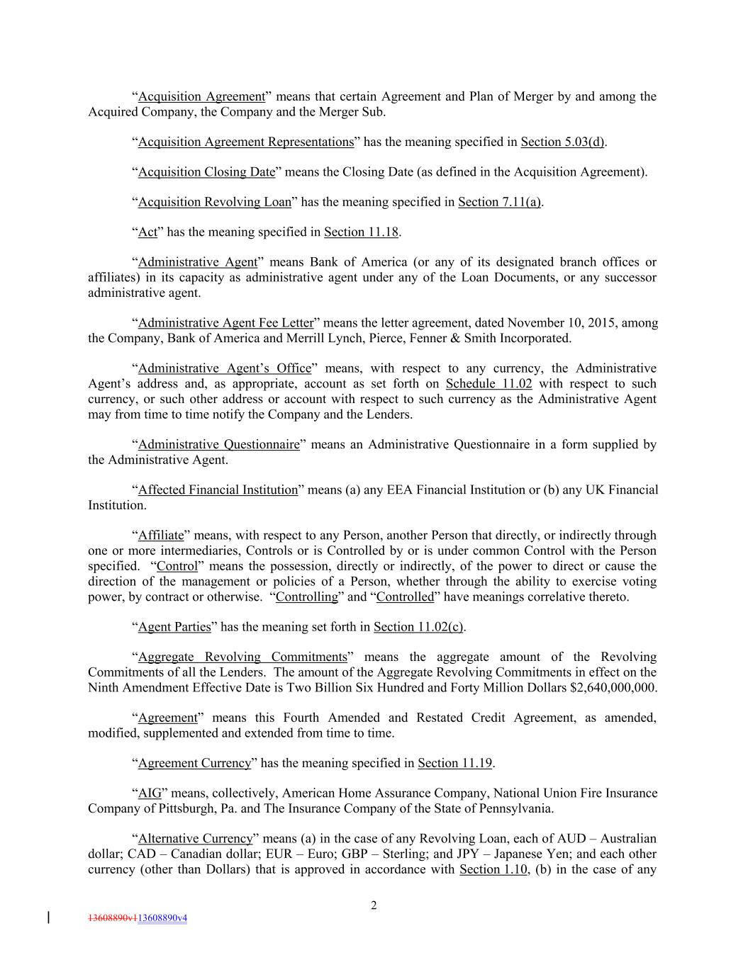 “Acquisition Agreement” means that certain Agreement and Plan of Merger by and among the Acquired Company, the Company and the Merger Sub. “Acquisition Agreement Representations” has the meaning specified in Section 5.03(d). “Acquisition Closing Date” means the Closing Date (as defined in the Acquisition Agreement). “Acquisition Revolving Loan” has the meaning specified in Section 7.11(a). “Act” has the meaning specified in Section 11.18. “Administrative Agent” means Bank of America (or any of its designated branch offices or affiliates) in its capacity as administrative agent under any of the Loan Documents, or any successor administrative agent. “Administrative Agent Fee Letter” means the letter agreement, dated November 10, 2015, among the Company, Bank of America and Merrill Lynch, Pierce, Fenner & Smith Incorporated. “Administrative Agent’s Office” means, with respect to any currency, the Administrative Agent’s address and, as appropriate, account as set forth on Schedule 11.02 with respect to such currency, or such other address or account with respect to such currency as the Administrative Agent may from time to time notify the Company and the Lenders. “Administrative Questionnaire” means an Administrative Questionnaire in a form supplied by the Administrative Agent. “Affected Financial Institution” means (a) any EEA Financial Institution or (b) any UK Financial Institution. “Affiliate” means, with respect to any Person, another Person that directly, or indirectly through one or more intermediaries, Controls or is Controlled by or is under common Control with the Person specified. “Control” means the possession, directly or indirectly, of the power to direct or cause the direction of the management or policies of a Person, whether through the ability to exercise voting power, by contract or otherwise. “Controlling” and “Controlled” have meanings correlative thereto. “Agent Parties” has the meaning set forth in Section 11.02(c). “Aggregate Revolving Commitments” means the aggregate amount of the Revolving Commitments of all the Lenders. The amount of the Aggregate Revolving Commitments in effect on the Ninth Amendment Effective Date is Two Billion Six Hundred and Forty Million Dollars $2,640,000,000. “Agreement” means this Fourth Amended and Restated Credit Agreement, as amended, modified, supplemented and extended from time to time. “Agreement Currency” has the meaning specified in Section 11.19. “AIG” means, collectively, American Home Assurance Company, National Union Fire Insurance Company of Pittsburgh, Pa. and The Insurance Company of the State of Pennsylvania. “Alternative Currency” means (a) in the case of any Revolving Loan, each of AUD – Australian dollar; CAD – Canadian dollar; EUR – Euro; GBP – Sterling; and JPY – Japanese Yen; and each other currency (other than Dollars) that is approved in accordance with Section 1.10, (b) in the case of any 2 13608890v113608890v4