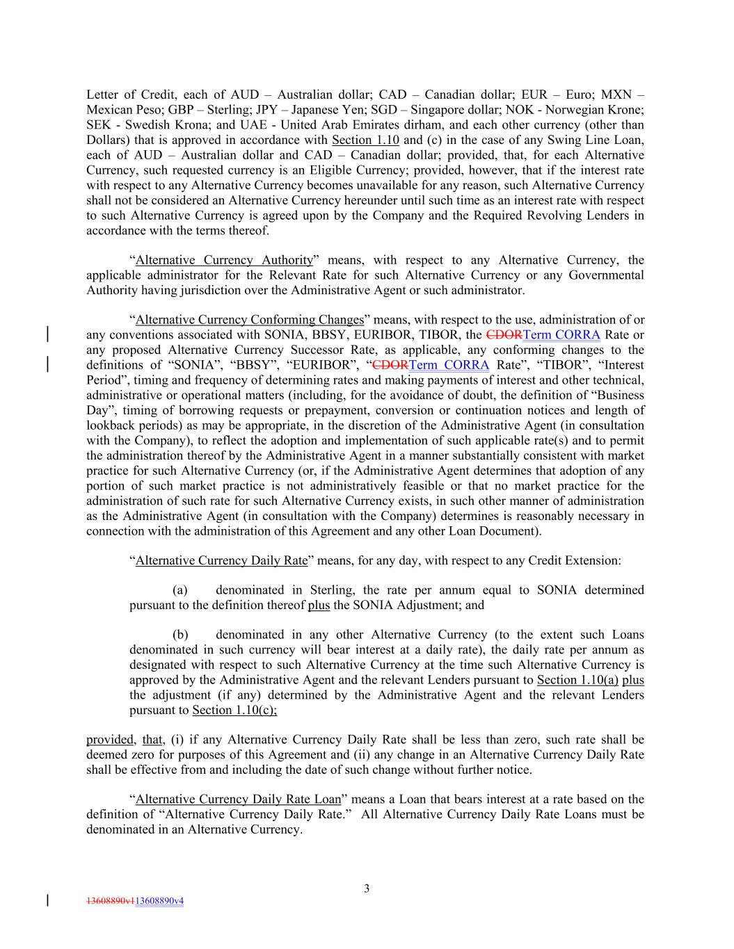 Letter of Credit, each of AUD – Australian dollar; CAD – Canadian dollar; EUR – Euro; MXN – Mexican Peso; GBP – Sterling; JPY – Japanese Yen; SGD – Singapore dollar; NOK - Norwegian Krone; SEK - Swedish Krona; and UAE - United Arab Emirates dirham, and each other currency (other than Dollars) that is approved in accordance with Section 1.10 and (c) in the case of any Swing Line Loan, each of AUD – Australian dollar and CAD – Canadian dollar; provided, that, for each Alternative Currency, such requested currency is an Eligible Currency; provided, however, that if the interest rate with respect to any Alternative Currency becomes unavailable for any reason, such Alternative Currency shall not be considered an Alternative Currency hereunder until such time as an interest rate with respect to such Alternative Currency is agreed upon by the Company and the Required Revolving Lenders in accordance with the terms thereof. “Alternative Currency Authority” means, with respect to any Alternative Currency, the applicable administrator for the Relevant Rate for such Alternative Currency or any Governmental Authority having jurisdiction over the Administrative Agent or such administrator. “Alternative Currency Conforming Changes” means, with respect to the use, administration of or any conventions associated with SONIA, BBSY, EURIBOR, TIBOR, the CDORTerm CORRA Rate or any proposed Alternative Currency Successor Rate, as applicable, any conforming changes to the definitions of “SONIA”, “BBSY”, “EURIBOR”, “CDORTerm CORRA Rate”, “TIBOR”, “Interest Period”, timing and frequency of determining rates and making payments of interest and other technical, administrative or operational matters (including, for the avoidance of doubt, the definition of “Business Day”, timing of borrowing requests or prepayment, conversion or continuation notices and length of lookback periods) as may be appropriate, in the discretion of the Administrative Agent (in consultation with the Company), to reflect the adoption and implementation of such applicable rate(s) and to permit the administration thereof by the Administrative Agent in a manner substantially consistent with market practice for such Alternative Currency (or, if the Administrative Agent determines that adoption of any portion of such market practice is not administratively feasible or that no market practice for the administration of such rate for such Alternative Currency exists, in such other manner of administration as the Administrative Agent (in consultation with the Company) determines is reasonably necessary in connection with the administration of this Agreement and any other Loan Document). “Alternative Currency Daily Rate” means, for any day, with respect to any Credit Extension: (a) denominated in Sterling, the rate per annum equal to SONIA determined pursuant to the definition thereof plus the SONIA Adjustment; and (b) denominated in any other Alternative Currency (to the extent such Loans denominated in such currency will bear interest at a daily rate), the daily rate per annum as designated with respect to such Alternative Currency at the time such Alternative Currency is approved by the Administrative Agent and the relevant Lenders pursuant to Section 1.10(a) plus the adjustment (if any) determined by the Administrative Agent and the relevant Lenders pursuant to Section 1.10(c); provided, that, (i) if any Alternative Currency Daily Rate shall be less than zero, such rate shall be deemed zero for purposes of this Agreement and (ii) any change in an Alternative Currency Daily Rate shall be effective from and including the date of such change without further notice. “Alternative Currency Daily Rate Loan” means a Loan that bears interest at a rate based on the definition of “Alternative Currency Daily Rate.” All Alternative Currency Daily Rate Loans must be denominated in an Alternative Currency. 3 13608890v113608890v4