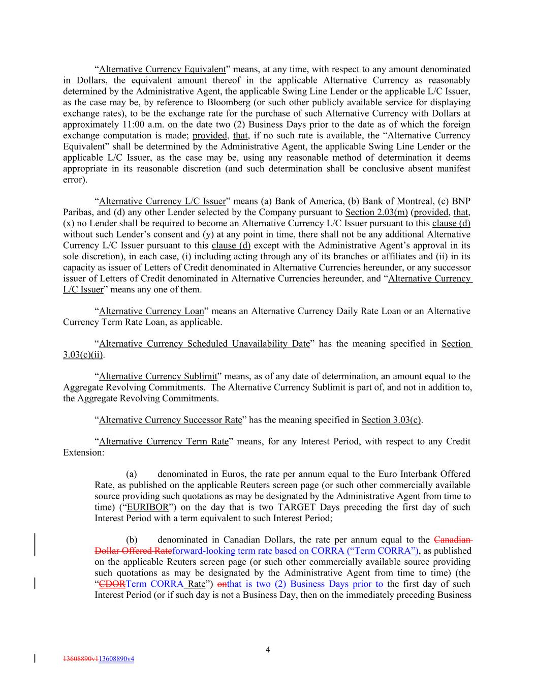 “Alternative Currency Equivalent” means, at any time, with respect to any amount denominated in Dollars, the equivalent amount thereof in the applicable Alternative Currency as reasonably determined by the Administrative Agent, the applicable Swing Line Lender or the applicable L/C Issuer, as the case may be, by reference to Bloomberg (or such other publicly available service for displaying exchange rates), to be the exchange rate for the purchase of such Alternative Currency with Dollars at approximately 11:00 a.m. on the date two (2) Business Days prior to the date as of which the foreign exchange computation is made; provided, that, if no such rate is available, the “Alternative Currency Equivalent” shall be determined by the Administrative Agent, the applicable Swing Line Lender or the applicable L/C Issuer, as the case may be, using any reasonable method of determination it deems appropriate in its reasonable discretion (and such determination shall be conclusive absent manifest error). “Alternative Currency L/C Issuer” means (a) Bank of America, (b) Bank of Montreal, (c) BNP Paribas, and (d) any other Lender selected by the Company pursuant to Section 2.03(m) (provided, that, (x) no Lender shall be required to become an Alternative Currency L/C Issuer pursuant to this clause (d) without such Lender’s consent and (y) at any point in time, there shall not be any additional Alternative Currency L/C Issuer pursuant to this clause (d) except with the Administrative Agent’s approval in its sole discretion), in each case, (i) including acting through any of its branches or affiliates and (ii) in its capacity as issuer of Letters of Credit denominated in Alternative Currencies hereunder, or any successor issuer of Letters of Credit denominated in Alternative Currencies hereunder, and “Alternative Currency L/C Issuer” means any one of them. “Alternative Currency Loan” means an Alternative Currency Daily Rate Loan or an Alternative Currency Term Rate Loan, as applicable. “Alternative Currency Scheduled Unavailability Date” has the meaning specified in Section 3.03(c)(ii). “Alternative Currency Sublimit” means, as of any date of determination, an amount equal to the Aggregate Revolving Commitments. The Alternative Currency Sublimit is part of, and not in addition to, the Aggregate Revolving Commitments. “Alternative Currency Successor Rate” has the meaning specified in Section 3.03(c). “Alternative Currency Term Rate” means, for any Interest Period, with respect to any Credit Extension: (a) denominated in Euros, the rate per annum equal to the Euro Interbank Offered Rate, as published on the applicable Reuters screen page (or such other commercially available source providing such quotations as may be designated by the Administrative Agent from time to time) (“EURIBOR”) on the day that is two TARGET Days preceding the first day of such Interest Period with a term equivalent to such Interest Period; (b) denominated in Canadian Dollars, the rate per annum equal to the Canadian Dollar Offered Rateforward-looking term rate based on CORRA (“Term CORRA”), as published on the applicable Reuters screen page (or such other commercially available source providing such quotations as may be designated by the Administrative Agent from time to time) (the “CDORTerm CORRA Rate”) onthat is two (2) Business Days prior to the first day of such Interest Period (or if such day is not a Business Day, then on the immediately preceding Business 4 13608890v113608890v4