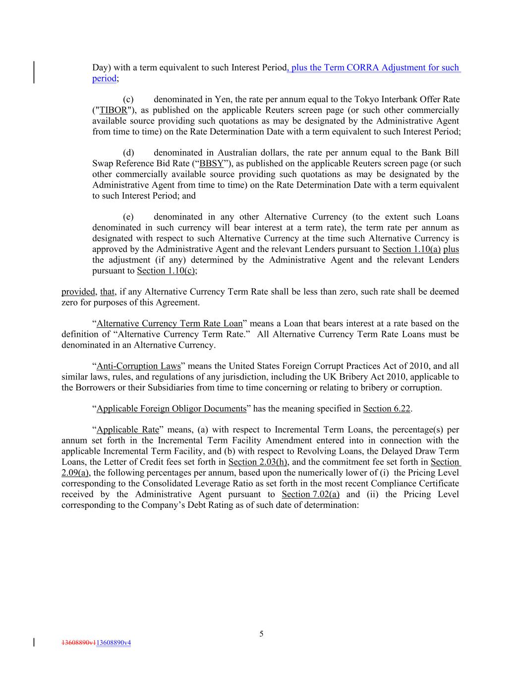 Day) with a term equivalent to such Interest Period, plus the Term CORRA Adjustment for such period; (c) denominated in Yen, the rate per annum equal to the Tokyo Interbank Offer Rate ("TIBOR"), as published on the applicable Reuters screen page (or such other commercially available source providing such quotations as may be designated by the Administrative Agent from time to time) on the Rate Determination Date with a term equivalent to such Interest Period; (d) denominated in Australian dollars, the rate per annum equal to the Bank Bill Swap Reference Bid Rate (“BBSY”), as published on the applicable Reuters screen page (or such other commercially available source providing such quotations as may be designated by the Administrative Agent from time to time) on the Rate Determination Date with a term equivalent to such Interest Period; and (e) denominated in any other Alternative Currency (to the extent such Loans denominated in such currency will bear interest at a term rate), the term rate per annum as designated with respect to such Alternative Currency at the time such Alternative Currency is approved by the Administrative Agent and the relevant Lenders pursuant to Section 1.10(a) plus the adjustment (if any) determined by the Administrative Agent and the relevant Lenders pursuant to Section 1.10(c); provided, that, if any Alternative Currency Term Rate shall be less than zero, such rate shall be deemed zero for purposes of this Agreement. “Alternative Currency Term Rate Loan” means a Loan that bears interest at a rate based on the definition of “Alternative Currency Term Rate.” All Alternative Currency Term Rate Loans must be denominated in an Alternative Currency. “Anti-Corruption Laws” means the United States Foreign Corrupt Practices Act of 2010, and all similar laws, rules, and regulations of any jurisdiction, including the UK Bribery Act 2010, applicable to the Borrowers or their Subsidiaries from time to time concerning or relating to bribery or corruption. “Applicable Foreign Obligor Documents” has the meaning specified in Section 6.22. “Applicable Rate” means, (a) with respect to Incremental Term Loans, the percentage(s) per annum set forth in the Incremental Term Facility Amendment entered into in connection with the applicable Incremental Term Facility, and (b) with respect to Revolving Loans, the Delayed Draw Term Loans, the Letter of Credit fees set forth in Section 2.03(h), and the commitment fee set forth in Section 2.09(a), the following percentages per annum, based upon the numerically lower of (i) the Pricing Level corresponding to the Consolidated Leverage Ratio as set forth in the most recent Compliance Certificate received by the Administrative Agent pursuant to Section 7.02(a) and (ii) the Pricing Level corresponding to the Company’s Debt Rating as of such date of determination: 5 13608890v113608890v4