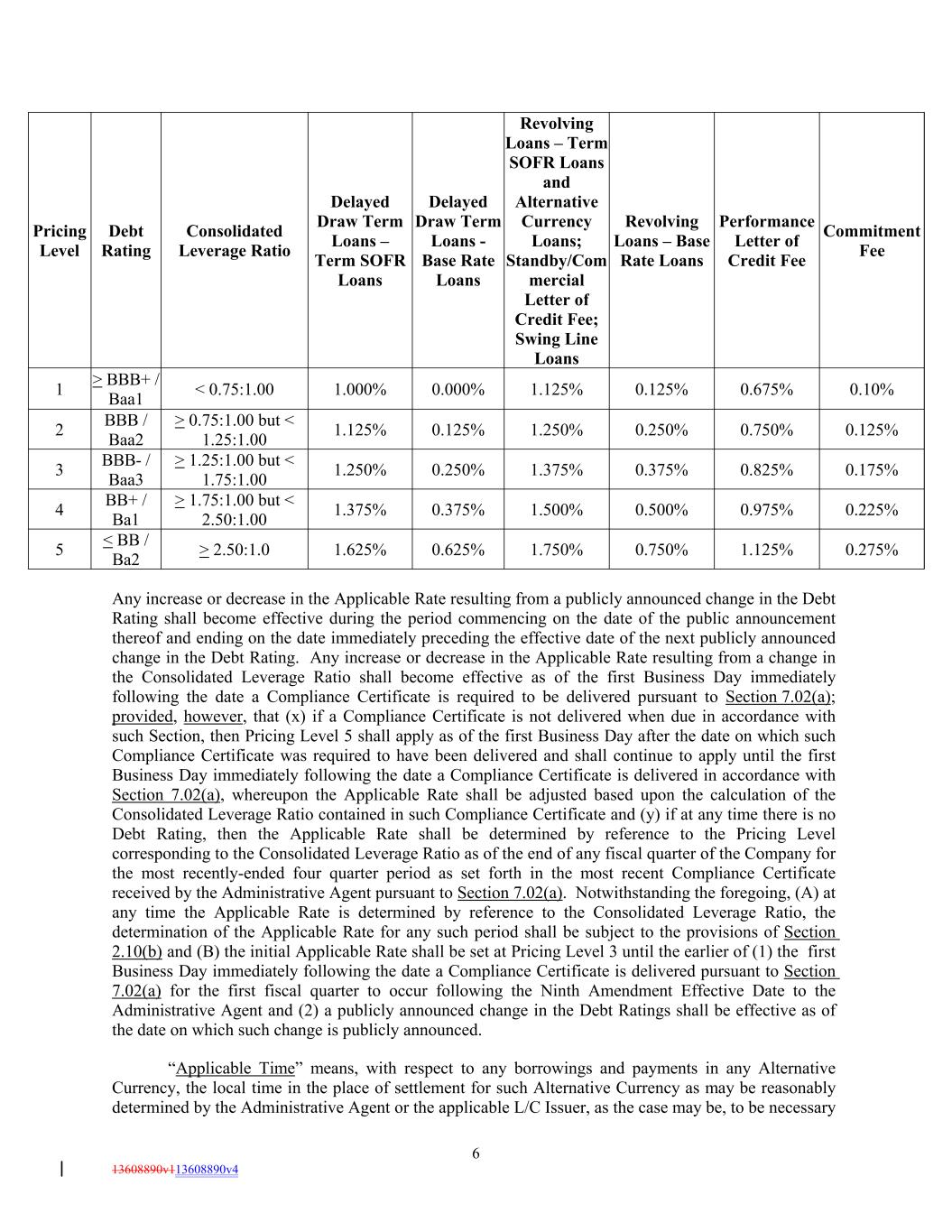 6 13608890v113608890v4 1.000% 3 Revolving Loans – Term SOFR Loans and Alternative Currency Loans; Standby/Com mercial Letter of Credit Fee; Swing Line Loans BBB- / Baa3 0.000% > 1.25:1.00 but < 1.75:1.00 Debt Rating 1.250% 1.125% 0.250% Revolving Loans – Base Rate Loans 1.375% 0.125% 0.375% 0.825% 0.675% 0.175% Performance Letter of Credit Fee 0.10% 4 Consolidated Leverage Ratio BB+ / Ba1 > 1.75:1.00 but < 2.50:1.00 Commitment Fee 1.375% 2 0.375% 1.500% BBB / Baa2 0.500% 0.975% > 0.75:1.00 but < 1.25:1.00 0.225% Delayed Draw Term Loans – Term SOFR Loans 1.125% 5 1 < BB / Ba2 0.125% > 2.50:1.0 Pricing Level 1.625% 1.250% 0.625% > BBB+ / Baa1 1.750% 0.250% 0.750% Delayed Draw Term Loans - Base Rate Loans 1.125% 0.750% 0.275% < 0.75:1.00 Any increase or decrease in the Applicable Rate resulting from a publicly announced change in the Debt Rating shall become effective during the period commencing on the date of the public announcement thereof and ending on the date immediately preceding the effective date of the next publicly announced change in the Debt Rating. Any increase or decrease in the Applicable Rate resulting from a change in the Consolidated Leverage Ratio shall become effective as of the first Business Day immediately following the date a Compliance Certificate is required to be delivered pursuant to Section 7.02(a); provided, however, that (x) if a Compliance Certificate is not delivered when due in accordance with such Section, then Pricing Level 5 shall apply as of the first Business Day after the date on which such Compliance Certificate was required to have been delivered and shall continue to apply until the first Business Day immediately following the date a Compliance Certificate is delivered in accordance with Section 7.02(a), whereupon the Applicable Rate shall be adjusted based upon the calculation of the Consolidated Leverage Ratio contained in such Compliance Certificate and (y) if at any time there is no Debt Rating, then the Applicable Rate shall be determined by reference to the Pricing Level corresponding to the Consolidated Leverage Ratio as of the end of any fiscal quarter of the Company for the most recently-ended four quarter period as set forth in the most recent Compliance Certificate received by the Administrative Agent pursuant to Section 7.02(a). Notwithstanding the foregoing, (A) at any time the Applicable Rate is determined by reference to the Consolidated Leverage Ratio, the determination of the Applicable Rate for any such period shall be subject to the provisions of Section 2.10(b) and (B) the initial Applicable Rate shall be set at Pricing Level 3 until the earlier of (1) the first Business Day immediately following the date a Compliance Certificate is delivered pursuant to Section 7.02(a) for the first fiscal quarter to occur following the Ninth Amendment Effective Date to the Administrative Agent and (2) a publicly announced change in the Debt Ratings shall be effective as of the date on which such change is publicly announced. “Applicable Time” means, with respect to any borrowings and payments in any Alternative Currency, the local time in the place of settlement for such Alternative Currency as may be reasonably determined by the Administrative Agent or the applicable L/C Issuer, as the case may be, to be necessary 0.125%