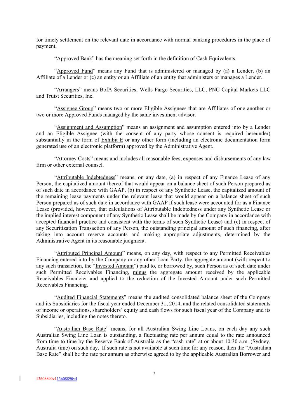 for timely settlement on the relevant date in accordance with normal banking procedures in the place of payment. “Approved Bank” has the meaning set forth in the definition of Cash Equivalents. “Approved Fund” means any Fund that is administered or managed by (a) a Lender, (b) an Affiliate of a Lender or (c) an entity or an Affiliate of an entity that administers or manages a Lender. “Arrangers” means BofA Securities, Wells Fargo Securities, LLC, PNC Capital Markets LLC and Truist Securities, Inc. “Assignee Group” means two or more Eligible Assignees that are Affiliates of one another or two or more Approved Funds managed by the same investment advisor. “Assignment and Assumption” means an assignment and assumption entered into by a Lender and an Eligible Assignee (with the consent of any party whose consent is required hereunder) substantially in the form of Exhibit E or any other form (including an electronic documentation form generated use of an electronic platform) approved by the Administrative Agent. “Attorney Costs” means and includes all reasonable fees, expenses and disbursements of any law firm or other external counsel. “Attributable Indebtedness” means, on any date, (a) in respect of any Finance Lease of any Person, the capitalized amount thereof that would appear on a balance sheet of such Person prepared as of such date in accordance with GAAP, (b) in respect of any Synthetic Lease, the capitalized amount of the remaining lease payments under the relevant lease that would appear on a balance sheet of such Person prepared as of such date in accordance with GAAP if such lease were accounted for as a Finance Lease (provided, however, that calculations of Attributable Indebtedness under any Synthetic Lease or the implied interest component of any Synthetic Lease shall be made by the Company in accordance with accepted financial practice and consistent with the terms of such Synthetic Lease) and (c) in respect of any Securitization Transaction of any Person, the outstanding principal amount of such financing, after taking into account reserve accounts and making appropriate adjustments, determined by the Administrative Agent in its reasonable judgment. “Attributed Principal Amount” means, on any day, with respect to any Permitted Receivables Financing entered into by the Company or any other Loan Party, the aggregate amount (with respect to any such transaction, the “Invested Amount”) paid to, or borrowed by, such Person as of such date under such Permitted Receivables Financing, minus the aggregate amount received by the applicable Receivables Financier and applied to the reduction of the Invested Amount under such Permitted Receivables Financing. “Audited Financial Statements” means the audited consolidated balance sheet of the Company and its Subsidiaries for the fiscal year ended December 31, 2014, and the related consolidated statements of income or operations, shareholders’ equity and cash flows for such fiscal year of the Company and its Subsidiaries, including the notes thereto. “Australian Base Rate” means, for all Australian Swing Line Loans, on each day any such Australian Swing Line Loan is outstanding, a fluctuating rate per annum equal to the rate announced from time to time by the Reserve Bank of Australia as the “cash rate” at or about 10:30 a.m. (Sydney, Australia time) on such day. If such rate is not available at such time for any reason, then the “Australian Base Rate” shall be the rate per annum as otherwise agreed to by the applicable Australian Borrower and 7 13608890v113608890v4