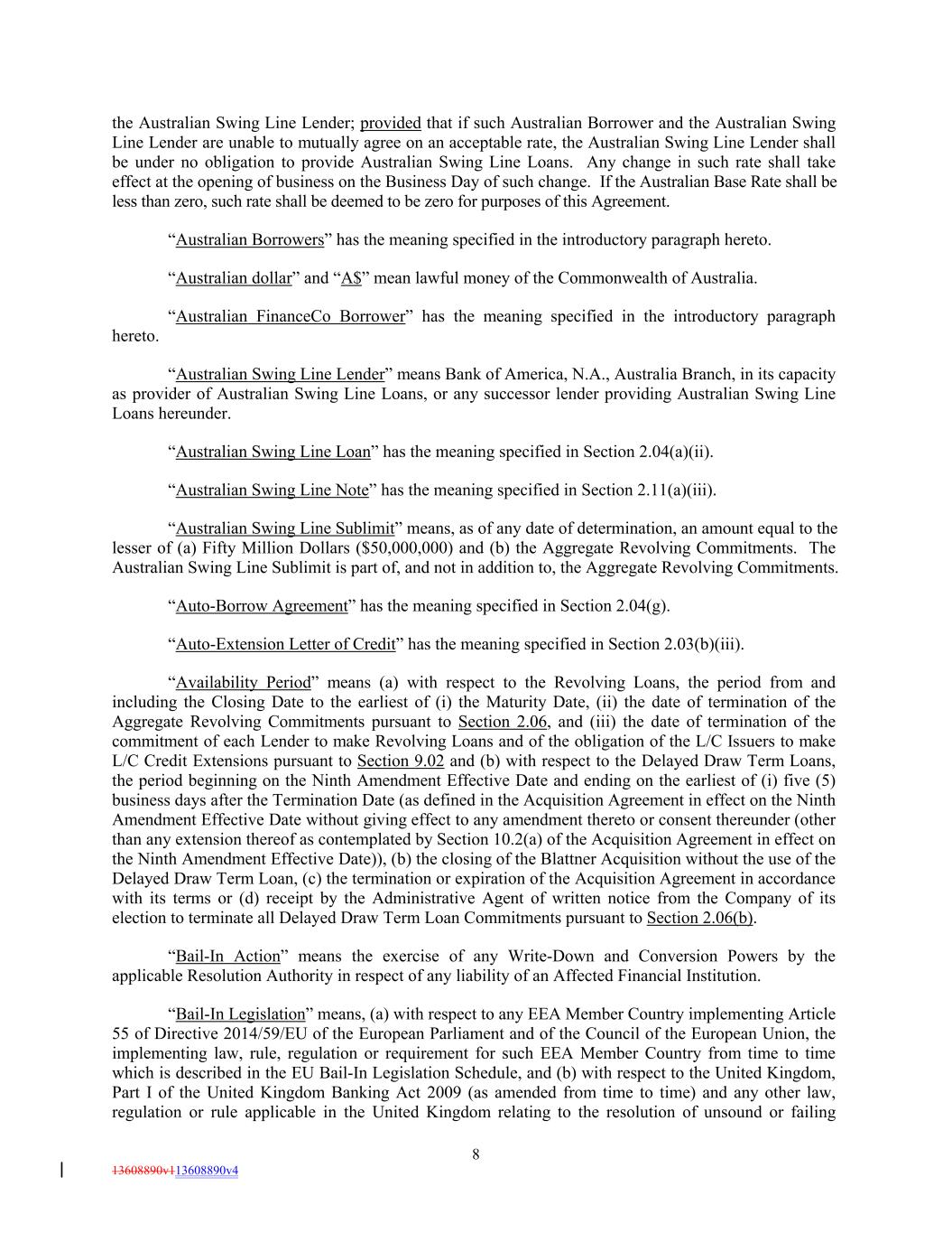 the Australian Swing Line Lender; provided that if such Australian Borrower and the Australian Swing Line Lender are unable to mutually agree on an acceptable rate, the Australian Swing Line Lender shall be under no obligation to provide Australian Swing Line Loans. Any change in such rate shall take effect at the opening of business on the Business Day of such change. If the Australian Base Rate shall be less than zero, such rate shall be deemed to be zero for purposes of this Agreement. “Australian Borrowers” has the meaning specified in the introductory paragraph hereto. “Australian dollar” and “A$” mean lawful money of the Commonwealth of Australia. “Australian FinanceCo Borrower” has the meaning specified in the introductory paragraph hereto. “Australian Swing Line Lender” means Bank of America, N.A., Australia Branch, in its capacity as provider of Australian Swing Line Loans, or any successor lender providing Australian Swing Line Loans hereunder. “Australian Swing Line Loan” has the meaning specified in Section 2.04(a)(ii). “Australian Swing Line Note” has the meaning specified in Section 2.11(a)(iii). “Australian Swing Line Sublimit” means, as of any date of determination, an amount equal to the lesser of (a) Fifty Million Dollars ($50,000,000) and (b) the Aggregate Revolving Commitments. The Australian Swing Line Sublimit is part of, and not in addition to, the Aggregate Revolving Commitments. “Auto-Borrow Agreement” has the meaning specified in Section 2.04(g). “Auto-Extension Letter of Credit” has the meaning specified in Section 2.03(b)(iii). “Availability Period” means (a) with respect to the Revolving Loans, the period from and including the Closing Date to the earliest of (i) the Maturity Date, (ii) the date of termination of the Aggregate Revolving Commitments pursuant to Section 2.06, and (iii) the date of termination of the commitment of each Lender to make Revolving Loans and of the obligation of the L/C Issuers to make L/C Credit Extensions pursuant to Section 9.02 and (b) with respect to the Delayed Draw Term Loans, the period beginning on the Ninth Amendment Effective Date and ending on the earliest of (i) five (5) business days after the Termination Date (as defined in the Acquisition Agreement in effect on the Ninth Amendment Effective Date without giving effect to any amendment thereto or consent thereunder (other than any extension thereof as contemplated by Section 10.2(a) of the Acquisition Agreement in effect on the Ninth Amendment Effective Date)), (b) the closing of the Blattner Acquisition without the use of the Delayed Draw Term Loan, (c) the termination or expiration of the Acquisition Agreement in accordance with its terms or (d) receipt by the Administrative Agent of written notice from the Company of its election to terminate all Delayed Draw Term Loan Commitments pursuant to Section 2.06(b). “Bail-In Action” means the exercise of any Write-Down and Conversion Powers by the applicable Resolution Authority in respect of any liability of an Affected Financial Institution. “Bail-In Legislation” means, (a) with respect to any EEA Member Country implementing Article 55 of Directive 2014/59/EU of the European Parliament and of the Council of the European Union, the implementing law, rule, regulation or requirement for such EEA Member Country from time to time which is described in the EU Bail-In Legislation Schedule, and (b) with respect to the United Kingdom, Part I of the United Kingdom Banking Act 2009 (as amended from time to time) and any other law, regulation or rule applicable in the United Kingdom relating to the resolution of unsound or failing 8 13608890v113608890v4