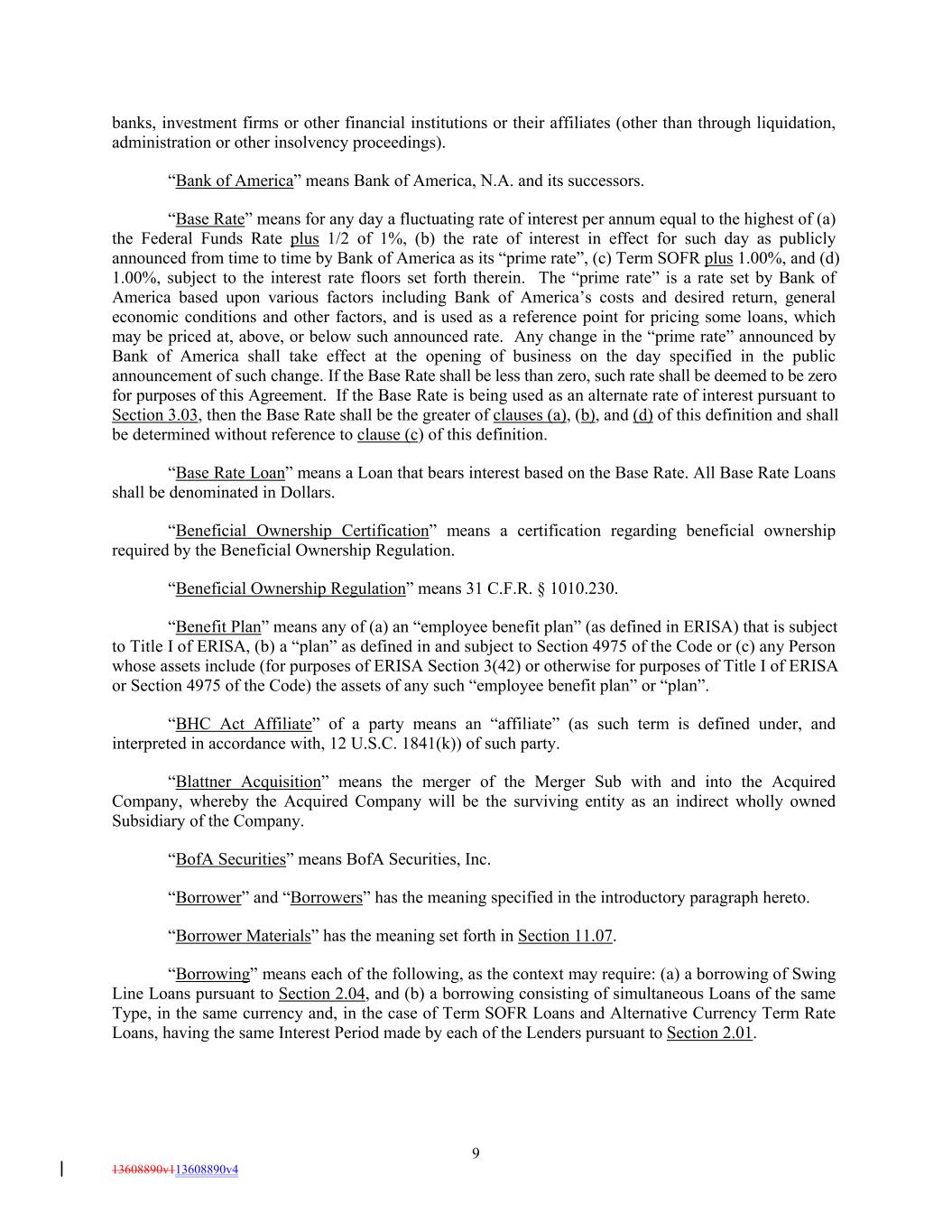 banks, investment firms or other financial institutions or their affiliates (other than through liquidation, administration or other insolvency proceedings). “Bank of America” means Bank of America, N.A. and its successors. “Base Rate” means for any day a fluctuating rate of interest per annum equal to the highest of (a) the Federal Funds Rate plus 1/2 of 1%, (b) the rate of interest in effect for such day as publicly announced from time to time by Bank of America as its “prime rate”, (c) Term SOFR plus 1.00%, and (d) 1.00%, subject to the interest rate floors set forth therein. The “prime rate” is a rate set by Bank of America based upon various factors including Bank of America’s costs and desired return, general economic conditions and other factors, and is used as a reference point for pricing some loans, which may be priced at, above, or below such announced rate. Any change in the “prime rate” announced by Bank of America shall take effect at the opening of business on the day specified in the public announcement of such change. If the Base Rate shall be less than zero, such rate shall be deemed to be zero for purposes of this Agreement. If the Base Rate is being used as an alternate rate of interest pursuant to Section 3.03, then the Base Rate shall be the greater of clauses (a), (b), and (d) of this definition and shall be determined without reference to clause (c) of this definition. “Base Rate Loan” means a Loan that bears interest based on the Base Rate. All Base Rate Loans shall be denominated in Dollars. “Beneficial Ownership Certification” means a certification regarding beneficial ownership required by the Beneficial Ownership Regulation. “Beneficial Ownership Regulation” means 31 C.F.R. § 1010.230. “Benefit Plan” means any of (a) an “employee benefit plan” (as defined in ERISA) that is subject to Title I of ERISA, (b) a “plan” as defined in and subject to Section 4975 of the Code or (c) any Person whose assets include (for purposes of ERISA Section 3(42) or otherwise for purposes of Title I of ERISA or Section 4975 of the Code) the assets of any such “employee benefit plan” or “plan”. “BHC Act Affiliate” of a party means an “affiliate” (as such term is defined under, and interpreted in accordance with, 12 U.S.C. 1841(k)) of such party. “Blattner Acquisition” means the merger of the Merger Sub with and into the Acquired Company, whereby the Acquired Company will be the surviving entity as an indirect wholly owned Subsidiary of the Company. “BofA Securities” means BofA Securities, Inc. “Borrower” and “Borrowers” has the meaning specified in the introductory paragraph hereto. “Borrower Materials” has the meaning set forth in Section 11.07. “Borrowing” means each of the following, as the context may require: (a) a borrowing of Swing Line Loans pursuant to Section 2.04, and (b) a borrowing consisting of simultaneous Loans of the same Type, in the same currency and, in the case of Term SOFR Loans and Alternative Currency Term Rate Loans, having the same Interest Period made by each of the Lenders pursuant to Section 2.01. 9 13608890v113608890v4