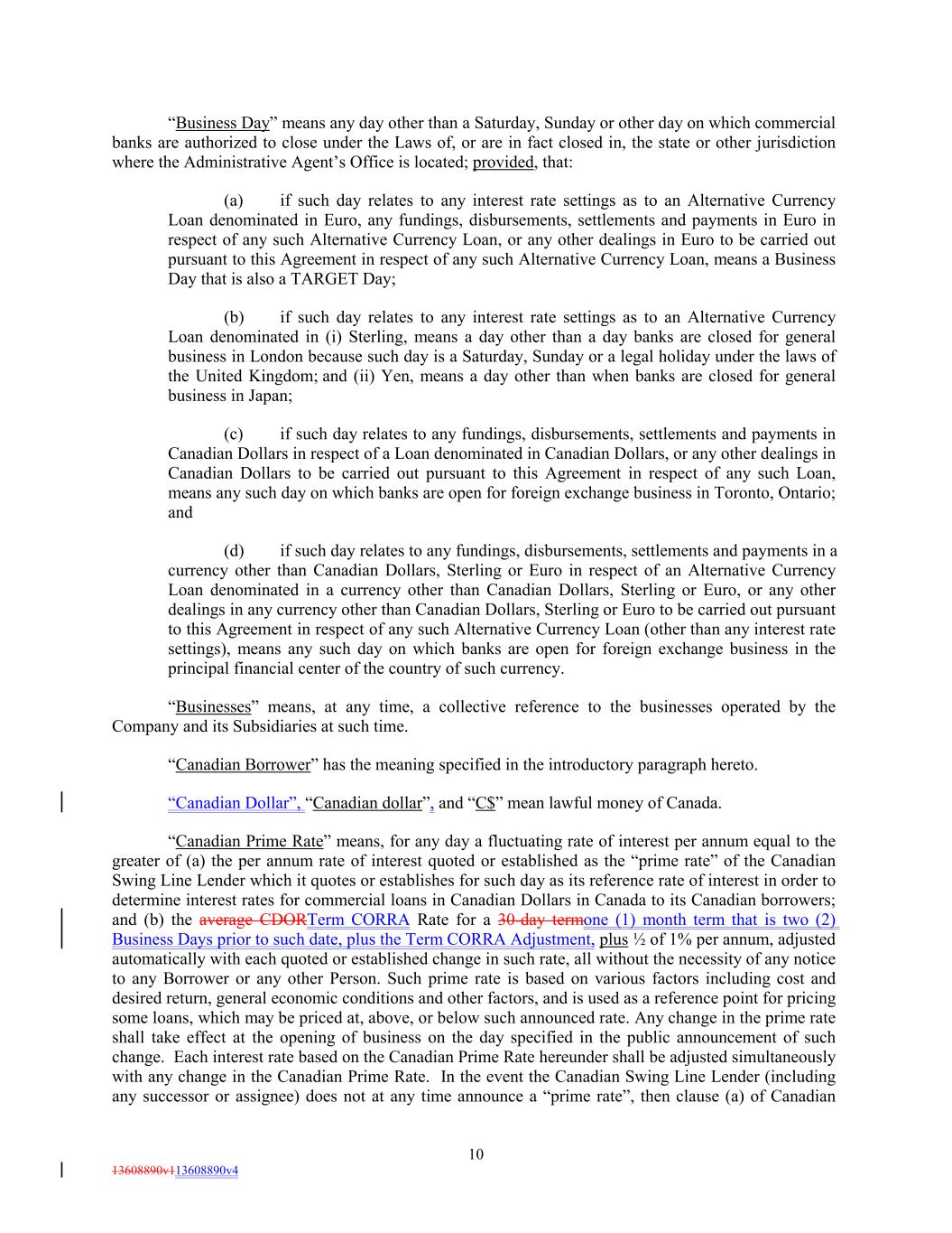 “Business Day” means any day other than a Saturday, Sunday or other day on which commercial banks are authorized to close under the Laws of, or are in fact closed in, the state or other jurisdiction where the Administrative Agent’s Office is located; provided, that: (a) if such day relates to any interest rate settings as to an Alternative Currency Loan denominated in Euro, any fundings, disbursements, settlements and payments in Euro in respect of any such Alternative Currency Loan, or any other dealings in Euro to be carried out pursuant to this Agreement in respect of any such Alternative Currency Loan, means a Business Day that is also a TARGET Day; (b) if such day relates to any interest rate settings as to an Alternative Currency Loan denominated in (i) Sterling, means a day other than a day banks are closed for general business in London because such day is a Saturday, Sunday or a legal holiday under the laws of the United Kingdom; and (ii) Yen, means a day other than when banks are closed for general business in Japan; (c) if such day relates to any fundings, disbursements, settlements and payments in Canadian Dollars in respect of a Loan denominated in Canadian Dollars, or any other dealings in Canadian Dollars to be carried out pursuant to this Agreement in respect of any such Loan, means any such day on which banks are open for foreign exchange business in Toronto, Ontario; and (d) if such day relates to any fundings, disbursements, settlements and payments in a currency other than Canadian Dollars, Sterling or Euro in respect of an Alternative Currency Loan denominated in a currency other than Canadian Dollars, Sterling or Euro, or any other dealings in any currency other than Canadian Dollars, Sterling or Euro to be carried out pursuant to this Agreement in respect of any such Alternative Currency Loan (other than any interest rate settings), means any such day on which banks are open for foreign exchange business in the principal financial center of the country of such currency. “Businesses” means, at any time, a collective reference to the businesses operated by the Company and its Subsidiaries at such time. “Canadian Borrower” has the meaning specified in the introductory paragraph hereto. “Canadian Dollar”, “Canadian dollar”, and “C$” mean lawful money of Canada. “Canadian Prime Rate” means, for any day a fluctuating rate of interest per annum equal to the greater of (a) the per annum rate of interest quoted or established as the “prime rate” of the Canadian Swing Line Lender which it quotes or establishes for such day as its reference rate of interest in order to determine interest rates for commercial loans in Canadian Dollars in Canada to its Canadian borrowers; and (b) the average CDORTerm CORRA Rate for a 30-day termone (1) month term that is two (2) Business Days prior to such date, plus the Term CORRA Adjustment, plus ½ of 1% per annum, adjusted automatically with each quoted or established change in such rate, all without the necessity of any notice to any Borrower or any other Person. Such prime rate is based on various factors including cost and desired return, general economic conditions and other factors, and is used as a reference point for pricing some loans, which may be priced at, above, or below such announced rate. Any change in the prime rate shall take effect at the opening of business on the day specified in the public announcement of such change. Each interest rate based on the Canadian Prime Rate hereunder shall be adjusted simultaneously with any change in the Canadian Prime Rate. In the event the Canadian Swing Line Lender (including any successor or assignee) does not at any time announce a “prime rate”, then clause (a) of Canadian 10 13608890v113608890v4