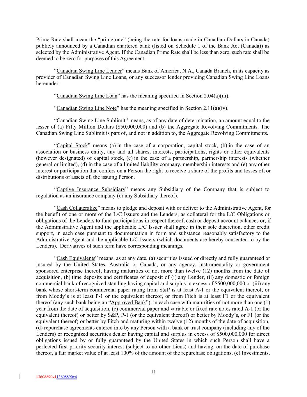 Prime Rate shall mean the “prime rate” (being the rate for loans made in Canadian Dollars in Canada) publicly announced by a Canadian chartered bank (listed on Schedule 1 of the Bank Act (Canada)) as selected by the Administrative Agent. If the Canadian Prime Rate shall be less than zero, such rate shall be deemed to be zero for purposes of this Agreement. “Canadian Swing Line Lender” means Bank of America, N.A., Canada Branch, in its capacity as provider of Canadian Swing Line Loans, or any successor lender providing Canadian Swing Line Loans hereunder. “Canadian Swing Line Loan” has the meaning specified in Section 2.04(a)(iii). “Canadian Swing Line Note” has the meaning specified in Section 2.11(a)(iv). “Canadian Swing Line Sublimit” means, as of any date of determination, an amount equal to the lesser of (a) Fifty Million Dollars ($50,000,000) and (b) the Aggregate Revolving Commitments. The Canadian Swing Line Sublimit is part of, and not in addition to, the Aggregate Revolving Commitments. “Capital Stock” means (a) in the case of a corporation, capital stock, (b) in the case of an association or business entity, any and all shares, interests, participations, rights or other equivalents (however designated) of capital stock, (c) in the case of a partnership, partnership interests (whether general or limited), (d) in the case of a limited liability company, membership interests and (e) any other interest or participation that confers on a Person the right to receive a share of the profits and losses of, or distributions of assets of, the issuing Person. “Captive Insurance Subsidiary” means any Subsidiary of the Company that is subject to regulation as an insurance company (or any Subsidiary thereof). “Cash Collateralize” means to pledge and deposit with or deliver to the Administrative Agent, for the benefit of one or more of the L/C Issuers and the Lenders, as collateral for the L/C Obligations or obligations of the Lenders to fund participations in respect thereof, cash or deposit account balances or, if the Administrative Agent and the applicable L/C Issuer shall agree in their sole discretion, other credit support, in each case pursuant to documentation in form and substance reasonably satisfactory to the Administrative Agent and the applicable L/C Issuers (which documents are hereby consented to by the Lenders). Derivatives of such term have corresponding meanings. “Cash Equivalents” means, as at any date, (a) securities issued or directly and fully guaranteed or insured by the United States, Australia or Canada, or any agency, instrumentality or government sponsored enterprise thereof, having maturities of not more than twelve (12) months from the date of acquisition, (b) time deposits and certificates of deposit of (i) any Lender, (ii) any domestic or foreign commercial bank of recognized standing having capital and surplus in excess of $500,000,000 or (iii) any bank whose short-term commercial paper rating from S&P is at least A-1 or the equivalent thereof, or from Moody’s is at least P-1 or the equivalent thereof, or from Fitch is at least F1 or the equivalent thereof (any such bank being an “Approved Bank”), in each case with maturities of not more than one (1) year from the date of acquisition, (c) commercial paper and variable or fixed rate notes rated A-1 (or the equivalent thereof) or better by S&P, P-1 (or the equivalent thereof) or better by Moody’s, or F1 (or the equivalent thereof) or better by Fitch and maturing within twelve (12) months of the date of acquisition, (d) repurchase agreements entered into by any Person with a bank or trust company (including any of the Lenders) or recognized securities dealer having capital and surplus in excess of $500,000,000 for direct obligations issued by or fully guaranteed by the United States in which such Person shall have a perfected first priority security interest (subject to no other Liens) and having, on the date of purchase thereof, a fair market value of at least 100% of the amount of the repurchase obligations, (e) Investments, 11 13608890v113608890v4