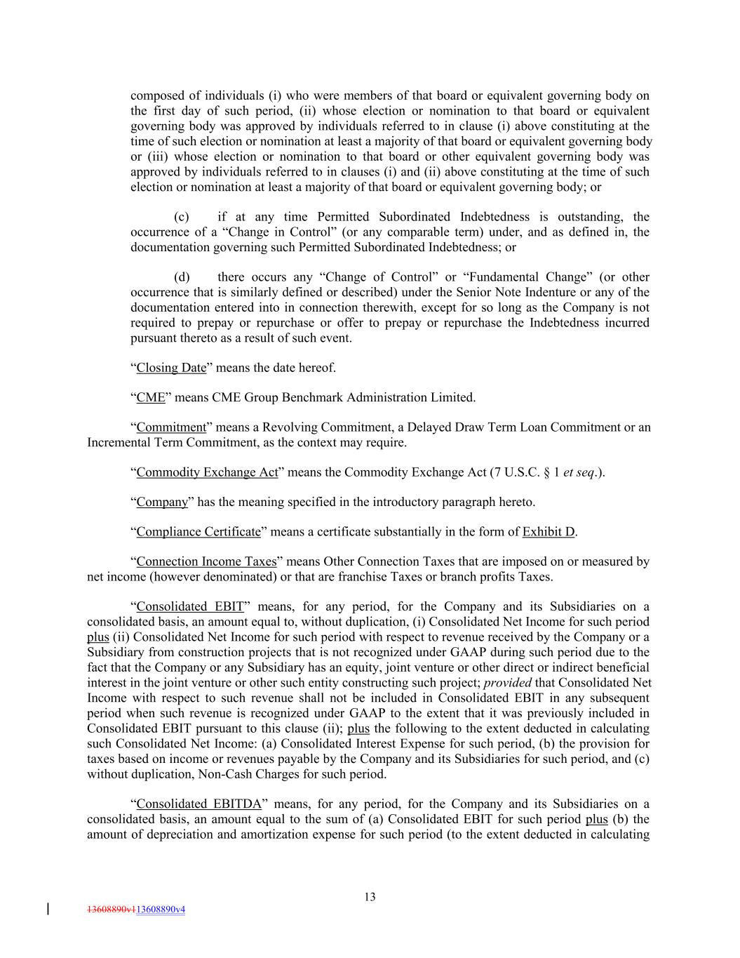 composed of individuals (i) who were members of that board or equivalent governing body on the first day of such period, (ii) whose election or nomination to that board or equivalent governing body was approved by individuals referred to in clause (i) above constituting at the time of such election or nomination at least a majority of that board or equivalent governing body or (iii) whose election or nomination to that board or other equivalent governing body was approved by individuals referred to in clauses (i) and (ii) above constituting at the time of such election or nomination at least a majority of that board or equivalent governing body; or (c) if at any time Permitted Subordinated Indebtedness is outstanding, the occurrence of a “Change in Control” (or any comparable term) under, and as defined in, the documentation governing such Permitted Subordinated Indebtedness; or (d) there occurs any “Change of Control” or “Fundamental Change” (or other occurrence that is similarly defined or described) under the Senior Note Indenture or any of the documentation entered into in connection therewith, except for so long as the Company is not required to prepay or repurchase or offer to prepay or repurchase the Indebtedness incurred pursuant thereto as a result of such event. “Closing Date” means the date hereof. “CME” means CME Group Benchmark Administration Limited. “Commitment” means a Revolving Commitment, a Delayed Draw Term Loan Commitment or an Incremental Term Commitment, as the context may require. “Commodity Exchange Act” means the Commodity Exchange Act (7 U.S.C. § 1 et seq.). “Company” has the meaning specified in the introductory paragraph hereto. “Compliance Certificate” means a certificate substantially in the form of Exhibit D. “Connection Income Taxes” means Other Connection Taxes that are imposed on or measured by net income (however denominated) or that are franchise Taxes or branch profits Taxes. “Consolidated EBIT” means, for any period, for the Company and its Subsidiaries on a consolidated basis, an amount equal to, without duplication, (i) Consolidated Net Income for such period plus (ii) Consolidated Net Income for such period with respect to revenue received by the Company or a Subsidiary from construction projects that is not recognized under GAAP during such period due to the fact that the Company or any Subsidiary has an equity, joint venture or other direct or indirect beneficial interest in the joint venture or other such entity constructing such project; provided that Consolidated Net Income with respect to such revenue shall not be included in Consolidated EBIT in any subsequent period when such revenue is recognized under GAAP to the extent that it was previously included in Consolidated EBIT pursuant to this clause (ii); plus the following to the extent deducted in calculating such Consolidated Net Income: (a) Consolidated Interest Expense for such period, (b) the provision for taxes based on income or revenues payable by the Company and its Subsidiaries for such period, and (c) without duplication, Non-Cash Charges for such period. “Consolidated EBITDA” means, for any period, for the Company and its Subsidiaries on a consolidated basis, an amount equal to the sum of (a) Consolidated EBIT for such period plus (b) the amount of depreciation and amortization expense for such period (to the extent deducted in calculating 13 13608890v113608890v4