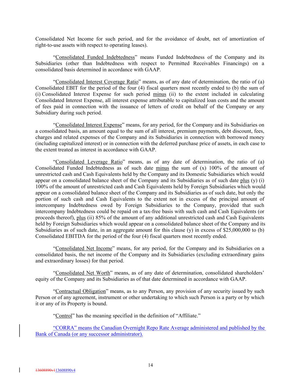 Consolidated Net Income for such period, and for the avoidance of doubt, net of amortization of right-to-use assets with respect to operating leases). “Consolidated Funded Indebtedness” means Funded Indebtedness of the Company and its Subsidiaries (other than Indebtedness with respect to Permitted Receivables Financings) on a consolidated basis determined in accordance with GAAP. “Consolidated Interest Coverage Ratio” means, as of any date of determination, the ratio of (a) Consolidated EBIT for the period of the four (4) fiscal quarters most recently ended to (b) the sum of (i) Consolidated Interest Expense for such period minus (ii) to the extent included in calculating Consolidated Interest Expense, all interest expense attributable to capitalized loan costs and the amount of fees paid in connection with the issuance of letters of credit on behalf of the Company or any Subsidiary during such period. “Consolidated Interest Expense” means, for any period, for the Company and its Subsidiaries on a consolidated basis, an amount equal to the sum of all interest, premium payments, debt discount, fees, charges and related expenses of the Company and its Subsidiaries in connection with borrowed money (including capitalized interest) or in connection with the deferred purchase price of assets, in each case to the extent treated as interest in accordance with GAAP. “Consolidated Leverage Ratio” means, as of any date of determination, the ratio of (a) Consolidated Funded Indebtedness as of such date minus the sum of (x) 100% of the amount of unrestricted cash and Cash Equivalents held by the Company and its Domestic Subsidiaries which would appear on a consolidated balance sheet of the Company and its Subsidiaries as of such date plus (y) (i) 100% of the amount of unrestricted cash and Cash Equivalents held by Foreign Subsidiaries which would appear on a consolidated balance sheet of the Company and its Subsidiaries as of such date, but only the portion of such cash and Cash Equivalents to the extent not in excess of the principal amount of intercompany Indebtedness owed by Foreign Subsidiaries to the Company, provided that such intercompany Indebtedness could be repaid on a tax-free basis with such cash and Cash Equivalents (or proceeds thereof), plus (ii) 85% of the amount of any additional unrestricted cash and Cash Equivalents held by Foreign Subsidiaries which would appear on a consolidated balance sheet of the Company and its Subsidiaries as of such date, in an aggregate amount for this clause (y) in excess of $25,000,000 to (b) Consolidated EBITDA for the period of the four (4) fiscal quarters most recently ended. “Consolidated Net Income” means, for any period, for the Company and its Subsidiaries on a consolidated basis, the net income of the Company and its Subsidiaries (excluding extraordinary gains and extraordinary losses) for that period. “Consolidated Net Worth” means, as of any date of determination, consolidated shareholders’ equity of the Company and its Subsidiaries as of that date determined in accordance with GAAP. “Contractual Obligation” means, as to any Person, any provision of any security issued by such Person or of any agreement, instrument or other undertaking to which such Person is a party or by which it or any of its Property is bound. “Control” has the meaning specified in the definition of “Affiliate.” “CORRA” means the Canadian Overnight Repo Rate Average administered and published by the Bank of Canada (or any successor administrator). 14 13608890v113608890v4