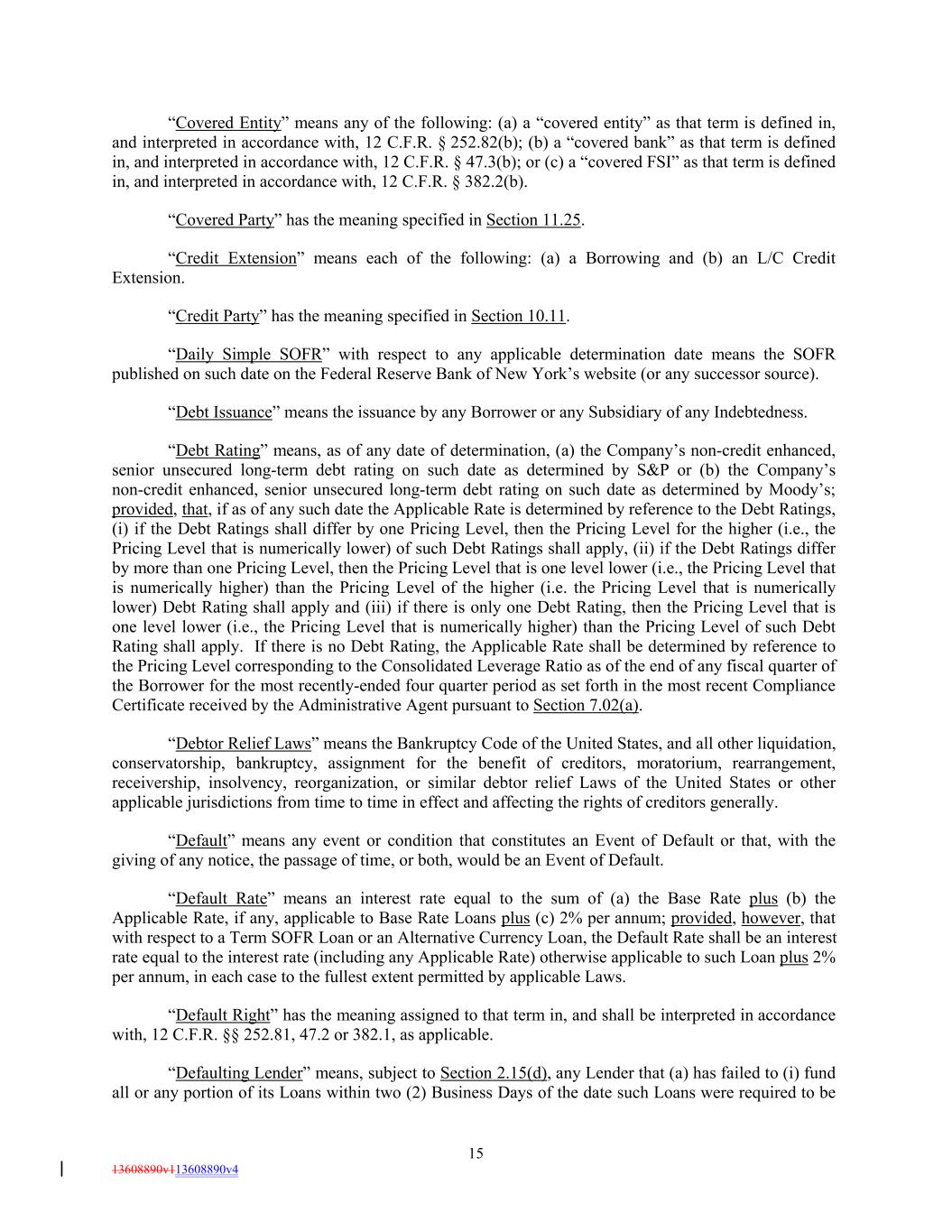 “Covered Entity” means any of the following: (a) a “covered entity” as that term is defined in, and interpreted in accordance with, 12 C.F.R. § 252.82(b); (b) a “covered bank” as that term is defined in, and interpreted in accordance with, 12 C.F.R. § 47.3(b); or (c) a “covered FSI” as that term is defined in, and interpreted in accordance with, 12 C.F.R. § 382.2(b). “Covered Party” has the meaning specified in Section 11.25. “Credit Extension” means each of the following: (a) a Borrowing and (b) an L/C Credit Extension. “Credit Party” has the meaning specified in Section 10.11. “Daily Simple SOFR” with respect to any applicable determination date means the SOFR published on such date on the Federal Reserve Bank of New York’s website (or any successor source). “Debt Issuance” means the issuance by any Borrower or any Subsidiary of any Indebtedness. “Debt Rating” means, as of any date of determination, (a) the Company’s non-credit enhanced, senior unsecured long-term debt rating on such date as determined by S&P or (b) the Company’s non-credit enhanced, senior unsecured long-term debt rating on such date as determined by Moody’s; provided, that, if as of any such date the Applicable Rate is determined by reference to the Debt Ratings, (i) if the Debt Ratings shall differ by one Pricing Level, then the Pricing Level for the higher (i.e., the Pricing Level that is numerically lower) of such Debt Ratings shall apply, (ii) if the Debt Ratings differ by more than one Pricing Level, then the Pricing Level that is one level lower (i.e., the Pricing Level that is numerically higher) than the Pricing Level of the higher (i.e. the Pricing Level that is numerically lower) Debt Rating shall apply and (iii) if there is only one Debt Rating, then the Pricing Level that is one level lower (i.e., the Pricing Level that is numerically higher) than the Pricing Level of such Debt Rating shall apply. If there is no Debt Rating, the Applicable Rate shall be determined by reference to the Pricing Level corresponding to the Consolidated Leverage Ratio as of the end of any fiscal quarter of the Borrower for the most recently-ended four quarter period as set forth in the most recent Compliance Certificate received by the Administrative Agent pursuant to Section 7.02(a). “Debtor Relief Laws” means the Bankruptcy Code of the United States, and all other liquidation, conservatorship, bankruptcy, assignment for the benefit of creditors, moratorium, rearrangement, receivership, insolvency, reorganization, or similar debtor relief Laws of the United States or other applicable jurisdictions from time to time in effect and affecting the rights of creditors generally. “Default” means any event or condition that constitutes an Event of Default or that, with the giving of any notice, the passage of time, or both, would be an Event of Default. “Default Rate” means an interest rate equal to the sum of (a) the Base Rate plus (b) the Applicable Rate, if any, applicable to Base Rate Loans plus (c) 2% per annum; provided, however, that with respect to a Term SOFR Loan or an Alternative Currency Loan, the Default Rate shall be an interest rate equal to the interest rate (including any Applicable Rate) otherwise applicable to such Loan plus 2% per annum, in each case to the fullest extent permitted by applicable Laws. “Default Right” has the meaning assigned to that term in, and shall be interpreted in accordance with, 12 C.F.R. §§ 252.81, 47.2 or 382.1, as applicable. “Defaulting Lender” means, subject to Section 2.15(d), any Lender that (a) has failed to (i) fund all or any portion of its Loans within two (2) Business Days of the date such Loans were required to be 15 13608890v113608890v4