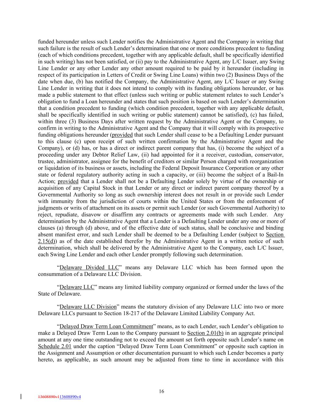funded hereunder unless such Lender notifies the Administrative Agent and the Company in writing that such failure is the result of such Lender’s determination that one or more conditions precedent to funding (each of which conditions precedent, together with any applicable default, shall be specifically identified in such writing) has not been satisfied, or (ii) pay to the Administrative Agent, any L/C Issuer, any Swing Line Lender or any other Lender any other amount required to be paid by it hereunder (including in respect of its participation in Letters of Credit or Swing Line Loans) within two (2) Business Days of the date when due, (b) has notified the Company, the Administrative Agent, any L/C Issuer or any Swing Line Lender in writing that it does not intend to comply with its funding obligations hereunder, or has made a public statement to that effect (unless such writing or public statement relates to such Lender’s obligation to fund a Loan hereunder and states that such position is based on such Lender’s determination that a condition precedent to funding (which condition precedent, together with any applicable default, shall be specifically identified in such writing or public statement) cannot be satisfied), (c) has failed, within three (3) Business Days after written request by the Administrative Agent or the Company, to confirm in writing to the Administrative Agent and the Company that it will comply with its prospective funding obligations hereunder (provided that such Lender shall cease to be a Defaulting Lender pursuant to this clause (c) upon receipt of such written confirmation by the Administrative Agent and the Company), or (d) has, or has a direct or indirect parent company that has, (i) become the subject of a proceeding under any Debtor Relief Law, (ii) had appointed for it a receiver, custodian, conservator, trustee, administrator, assignee for the benefit of creditors or similar Person charged with reorganization or liquidation of its business or assets, including the Federal Deposit Insurance Corporation or any other state or federal regulatory authority acting in such a capacity, or (iii) become the subject of a Bail-In Action; provided that a Lender shall not be a Defaulting Lender solely by virtue of the ownership or acquisition of any Capital Stock in that Lender or any direct or indirect parent company thereof by a Governmental Authority so long as such ownership interest does not result in or provide such Lender with immunity from the jurisdiction of courts within the United States or from the enforcement of judgments or writs of attachment on its assets or permit such Lender (or such Governmental Authority) to reject, repudiate, disavow or disaffirm any contracts or agreements made with such Lender. Any determination by the Administrative Agent that a Lender is a Defaulting Lender under any one or more of clauses (a) through (d) above, and of the effective date of such status, shall be conclusive and binding absent manifest error, and such Lender shall be deemed to be a Defaulting Lender (subject to Section 2.15(d)) as of the date established therefor by the Administrative Agent in a written notice of such determination, which shall be delivered by the Administrative Agent to the Company, each L/C Issuer, each Swing Line Lender and each other Lender promptly following such determination. “Delaware Divided LLC” means any Delaware LLC which has been formed upon the consummation of a Delaware LLC Division. “Delaware LLC” means any limited liability company organized or formed under the laws of the State of Delaware. “Delaware LLC Division” means the statutory division of any Delaware LLC into two or more Delaware LLCs pursuant to Section 18-217 of the Delaware Limited Liability Company Act. “Delayed Draw Term Loan Commitment” means, as to each Lender, such Lender’s obligation to make a Delayed Draw Term Loan to the Company pursuant to Section 2.01(b) in an aggregate principal amount at any one time outstanding not to exceed the amount set forth opposite such Lender’s name on Schedule 2.01 under the caption “Delayed Draw Term Loan Commitment” or opposite such caption in the Assignment and Assumption or other documentation pursuant to which such Lender becomes a party hereto, as applicable, as such amount may be adjusted from time to time in accordance with this 16 13608890v113608890v4