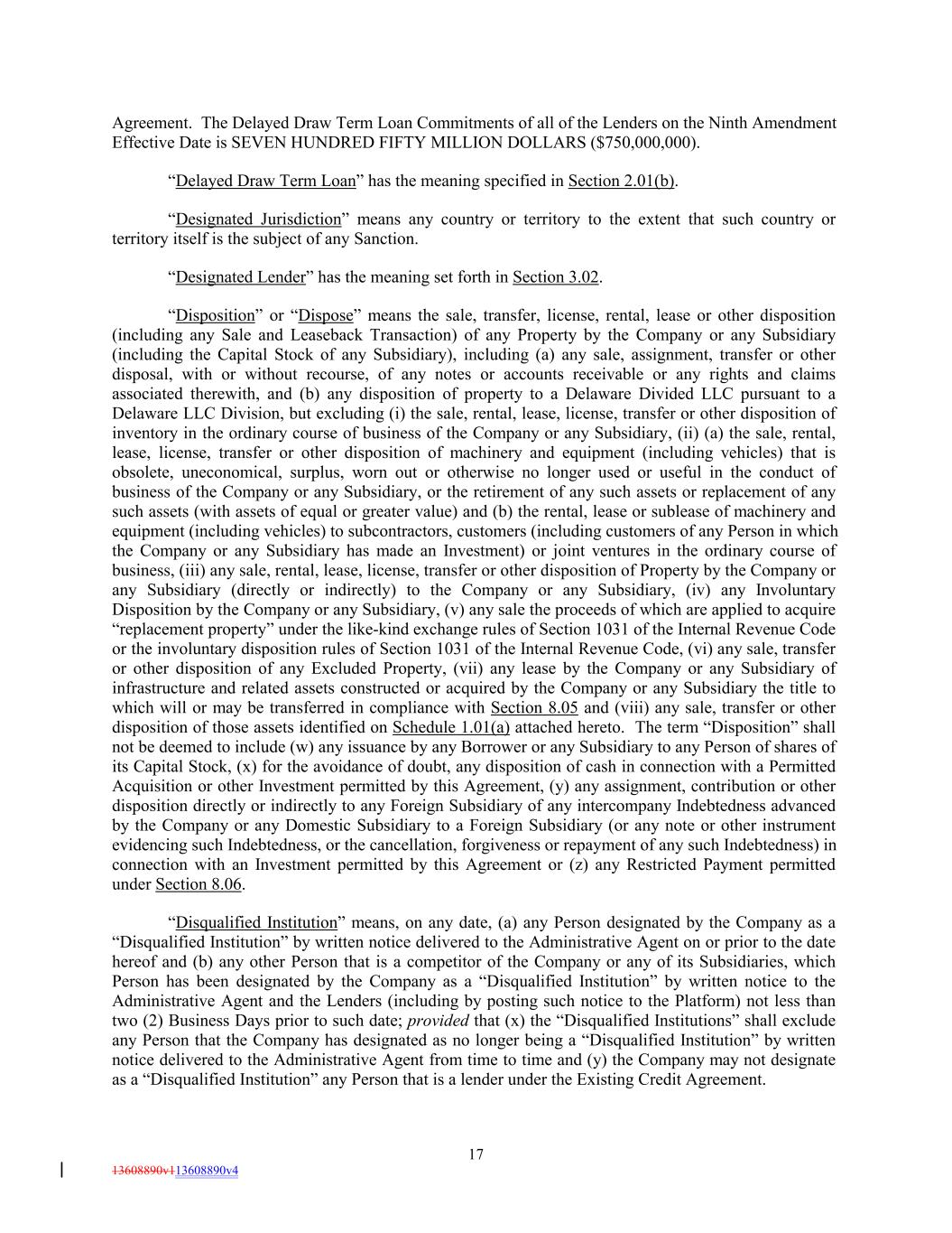 Agreement. The Delayed Draw Term Loan Commitments of all of the Lenders on the Ninth Amendment Effective Date is SEVEN HUNDRED FIFTY MILLION DOLLARS ($750,000,000). “Delayed Draw Term Loan” has the meaning specified in Section 2.01(b). “Designated Jurisdiction” means any country or territory to the extent that such country or territory itself is the subject of any Sanction. “Designated Lender” has the meaning set forth in Section 3.02. “Disposition” or “Dispose” means the sale, transfer, license, rental, lease or other disposition (including any Sale and Leaseback Transaction) of any Property by the Company or any Subsidiary (including the Capital Stock of any Subsidiary), including (a) any sale, assignment, transfer or other disposal, with or without recourse, of any notes or accounts receivable or any rights and claims associated therewith, and (b) any disposition of property to a Delaware Divided LLC pursuant to a Delaware LLC Division, but excluding (i) the sale, rental, lease, license, transfer or other disposition of inventory in the ordinary course of business of the Company or any Subsidiary, (ii) (a) the sale, rental, lease, license, transfer or other disposition of machinery and equipment (including vehicles) that is obsolete, uneconomical, surplus, worn out or otherwise no longer used or useful in the conduct of business of the Company or any Subsidiary, or the retirement of any such assets or replacement of any such assets (with assets of equal or greater value) and (b) the rental, lease or sublease of machinery and equipment (including vehicles) to subcontractors, customers (including customers of any Person in which the Company or any Subsidiary has made an Investment) or joint ventures in the ordinary course of business, (iii) any sale, rental, lease, license, transfer or other disposition of Property by the Company or any Subsidiary (directly or indirectly) to the Company or any Subsidiary, (iv) any Involuntary Disposition by the Company or any Subsidiary, (v) any sale the proceeds of which are applied to acquire “replacement property” under the like-kind exchange rules of Section 1031 of the Internal Revenue Code or the involuntary disposition rules of Section 1031 of the Internal Revenue Code, (vi) any sale, transfer or other disposition of any Excluded Property, (vii) any lease by the Company or any Subsidiary of infrastructure and related assets constructed or acquired by the Company or any Subsidiary the title to which will or may be transferred in compliance with Section 8.05 and (viii) any sale, transfer or other disposition of those assets identified on Schedule 1.01(a) attached hereto. The term “Disposition” shall not be deemed to include (w) any issuance by any Borrower or any Subsidiary to any Person of shares of its Capital Stock, (x) for the avoidance of doubt, any disposition of cash in connection with a Permitted Acquisition or other Investment permitted by this Agreement, (y) any assignment, contribution or other disposition directly or indirectly to any Foreign Subsidiary of any intercompany Indebtedness advanced by the Company or any Domestic Subsidiary to a Foreign Subsidiary (or any note or other instrument evidencing such Indebtedness, or the cancellation, forgiveness or repayment of any such Indebtedness) in connection with an Investment permitted by this Agreement or (z) any Restricted Payment permitted under Section 8.06. “Disqualified Institution” means, on any date, (a) any Person designated by the Company as a “Disqualified Institution” by written notice delivered to the Administrative Agent on or prior to the date hereof and (b) any other Person that is a competitor of the Company or any of its Subsidiaries, which Person has been designated by the Company as a “Disqualified Institution” by written notice to the Administrative Agent and the Lenders (including by posting such notice to the Platform) not less than two (2) Business Days prior to such date; provided that (x) the “Disqualified Institutions” shall exclude any Person that the Company has designated as no longer being a “Disqualified Institution” by written notice delivered to the Administrative Agent from time to time and (y) the Company may not designate as a “Disqualified Institution” any Person that is a lender under the Existing Credit Agreement. 17 13608890v113608890v4