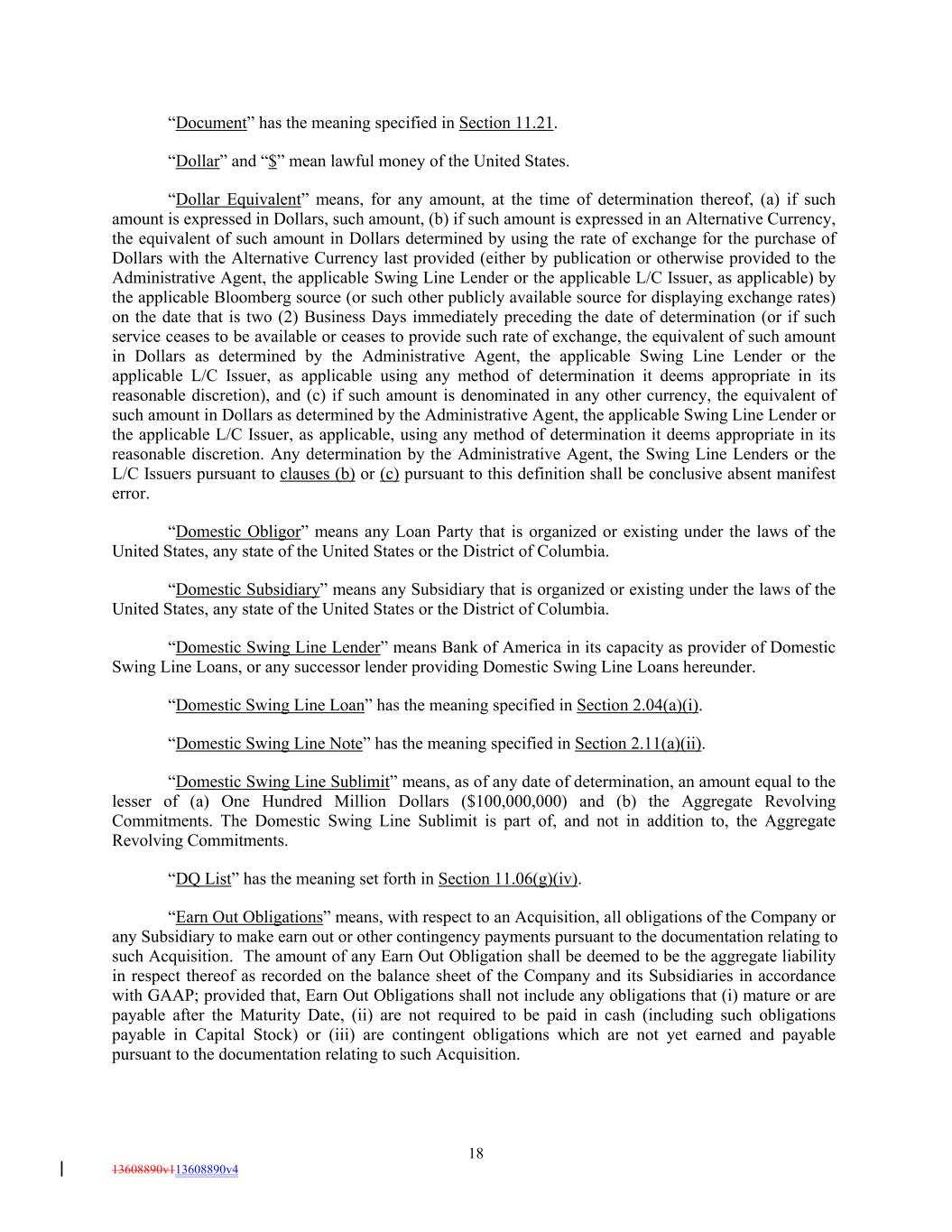 “Document” has the meaning specified in Section 11.21. “Dollar” and “$” mean lawful money of the United States. “Dollar Equivalent” means, for any amount, at the time of determination thereof, (a) if such amount is expressed in Dollars, such amount, (b) if such amount is expressed in an Alternative Currency, the equivalent of such amount in Dollars determined by using the rate of exchange for the purchase of Dollars with the Alternative Currency last provided (either by publication or otherwise provided to the Administrative Agent, the applicable Swing Line Lender or the applicable L/C Issuer, as applicable) by the applicable Bloomberg source (or such other publicly available source for displaying exchange rates) on the date that is two (2) Business Days immediately preceding the date of determination (or if such service ceases to be available or ceases to provide such rate of exchange, the equivalent of such amount in Dollars as determined by the Administrative Agent, the applicable Swing Line Lender or the applicable L/C Issuer, as applicable using any method of determination it deems appropriate in its reasonable discretion), and (c) if such amount is denominated in any other currency, the equivalent of such amount in Dollars as determined by the Administrative Agent, the applicable Swing Line Lender or the applicable L/C Issuer, as applicable, using any method of determination it deems appropriate in its reasonable discretion. Any determination by the Administrative Agent, the Swing Line Lenders or the L/C Issuers pursuant to clauses (b) or (c) pursuant to this definition shall be conclusive absent manifest error. “Domestic Obligor” means any Loan Party that is organized or existing under the laws of the United States, any state of the United States or the District of Columbia. “Domestic Subsidiary” means any Subsidiary that is organized or existing under the laws of the United States, any state of the United States or the District of Columbia. “Domestic Swing Line Lender” means Bank of America in its capacity as provider of Domestic Swing Line Loans, or any successor lender providing Domestic Swing Line Loans hereunder. “Domestic Swing Line Loan” has the meaning specified in Section 2.04(a)(i). “Domestic Swing Line Note” has the meaning specified in Section 2.11(a)(ii). “Domestic Swing Line Sublimit” means, as of any date of determination, an amount equal to the lesser of (a) One Hundred Million Dollars ($100,000,000) and (b) the Aggregate Revolving Commitments. The Domestic Swing Line Sublimit is part of, and not in addition to, the Aggregate Revolving Commitments. “DQ List” has the meaning set forth in Section 11.06(g)(iv). “Earn Out Obligations” means, with respect to an Acquisition, all obligations of the Company or any Subsidiary to make earn out or other contingency payments pursuant to the documentation relating to such Acquisition. The amount of any Earn Out Obligation shall be deemed to be the aggregate liability in respect thereof as recorded on the balance sheet of the Company and its Subsidiaries in accordance with GAAP; provided that, Earn Out Obligations shall not include any obligations that (i) mature or are payable after the Maturity Date, (ii) are not required to be paid in cash (including such obligations payable in Capital Stock) or (iii) are contingent obligations which are not yet earned and payable pursuant to the documentation relating to such Acquisition. 18 13608890v113608890v4