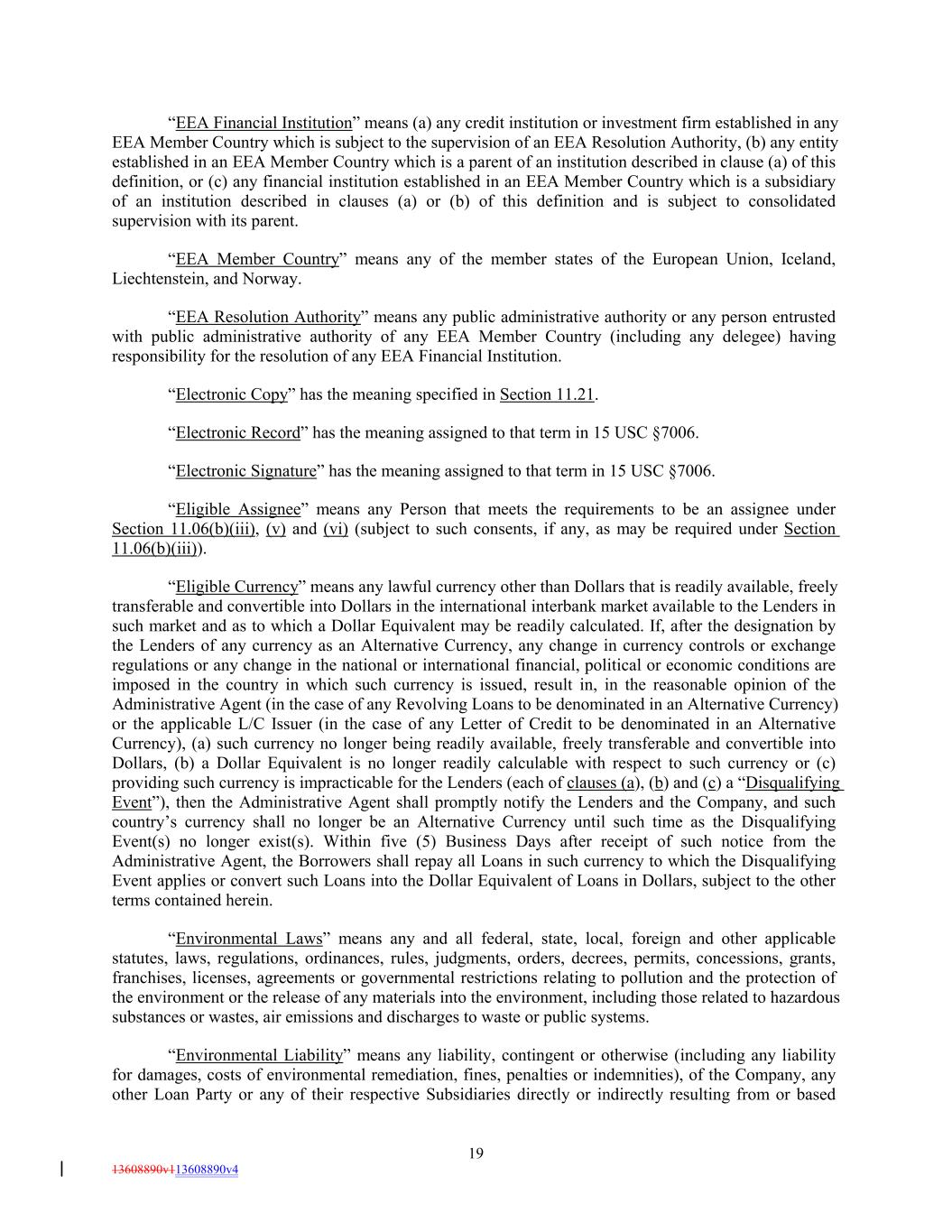 “EEA Financial Institution” means (a) any credit institution or investment firm established in any EEA Member Country which is subject to the supervision of an EEA Resolution Authority, (b) any entity established in an EEA Member Country which is a parent of an institution described in clause (a) of this definition, or (c) any financial institution established in an EEA Member Country which is a subsidiary of an institution described in clauses (a) or (b) of this definition and is subject to consolidated supervision with its parent. “EEA Member Country” means any of the member states of the European Union, Iceland, Liechtenstein, and Norway. “EEA Resolution Authority” means any public administrative authority or any person entrusted with public administrative authority of any EEA Member Country (including any delegee) having responsibility for the resolution of any EEA Financial Institution. “Electronic Copy” has the meaning specified in Section 11.21. “Electronic Record” has the meaning assigned to that term in 15 USC §7006. “Electronic Signature” has the meaning assigned to that term in 15 USC §7006. “Eligible Assignee” means any Person that meets the requirements to be an assignee under Section 11.06(b)(iii), (v) and (vi) (subject to such consents, if any, as may be required under Section 11.06(b)(iii)). “Eligible Currency” means any lawful currency other than Dollars that is readily available, freely transferable and convertible into Dollars in the international interbank market available to the Lenders in such market and as to which a Dollar Equivalent may be readily calculated. If, after the designation by the Lenders of any currency as an Alternative Currency, any change in currency controls or exchange regulations or any change in the national or international financial, political or economic conditions are imposed in the country in which such currency is issued, result in, in the reasonable opinion of the Administrative Agent (in the case of any Revolving Loans to be denominated in an Alternative Currency) or the applicable L/C Issuer (in the case of any Letter of Credit to be denominated in an Alternative Currency), (a) such currency no longer being readily available, freely transferable and convertible into Dollars, (b) a Dollar Equivalent is no longer readily calculable with respect to such currency or (c) providing such currency is impracticable for the Lenders (each of clauses (a), (b) and (c) a “Disqualifying Event”), then the Administrative Agent shall promptly notify the Lenders and the Company, and such country’s currency shall no longer be an Alternative Currency until such time as the Disqualifying Event(s) no longer exist(s). Within five (5) Business Days after receipt of such notice from the Administrative Agent, the Borrowers shall repay all Loans in such currency to which the Disqualifying Event applies or convert such Loans into the Dollar Equivalent of Loans in Dollars, subject to the other terms contained herein. “Environmental Laws” means any and all federal, state, local, foreign and other applicable statutes, laws, regulations, ordinances, rules, judgments, orders, decrees, permits, concessions, grants, franchises, licenses, agreements or governmental restrictions relating to pollution and the protection of the environment or the release of any materials into the environment, including those related to hazardous substances or wastes, air emissions and discharges to waste or public systems. “Environmental Liability” means any liability, contingent or otherwise (including any liability for damages, costs of environmental remediation, fines, penalties or indemnities), of the Company, any other Loan Party or any of their respective Subsidiaries directly or indirectly resulting from or based 19 13608890v113608890v4