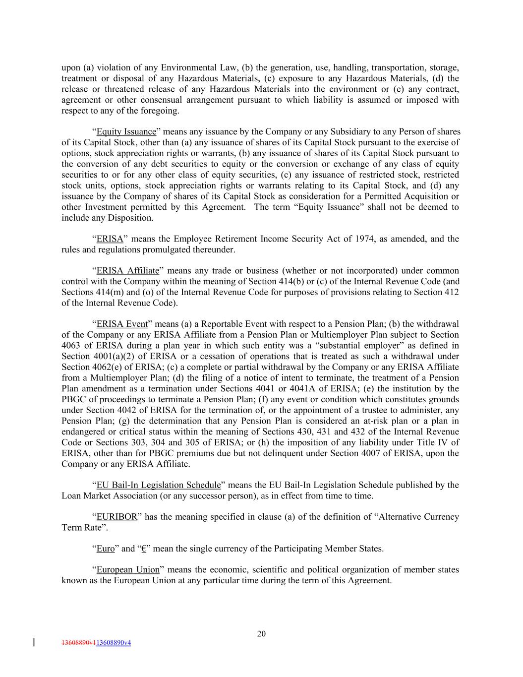 upon (a) violation of any Environmental Law, (b) the generation, use, handling, transportation, storage, treatment or disposal of any Hazardous Materials, (c) exposure to any Hazardous Materials, (d) the release or threatened release of any Hazardous Materials into the environment or (e) any contract, agreement or other consensual arrangement pursuant to which liability is assumed or imposed with respect to any of the foregoing. “Equity Issuance” means any issuance by the Company or any Subsidiary to any Person of shares of its Capital Stock, other than (a) any issuance of shares of its Capital Stock pursuant to the exercise of options, stock appreciation rights or warrants, (b) any issuance of shares of its Capital Stock pursuant to the conversion of any debt securities to equity or the conversion or exchange of any class of equity securities to or for any other class of equity securities, (c) any issuance of restricted stock, restricted stock units, options, stock appreciation rights or warrants relating to its Capital Stock, and (d) any issuance by the Company of shares of its Capital Stock as consideration for a Permitted Acquisition or other Investment permitted by this Agreement. The term “Equity Issuance” shall not be deemed to include any Disposition. “ERISA” means the Employee Retirement Income Security Act of 1974, as amended, and the rules and regulations promulgated thereunder. “ERISA Affiliate” means any trade or business (whether or not incorporated) under common control with the Company within the meaning of Section 414(b) or (c) of the Internal Revenue Code (and Sections 414(m) and (o) of the Internal Revenue Code for purposes of provisions relating to Section 412 of the Internal Revenue Code). “ERISA Event” means (a) a Reportable Event with respect to a Pension Plan; (b) the withdrawal of the Company or any ERISA Affiliate from a Pension Plan or Multiemployer Plan subject to Section 4063 of ERISA during a plan year in which such entity was a “substantial employer” as defined in Section 4001(a)(2) of ERISA or a cessation of operations that is treated as such a withdrawal under Section 4062(e) of ERISA; (c) a complete or partial withdrawal by the Company or any ERISA Affiliate from a Multiemployer Plan; (d) the filing of a notice of intent to terminate, the treatment of a Pension Plan amendment as a termination under Sections 4041 or 4041A of ERISA; (e) the institution by the PBGC of proceedings to terminate a Pension Plan; (f) any event or condition which constitutes grounds under Section 4042 of ERISA for the termination of, or the appointment of a trustee to administer, any Pension Plan; (g) the determination that any Pension Plan is considered an at-risk plan or a plan in endangered or critical status within the meaning of Sections 430, 431 and 432 of the Internal Revenue Code or Sections 303, 304 and 305 of ERISA; or (h) the imposition of any liability under Title IV of ERISA, other than for PBGC premiums due but not delinquent under Section 4007 of ERISA, upon the Company or any ERISA Affiliate. “EU Bail-In Legislation Schedule” means the EU Bail-In Legislation Schedule published by the Loan Market Association (or any successor person), as in effect from time to time. “EURIBOR” has the meaning specified in clause (a) of the definition of “Alternative Currency Term Rate”. “Euro” and “€” mean the single currency of the Participating Member States. “European Union” means the economic, scientific and political organization of member states known as the European Union at any particular time during the term of this Agreement. 20 13608890v113608890v4