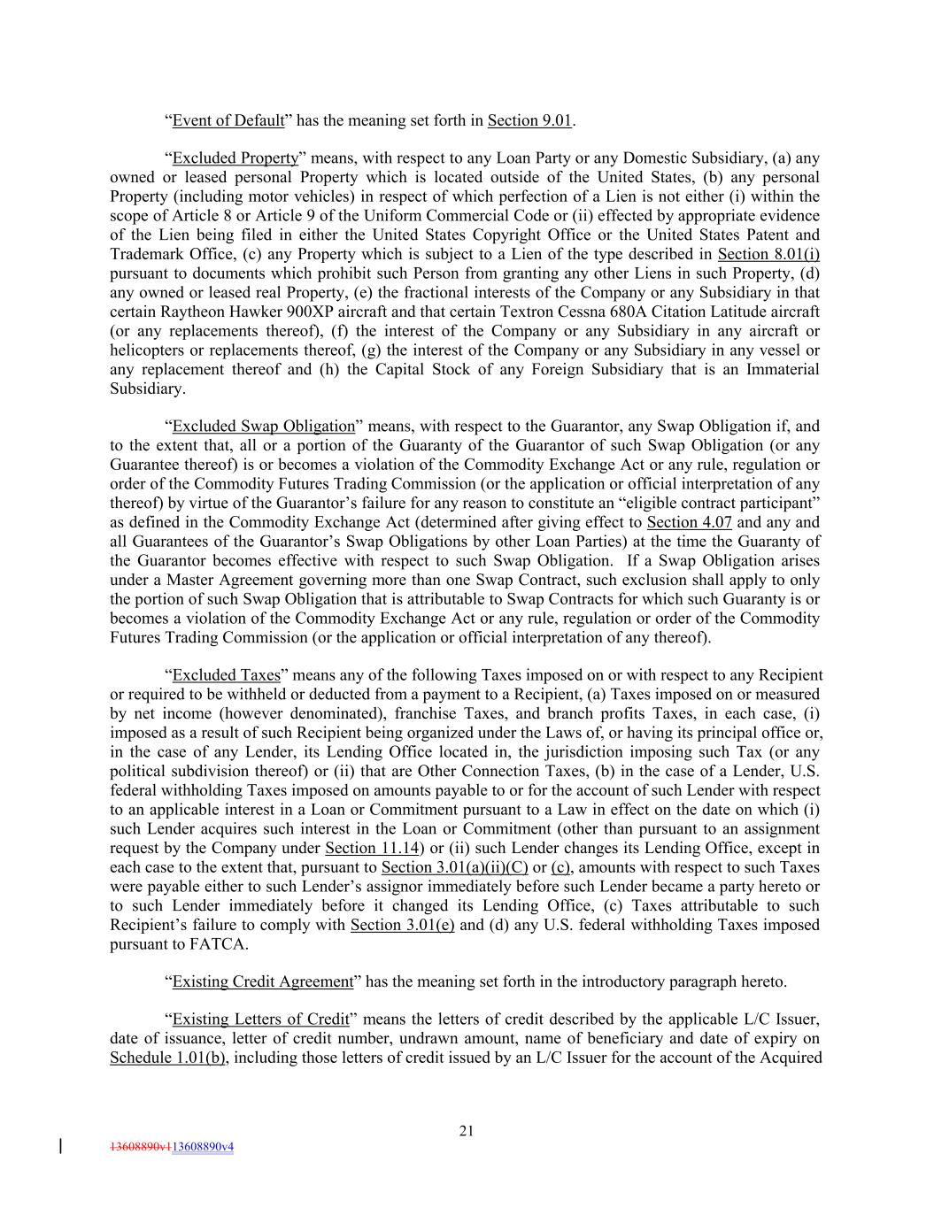 “Event of Default” has the meaning set forth in Section 9.01. “Excluded Property” means, with respect to any Loan Party or any Domestic Subsidiary, (a) any owned or leased personal Property which is located outside of the United States, (b) any personal Property (including motor vehicles) in respect of which perfection of a Lien is not either (i) within the scope of Article 8 or Article 9 of the Uniform Commercial Code or (ii) effected by appropriate evidence of the Lien being filed in either the United States Copyright Office or the United States Patent and Trademark Office, (c) any Property which is subject to a Lien of the type described in Section 8.01(i) pursuant to documents which prohibit such Person from granting any other Liens in such Property, (d) any owned or leased real Property, (e) the fractional interests of the Company or any Subsidiary in that certain Raytheon Hawker 900XP aircraft and that certain Textron Cessna 680A Citation Latitude aircraft (or any replacements thereof), (f) the interest of the Company or any Subsidiary in any aircraft or helicopters or replacements thereof, (g) the interest of the Company or any Subsidiary in any vessel or any replacement thereof and (h) the Capital Stock of any Foreign Subsidiary that is an Immaterial Subsidiary. “Excluded Swap Obligation” means, with respect to the Guarantor, any Swap Obligation if, and to the extent that, all or a portion of the Guaranty of the Guarantor of such Swap Obligation (or any Guarantee thereof) is or becomes a violation of the Commodity Exchange Act or any rule, regulation or order of the Commodity Futures Trading Commission (or the application or official interpretation of any thereof) by virtue of the Guarantor’s failure for any reason to constitute an “eligible contract participant” as defined in the Commodity Exchange Act (determined after giving effect to Section 4.07 and any and all Guarantees of the Guarantor’s Swap Obligations by other Loan Parties) at the time the Guaranty of the Guarantor becomes effective with respect to such Swap Obligation. If a Swap Obligation arises under a Master Agreement governing more than one Swap Contract, such exclusion shall apply to only the portion of such Swap Obligation that is attributable to Swap Contracts for which such Guaranty is or becomes a violation of the Commodity Exchange Act or any rule, regulation or order of the Commodity Futures Trading Commission (or the application or official interpretation of any thereof). “Excluded Taxes” means any of the following Taxes imposed on or with respect to any Recipient or required to be withheld or deducted from a payment to a Recipient, (a) Taxes imposed on or measured by net income (however denominated), franchise Taxes, and branch profits Taxes, in each case, (i) imposed as a result of such Recipient being organized under the Laws of, or having its principal office or, in the case of any Lender, its Lending Office located in, the jurisdiction imposing such Tax (or any political subdivision thereof) or (ii) that are Other Connection Taxes, (b) in the case of a Lender, U.S. federal withholding Taxes imposed on amounts payable to or for the account of such Lender with respect to an applicable interest in a Loan or Commitment pursuant to a Law in effect on the date on which (i) such Lender acquires such interest in the Loan or Commitment (other than pursuant to an assignment request by the Company under Section 11.14) or (ii) such Lender changes its Lending Office, except in each case to the extent that, pursuant to Section 3.01(a)(ii)(C) or (c), amounts with respect to such Taxes were payable either to such Lender’s assignor immediately before such Lender became a party hereto or to such Lender immediately before it changed its Lending Office, (c) Taxes attributable to such Recipient’s failure to comply with Section 3.01(e) and (d) any U.S. federal withholding Taxes imposed pursuant to FATCA. “Existing Credit Agreement” has the meaning set forth in the introductory paragraph hereto. “Existing Letters of Credit” means the letters of credit described by the applicable L/C Issuer, date of issuance, letter of credit number, undrawn amount, name of beneficiary and date of expiry on Schedule 1.01(b), including those letters of credit issued by an L/C Issuer for the account of the Acquired 21 13608890v113608890v4