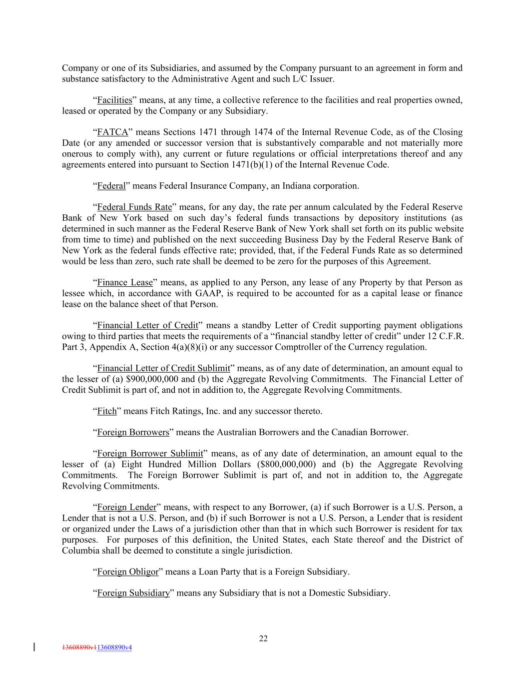 Company or one of its Subsidiaries, and assumed by the Company pursuant to an agreement in form and substance satisfactory to the Administrative Agent and such L/C Issuer. “Facilities” means, at any time, a collective reference to the facilities and real properties owned, leased or operated by the Company or any Subsidiary. “FATCA” means Sections 1471 through 1474 of the Internal Revenue Code, as of the Closing Date (or any amended or successor version that is substantively comparable and not materially more onerous to comply with), any current or future regulations or official interpretations thereof and any agreements entered into pursuant to Section 1471(b)(1) of the Internal Revenue Code. “Federal” means Federal Insurance Company, an Indiana corporation. “Federal Funds Rate” means, for any day, the rate per annum calculated by the Federal Reserve Bank of New York based on such day’s federal funds transactions by depository institutions (as determined in such manner as the Federal Reserve Bank of New York shall set forth on its public website from time to time) and published on the next succeeding Business Day by the Federal Reserve Bank of New York as the federal funds effective rate; provided, that, if the Federal Funds Rate as so determined would be less than zero, such rate shall be deemed to be zero for the purposes of this Agreement. “Finance Lease” means, as applied to any Person, any lease of any Property by that Person as lessee which, in accordance with GAAP, is required to be accounted for as a capital lease or finance lease on the balance sheet of that Person. “Financial Letter of Credit” means a standby Letter of Credit supporting payment obligations owing to third parties that meets the requirements of a “financial standby letter of credit” under 12 C.F.R. Part 3, Appendix A, Section 4(a)(8)(i) or any successor Comptroller of the Currency regulation. “Financial Letter of Credit Sublimit” means, as of any date of determination, an amount equal to the lesser of (a) $900,000,000 and (b) the Aggregate Revolving Commitments. The Financial Letter of Credit Sublimit is part of, and not in addition to, the Aggregate Revolving Commitments. “Fitch” means Fitch Ratings, Inc. and any successor thereto. “Foreign Borrowers” means the Australian Borrowers and the Canadian Borrower. “Foreign Borrower Sublimit” means, as of any date of determination, an amount equal to the lesser of (a) Eight Hundred Million Dollars ($800,000,000) and (b) the Aggregate Revolving Commitments. The Foreign Borrower Sublimit is part of, and not in addition to, the Aggregate Revolving Commitments. “Foreign Lender” means, with respect to any Borrower, (a) if such Borrower is a U.S. Person, a Lender that is not a U.S. Person, and (b) if such Borrower is not a U.S. Person, a Lender that is resident or organized under the Laws of a jurisdiction other than that in which such Borrower is resident for tax purposes. For purposes of this definition, the United States, each State thereof and the District of Columbia shall be deemed to constitute a single jurisdiction. “Foreign Obligor” means a Loan Party that is a Foreign Subsidiary. “Foreign Subsidiary” means any Subsidiary that is not a Domestic Subsidiary. 22 13608890v113608890v4