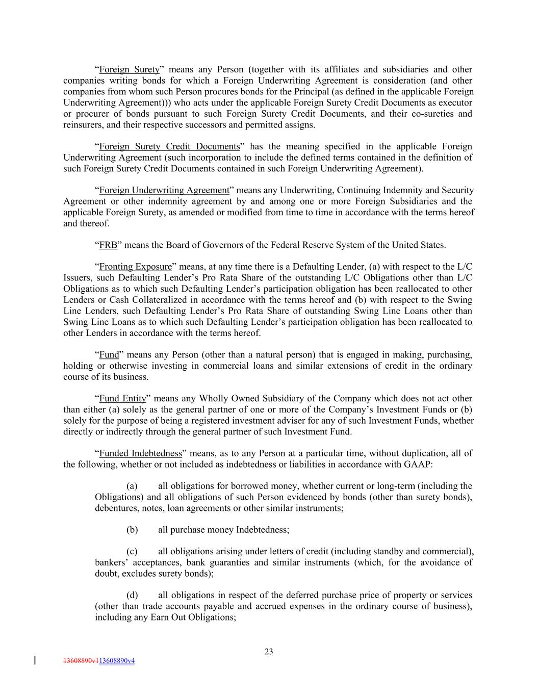 “Foreign Surety” means any Person (together with its affiliates and subsidiaries and other companies writing bonds for which a Foreign Underwriting Agreement is consideration (and other companies from whom such Person procures bonds for the Principal (as defined in the applicable Foreign Underwriting Agreement))) who acts under the applicable Foreign Surety Credit Documents as executor or procurer of bonds pursuant to such Foreign Surety Credit Documents, and their co-sureties and reinsurers, and their respective successors and permitted assigns. “Foreign Surety Credit Documents” has the meaning specified in the applicable Foreign Underwriting Agreement (such incorporation to include the defined terms contained in the definition of such Foreign Surety Credit Documents contained in such Foreign Underwriting Agreement). “Foreign Underwriting Agreement” means any Underwriting, Continuing Indemnity and Security Agreement or other indemnity agreement by and among one or more Foreign Subsidiaries and the applicable Foreign Surety, as amended or modified from time to time in accordance with the terms hereof and thereof. “FRB” means the Board of Governors of the Federal Reserve System of the United States. “Fronting Exposure” means, at any time there is a Defaulting Lender, (a) with respect to the L/C Issuers, such Defaulting Lender’s Pro Rata Share of the outstanding L/C Obligations other than L/C Obligations as to which such Defaulting Lender’s participation obligation has been reallocated to other Lenders or Cash Collateralized in accordance with the terms hereof and (b) with respect to the Swing Line Lenders, such Defaulting Lender’s Pro Rata Share of outstanding Swing Line Loans other than Swing Line Loans as to which such Defaulting Lender’s participation obligation has been reallocated to other Lenders in accordance with the terms hereof. “Fund” means any Person (other than a natural person) that is engaged in making, purchasing, holding or otherwise investing in commercial loans and similar extensions of credit in the ordinary course of its business. “Fund Entity” means any Wholly Owned Subsidiary of the Company which does not act other than either (a) solely as the general partner of one or more of the Company’s Investment Funds or (b) solely for the purpose of being a registered investment adviser for any of such Investment Funds, whether directly or indirectly through the general partner of such Investment Fund. “Funded Indebtedness” means, as to any Person at a particular time, without duplication, all of the following, whether or not included as indebtedness or liabilities in accordance with GAAP: (a) all obligations for borrowed money, whether current or long-term (including the Obligations) and all obligations of such Person evidenced by bonds (other than surety bonds), debentures, notes, loan agreements or other similar instruments; (b) all purchase money Indebtedness; (c) all obligations arising under letters of credit (including standby and commercial), bankers’ acceptances, bank guaranties and similar instruments (which, for the avoidance of doubt, excludes surety bonds); (d) all obligations in respect of the deferred purchase price of property or services (other than trade accounts payable and accrued expenses in the ordinary course of business), including any Earn Out Obligations; 23 13608890v113608890v4