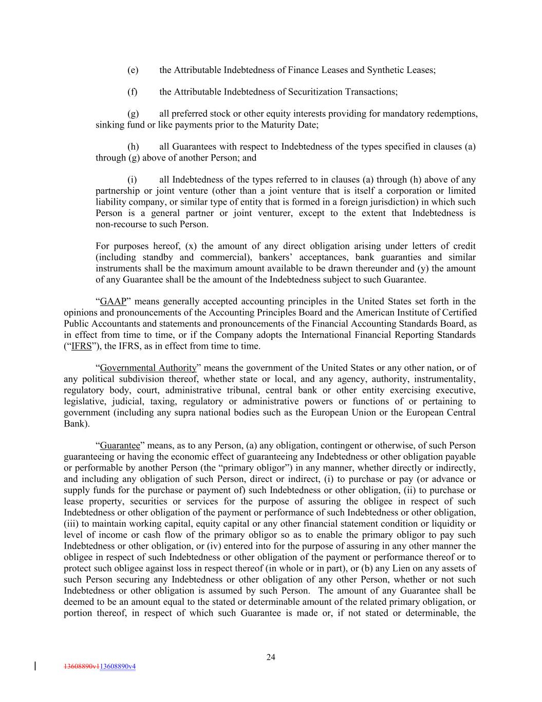 (e) the Attributable Indebtedness of Finance Leases and Synthetic Leases; (f) the Attributable Indebtedness of Securitization Transactions; (g) all preferred stock or other equity interests providing for mandatory redemptions, sinking fund or like payments prior to the Maturity Date; (h) all Guarantees with respect to Indebtedness of the types specified in clauses (a) through (g) above of another Person; and (i) all Indebtedness of the types referred to in clauses (a) through (h) above of any partnership or joint venture (other than a joint venture that is itself a corporation or limited liability company, or similar type of entity that is formed in a foreign jurisdiction) in which such Person is a general partner or joint venturer, except to the extent that Indebtedness is non-recourse to such Person. For purposes hereof, (x) the amount of any direct obligation arising under letters of credit (including standby and commercial), bankers’ acceptances, bank guaranties and similar instruments shall be the maximum amount available to be drawn thereunder and (y) the amount of any Guarantee shall be the amount of the Indebtedness subject to such Guarantee. “GAAP” means generally accepted accounting principles in the United States set forth in the opinions and pronouncements of the Accounting Principles Board and the American Institute of Certified Public Accountants and statements and pronouncements of the Financial Accounting Standards Board, as in effect from time to time, or if the Company adopts the International Financial Reporting Standards (“IFRS”), the IFRS, as in effect from time to time. “Governmental Authority” means the government of the United States or any other nation, or of any political subdivision thereof, whether state or local, and any agency, authority, instrumentality, regulatory body, court, administrative tribunal, central bank or other entity exercising executive, legislative, judicial, taxing, regulatory or administrative powers or functions of or pertaining to government (including any supra national bodies such as the European Union or the European Central Bank). “Guarantee” means, as to any Person, (a) any obligation, contingent or otherwise, of such Person guaranteeing or having the economic effect of guaranteeing any Indebtedness or other obligation payable or performable by another Person (the “primary obligor”) in any manner, whether directly or indirectly, and including any obligation of such Person, direct or indirect, (i) to purchase or pay (or advance or supply funds for the purchase or payment of) such Indebtedness or other obligation, (ii) to purchase or lease property, securities or services for the purpose of assuring the obligee in respect of such Indebtedness or other obligation of the payment or performance of such Indebtedness or other obligation, (iii) to maintain working capital, equity capital or any other financial statement condition or liquidity or level of income or cash flow of the primary obligor so as to enable the primary obligor to pay such Indebtedness or other obligation, or (iv) entered into for the purpose of assuring in any other manner the obligee in respect of such Indebtedness or other obligation of the payment or performance thereof or to protect such obligee against loss in respect thereof (in whole or in part), or (b) any Lien on any assets of such Person securing any Indebtedness or other obligation of any other Person, whether or not such Indebtedness or other obligation is assumed by such Person. The amount of any Guarantee shall be deemed to be an amount equal to the stated or determinable amount of the related primary obligation, or portion thereof, in respect of which such Guarantee is made or, if not stated or determinable, the 24 13608890v113608890v4