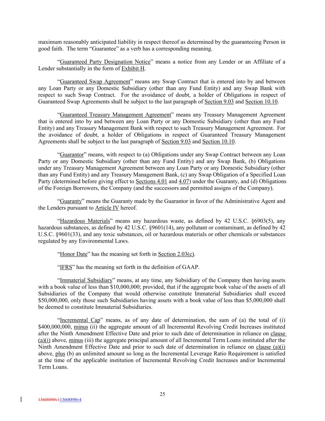 maximum reasonably anticipated liability in respect thereof as determined by the guaranteeing Person in good faith. The term “Guarantee” as a verb has a corresponding meaning. “Guaranteed Party Designation Notice” means a notice from any Lender or an Affiliate of a Lender substantially in the form of Exhibit H. “Guaranteed Swap Agreement” means any Swap Contract that is entered into by and between any Loan Party or any Domestic Subsidiary (other than any Fund Entity) and any Swap Bank with respect to such Swap Contract. For the avoidance of doubt, a holder of Obligations in respect of Guaranteed Swap Agreements shall be subject to the last paragraph of Section 9.03 and Section 10.10. “Guaranteed Treasury Management Agreement” means any Treasury Management Agreement that is entered into by and between any Loan Party or any Domestic Subsidiary (other than any Fund Entity) and any Treasury Management Bank with respect to such Treasury Management Agreement. For the avoidance of doubt, a holder of Obligations in respect of Guaranteed Treasury Management Agreements shall be subject to the last paragraph of Section 9.03 and Section 10.10. “Guarantor” means, with respect to (a) Obligations under any Swap Contract between any Loan Party or any Domestic Subsidiary (other than any Fund Entity) and any Swap Bank, (b) Obligations under any Treasury Management Agreement between any Loan Party or any Domestic Subsidiary (other than any Fund Entity) and any Treasury Management Bank, (c) any Swap Obligation of a Specified Loan Party (determined before giving effect to Sections 4.01 and 4.07) under the Guaranty, and (d) Obligations of the Foreign Borrowers, the Company (and the successors and permitted assigns of the Company). “Guaranty” means the Guaranty made by the Guarantor in favor of the Administrative Agent and the Lenders pursuant to Article IV hereof. “Hazardous Materials” means any hazardous waste, as defined by 42 U.S.C. §6903(5), any hazardous substances, as defined by 42 U.S.C. §9601(14), any pollutant or contaminant, as defined by 42 U.S.C. §9601(33), and any toxic substances, oil or hazardous materials or other chemicals or substances regulated by any Environmental Laws. “Honor Date” has the meaning set forth in Section 2.03(c). “IFRS” has the meaning set forth in the definition of GAAP. “Immaterial Subsidiary” means, at any time, any Subsidiary of the Company then having assets with a book value of less than $10,000,000; provided, that if the aggregate book value of the assets of all Subsidiaries of the Company that would otherwise constitute Immaterial Subsidiaries shall exceed $50,000,000, only those such Subsidiaries having assets with a book value of less than $5,000,000 shall be deemed to constitute Immaterial Subsidiaries. “Incremental Cap” means, as of any date of determination, the sum of (a) the total of (i) $400,000,000, minus (ii) the aggregate amount of all Incremental Revolving Credit Increases instituted after the Ninth Amendment Effective Date and prior to such date of determination in reliance on clause (a)(i) above, minus (iii) the aggregate principal amount of all Incremental Term Loans instituted after the Ninth Amendment Effective Date and prior to such date of determination in reliance on clause (a)(i) above, plus (b) an unlimited amount so long as the Incremental Leverage Ratio Requirement is satisfied at the time of the applicable institution of Incremental Revolving Credit Increases and/or Incremental Term Loans. 25 13608890v113608890v4