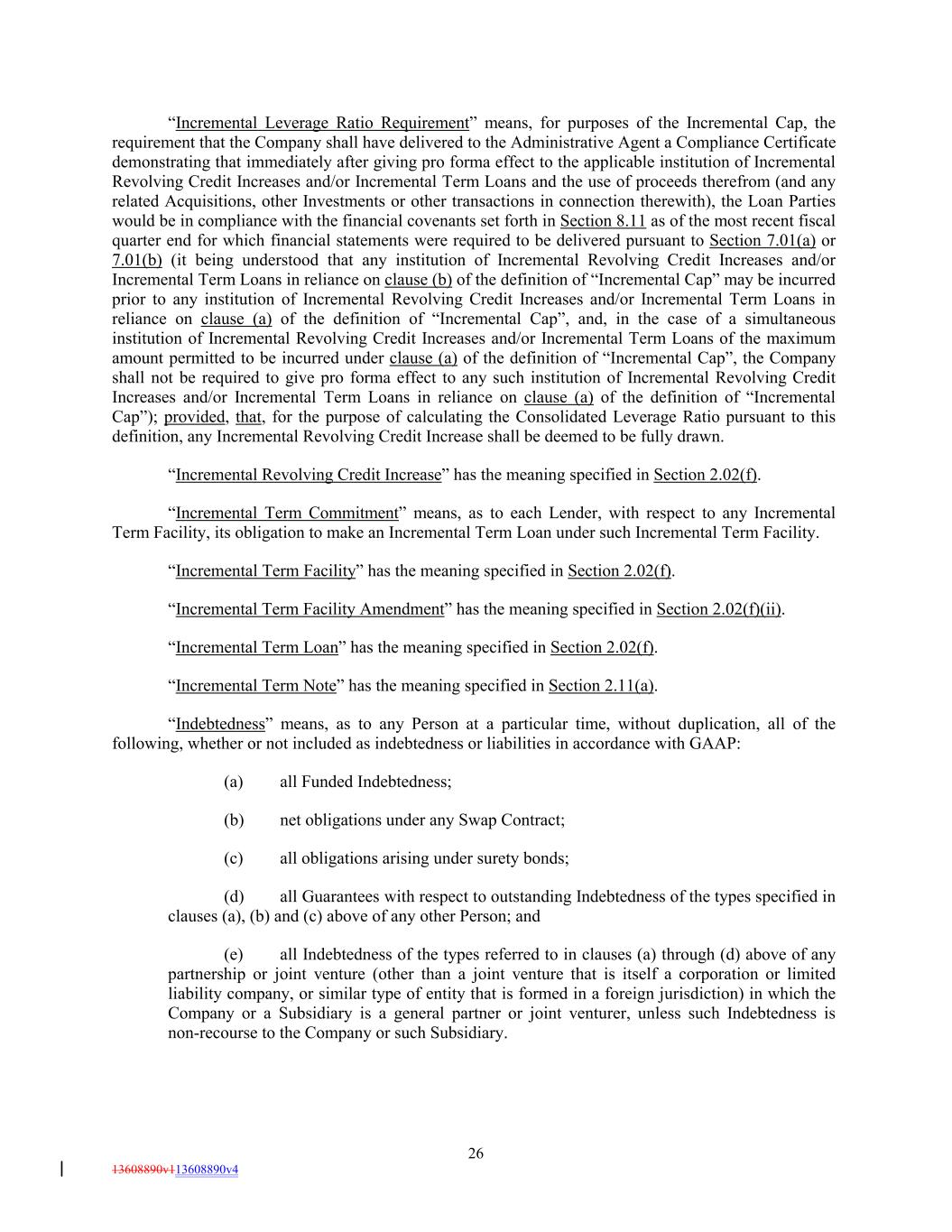 “Incremental Leverage Ratio Requirement” means, for purposes of the Incremental Cap, the requirement that the Company shall have delivered to the Administrative Agent a Compliance Certificate demonstrating that immediately after giving pro forma effect to the applicable institution of Incremental Revolving Credit Increases and/or Incremental Term Loans and the use of proceeds therefrom (and any related Acquisitions, other Investments or other transactions in connection therewith), the Loan Parties would be in compliance with the financial covenants set forth in Section 8.11 as of the most recent fiscal quarter end for which financial statements were required to be delivered pursuant to Section 7.01(a) or 7.01(b) (it being understood that any institution of Incremental Revolving Credit Increases and/or Incremental Term Loans in reliance on clause (b) of the definition of “Incremental Cap” may be incurred prior to any institution of Incremental Revolving Credit Increases and/or Incremental Term Loans in reliance on clause (a) of the definition of “Incremental Cap”, and, in the case of a simultaneous institution of Incremental Revolving Credit Increases and/or Incremental Term Loans of the maximum amount permitted to be incurred under clause (a) of the definition of “Incremental Cap”, the Company shall not be required to give pro forma effect to any such institution of Incremental Revolving Credit Increases and/or Incremental Term Loans in reliance on clause (a) of the definition of “Incremental Cap”); provided, that, for the purpose of calculating the Consolidated Leverage Ratio pursuant to this definition, any Incremental Revolving Credit Increase shall be deemed to be fully drawn. “Incremental Revolving Credit Increase” has the meaning specified in Section 2.02(f). “Incremental Term Commitment” means, as to each Lender, with respect to any Incremental Term Facility, its obligation to make an Incremental Term Loan under such Incremental Term Facility. “Incremental Term Facility” has the meaning specified in Section 2.02(f). “Incremental Term Facility Amendment” has the meaning specified in Section 2.02(f)(ii). “Incremental Term Loan” has the meaning specified in Section 2.02(f). “Incremental Term Note” has the meaning specified in Section 2.11(a). “Indebtedness” means, as to any Person at a particular time, without duplication, all of the following, whether or not included as indebtedness or liabilities in accordance with GAAP: (a) all Funded Indebtedness; (b) net obligations under any Swap Contract; (c) all obligations arising under surety bonds; (d) all Guarantees with respect to outstanding Indebtedness of the types specified in clauses (a), (b) and (c) above of any other Person; and (e) all Indebtedness of the types referred to in clauses (a) through (d) above of any partnership or joint venture (other than a joint venture that is itself a corporation or limited liability company, or similar type of entity that is formed in a foreign jurisdiction) in which the Company or a Subsidiary is a general partner or joint venturer, unless such Indebtedness is non-recourse to the Company or such Subsidiary. 26 13608890v113608890v4