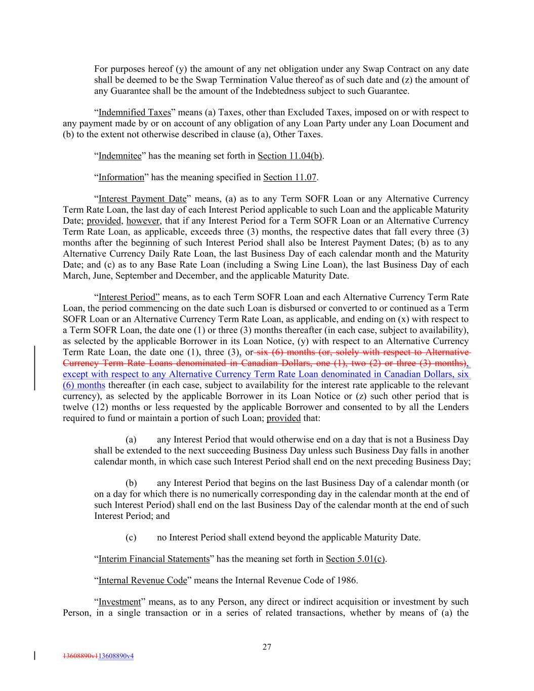 For purposes hereof (y) the amount of any net obligation under any Swap Contract on any date shall be deemed to be the Swap Termination Value thereof as of such date and (z) the amount of any Guarantee shall be the amount of the Indebtedness subject to such Guarantee. “Indemnified Taxes” means (a) Taxes, other than Excluded Taxes, imposed on or with respect to any payment made by or on account of any obligation of any Loan Party under any Loan Document and (b) to the extent not otherwise described in clause (a), Other Taxes. “Indemnitee” has the meaning set forth in Section 11.04(b). “Information” has the meaning specified in Section 11.07. “Interest Payment Date” means, (a) as to any Term SOFR Loan or any Alternative Currency Term Rate Loan, the last day of each Interest Period applicable to such Loan and the applicable Maturity Date; provided, however, that if any Interest Period for a Term SOFR Loan or an Alternative Currency Term Rate Loan, as applicable, exceeds three (3) months, the respective dates that fall every three (3) months after the beginning of such Interest Period shall also be Interest Payment Dates; (b) as to any Alternative Currency Daily Rate Loan, the last Business Day of each calendar month and the Maturity Date; and (c) as to any Base Rate Loan (including a Swing Line Loan), the last Business Day of each March, June, September and December, and the applicable Maturity Date. “Interest Period” means, as to each Term SOFR Loan and each Alternative Currency Term Rate Loan, the period commencing on the date such Loan is disbursed or converted to or continued as a Term SOFR Loan or an Alternative Currency Term Rate Loan, as applicable, and ending on (x) with respect to a Term SOFR Loan, the date one (1) or three (3) months thereafter (in each case, subject to availability), as selected by the applicable Borrower in its Loan Notice, (y) with respect to an Alternative Currency Term Rate Loan, the date one (1), three (3), or six (6) months (or, solely with respect to Alternative Currency Term Rate Loans denominated in Canadian Dollars, one (1), two (2) or three (3) months), except with respect to any Alternative Currency Term Rate Loan denominated in Canadian Dollars, six (6) months thereafter (in each case, subject to availability for the interest rate applicable to the relevant currency), as selected by the applicable Borrower in its Loan Notice or (z) such other period that is twelve (12) months or less requested by the applicable Borrower and consented to by all the Lenders required to fund or maintain a portion of such Loan; provided that: (a) any Interest Period that would otherwise end on a day that is not a Business Day shall be extended to the next succeeding Business Day unless such Business Day falls in another calendar month, in which case such Interest Period shall end on the next preceding Business Day; (b) any Interest Period that begins on the last Business Day of a calendar month (or on a day for which there is no numerically corresponding day in the calendar month at the end of such Interest Period) shall end on the last Business Day of the calendar month at the end of such Interest Period; and (c) no Interest Period shall extend beyond the applicable Maturity Date. “Interim Financial Statements” has the meaning set forth in Section 5.01(c). “Internal Revenue Code” means the Internal Revenue Code of 1986. “Investment” means, as to any Person, any direct or indirect acquisition or investment by such Person, in a single transaction or in a series of related transactions, whether by means of (a) the 27 13608890v113608890v4