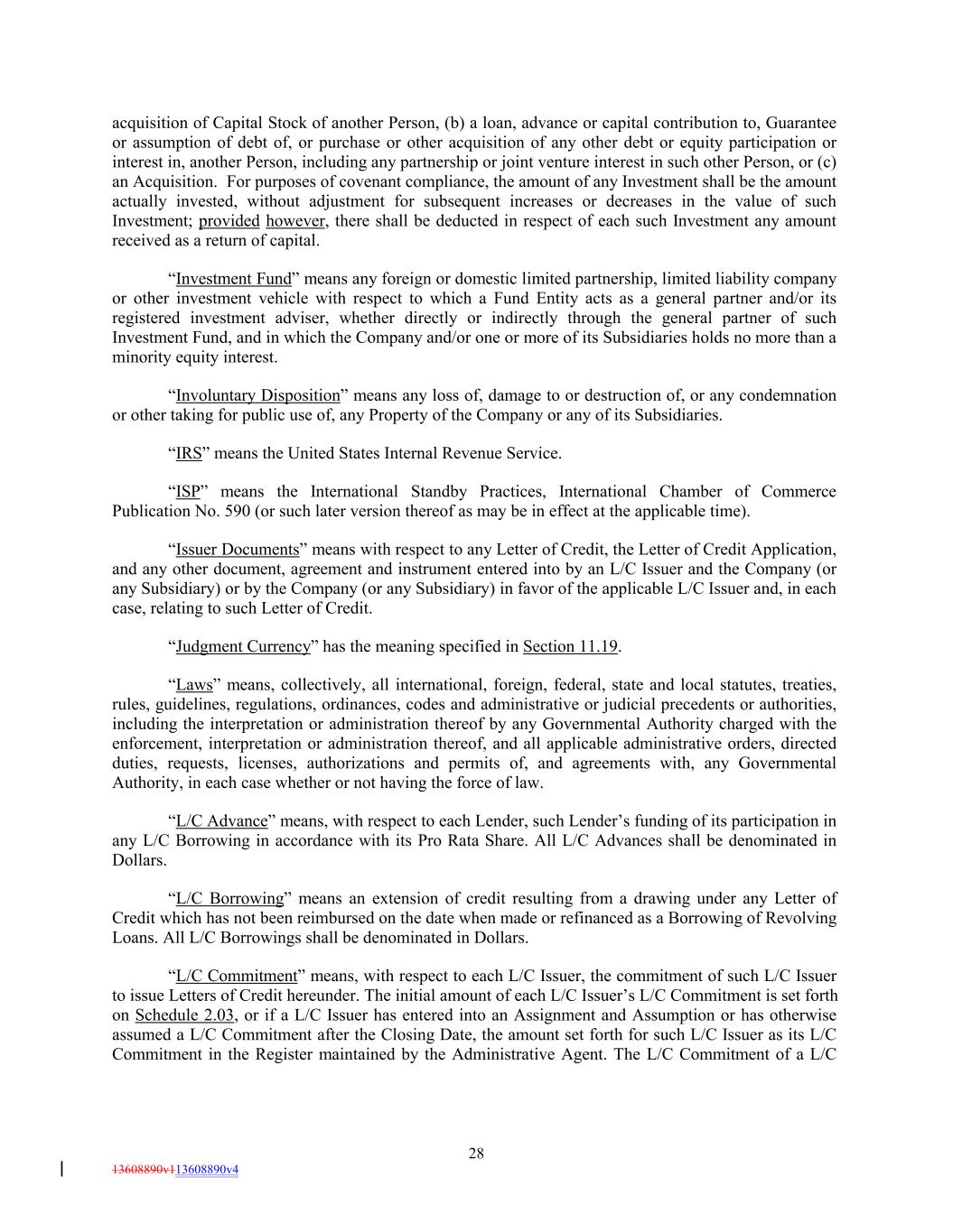 acquisition of Capital Stock of another Person, (b) a loan, advance or capital contribution to, Guarantee or assumption of debt of, or purchase or other acquisition of any other debt or equity participation or interest in, another Person, including any partnership or joint venture interest in such other Person, or (c) an Acquisition. For purposes of covenant compliance, the amount of any Investment shall be the amount actually invested, without adjustment for subsequent increases or decreases in the value of such Investment; provided however, there shall be deducted in respect of each such Investment any amount received as a return of capital. “Investment Fund” means any foreign or domestic limited partnership, limited liability company or other investment vehicle with respect to which a Fund Entity acts as a general partner and/or its registered investment adviser, whether directly or indirectly through the general partner of such Investment Fund, and in which the Company and/or one or more of its Subsidiaries holds no more than a minority equity interest. “Involuntary Disposition” means any loss of, damage to or destruction of, or any condemnation or other taking for public use of, any Property of the Company or any of its Subsidiaries. “IRS” means the United States Internal Revenue Service. “ISP” means the International Standby Practices, International Chamber of Commerce Publication No. 590 (or such later version thereof as may be in effect at the applicable time). “Issuer Documents” means with respect to any Letter of Credit, the Letter of Credit Application, and any other document, agreement and instrument entered into by an L/C Issuer and the Company (or any Subsidiary) or by the Company (or any Subsidiary) in favor of the applicable L/C Issuer and, in each case, relating to such Letter of Credit. “Judgment Currency” has the meaning specified in Section 11.19. “Laws” means, collectively, all international, foreign, federal, state and local statutes, treaties, rules, guidelines, regulations, ordinances, codes and administrative or judicial precedents or authorities, including the interpretation or administration thereof by any Governmental Authority charged with the enforcement, interpretation or administration thereof, and all applicable administrative orders, directed duties, requests, licenses, authorizations and permits of, and agreements with, any Governmental Authority, in each case whether or not having the force of law. “L/C Advance” means, with respect to each Lender, such Lender’s funding of its participation in any L/C Borrowing in accordance with its Pro Rata Share. All L/C Advances shall be denominated in Dollars. “L/C Borrowing” means an extension of credit resulting from a drawing under any Letter of Credit which has not been reimbursed on the date when made or refinanced as a Borrowing of Revolving Loans. All L/C Borrowings shall be denominated in Dollars. “L/C Commitment” means, with respect to each L/C Issuer, the commitment of such L/C Issuer to issue Letters of Credit hereunder. The initial amount of each L/C Issuer’s L/C Commitment is set forth on Schedule 2.03, or if a L/C Issuer has entered into an Assignment and Assumption or has otherwise assumed a L/C Commitment after the Closing Date, the amount set forth for such L/C Issuer as its L/C Commitment in the Register maintained by the Administrative Agent. The L/C Commitment of a L/C 28 13608890v113608890v4