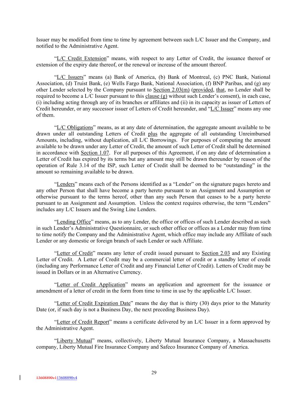 Issuer may be modified from time to time by agreement between such L/C Issuer and the Company, and notified to the Administrative Agent. “L/C Credit Extension” means, with respect to any Letter of Credit, the issuance thereof or extension of the expiry date thereof, or the renewal or increase of the amount thereof. “L/C Issuers” means (a) Bank of America, (b) Bank of Montreal, (c) PNC Bank, National Association, (d) Truist Bank, (e) Wells Fargo Bank, National Association, (f) BNP Paribas, and (g) any other Lender selected by the Company pursuant to Section 2.03(m) (provided, that, no Lender shall be required to become a L/C Issuer pursuant to this clause (g) without such Lender’s consent), in each case, (i) including acting through any of its branches or affiliates and (ii) in its capacity as issuer of Letters of Credit hereunder, or any successor issuer of Letters of Credit hereunder, and “L/C Issuer” means any one of them. “L/C Obligations” means, as at any date of determination, the aggregate amount available to be drawn under all outstanding Letters of Credit plus the aggregate of all outstanding Unreimbursed Amounts, including, without duplication, all L/C Borrowings. For purposes of computing the amount available to be drawn under any Letter of Credit, the amount of such Letter of Credit shall be determined in accordance with Section 1.07. For all purposes of this Agreement, if on any date of determination a Letter of Credit has expired by its terms but any amount may still be drawn thereunder by reason of the operation of Rule 3.14 of the ISP, such Letter of Credit shall be deemed to be “outstanding” in the amount so remaining available to be drawn. “Lenders” means each of the Persons identified as a “Lender” on the signature pages hereto and any other Person that shall have become a party hereto pursuant to an Assignment and Assumption or otherwise pursuant to the terms hereof, other than any such Person that ceases to be a party hereto pursuant to an Assignment and Assumption. Unless the context requires otherwise, the term “Lenders” includes any L/C Issuers and the Swing Line Lenders. “Lending Office” means, as to any Lender, the office or offices of such Lender described as such in such Lender’s Administrative Questionnaire, or such other office or offices as a Lender may from time to time notify the Company and the Administrative Agent, which office may include any Affiliate of such Lender or any domestic or foreign branch of such Lender or such Affiliate. “Letter of Credit” means any letter of credit issued pursuant to Section 2.03 and any Existing Letter of Credit. A Letter of Credit may be a commercial letter of credit or a standby letter of credit (including any Performance Letter of Credit and any Financial Letter of Credit). Letters of Credit may be issued in Dollars or in an Alternative Currency. “Letter of Credit Application” means an application and agreement for the issuance or amendment of a letter of credit in the form from time to time in use by the applicable L/C Issuer. “Letter of Credit Expiration Date” means the day that is thirty (30) days prior to the Maturity Date (or, if such day is not a Business Day, the next preceding Business Day). “Letter of Credit Report” means a certificate delivered by an L/C Issuer in a form approved by the Administrative Agent. “Liberty Mutual” means, collectively, Liberty Mutual Insurance Company, a Massachusetts company, Liberty Mutual Fire Insurance Company and Safeco Insurance Company of America. 29 13608890v113608890v4
