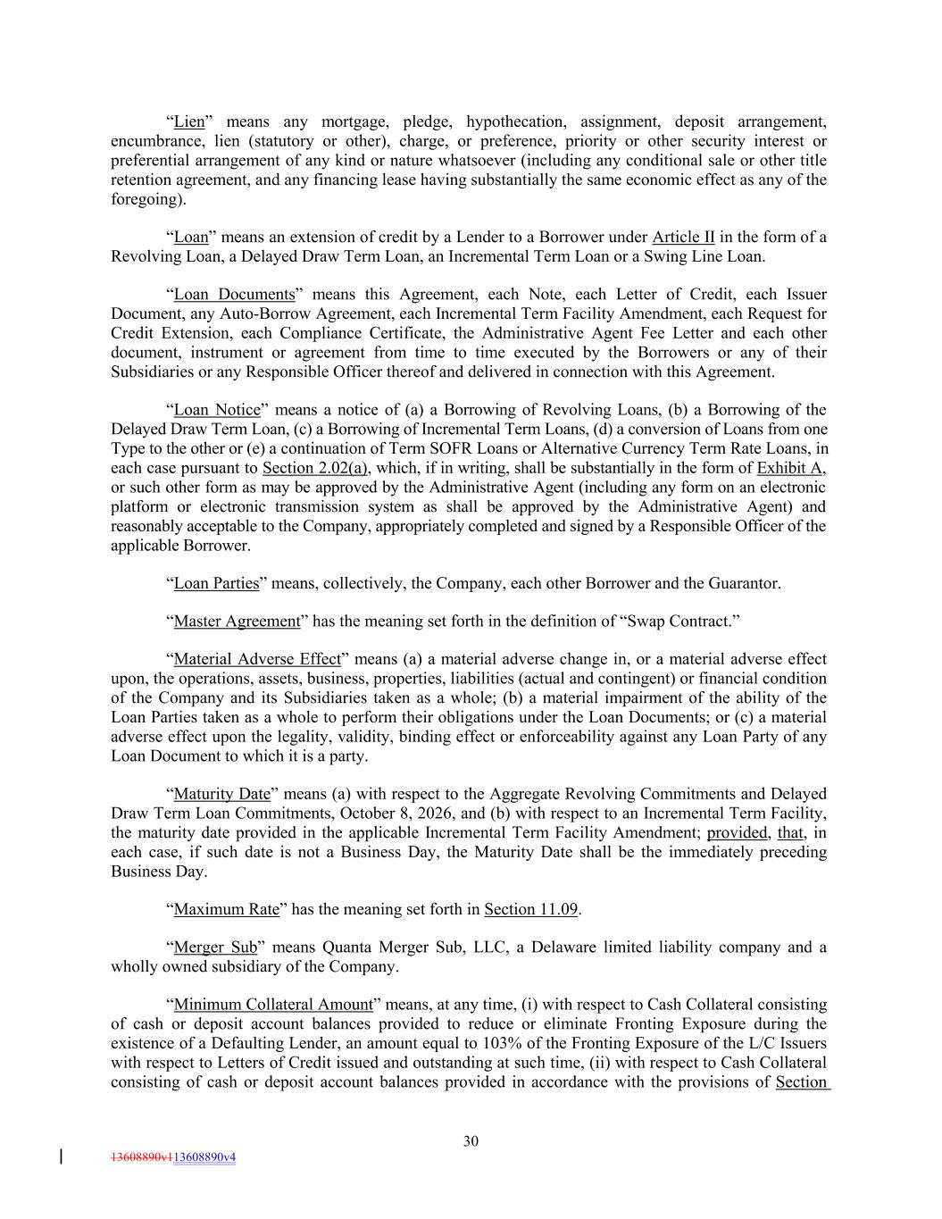 “Lien” means any mortgage, pledge, hypothecation, assignment, deposit arrangement, encumbrance, lien (statutory or other), charge, or preference, priority or other security interest or preferential arrangement of any kind or nature whatsoever (including any conditional sale or other title retention agreement, and any financing lease having substantially the same economic effect as any of the foregoing). “Loan” means an extension of credit by a Lender to a Borrower under Article II in the form of a Revolving Loan, a Delayed Draw Term Loan, an Incremental Term Loan or a Swing Line Loan. “Loan Documents” means this Agreement, each Note, each Letter of Credit, each Issuer Document, any Auto-Borrow Agreement, each Incremental Term Facility Amendment, each Request for Credit Extension, each Compliance Certificate, the Administrative Agent Fee Letter and each other document, instrument or agreement from time to time executed by the Borrowers or any of their Subsidiaries or any Responsible Officer thereof and delivered in connection with this Agreement. “Loan Notice” means a notice of (a) a Borrowing of Revolving Loans, (b) a Borrowing of the Delayed Draw Term Loan, (c) a Borrowing of Incremental Term Loans, (d) a conversion of Loans from one Type to the other or (e) a continuation of Term SOFR Loans or Alternative Currency Term Rate Loans, in each case pursuant to Section 2.02(a), which, if in writing, shall be substantially in the form of Exhibit A, or such other form as may be approved by the Administrative Agent (including any form on an electronic platform or electronic transmission system as shall be approved by the Administrative Agent) and reasonably acceptable to the Company, appropriately completed and signed by a Responsible Officer of the applicable Borrower. “Loan Parties” means, collectively, the Company, each other Borrower and the Guarantor. “Master Agreement” has the meaning set forth in the definition of “Swap Contract.” “Material Adverse Effect” means (a) a material adverse change in, or a material adverse effect upon, the operations, assets, business, properties, liabilities (actual and contingent) or financial condition of the Company and its Subsidiaries taken as a whole; (b) a material impairment of the ability of the Loan Parties taken as a whole to perform their obligations under the Loan Documents; or (c) a material adverse effect upon the legality, validity, binding effect or enforceability against any Loan Party of any Loan Document to which it is a party. “Maturity Date” means (a) with respect to the Aggregate Revolving Commitments and Delayed Draw Term Loan Commitments, October 8, 2026, and (b) with respect to an Incremental Term Facility, the maturity date provided in the applicable Incremental Term Facility Amendment; provided, that, in each case, if such date is not a Business Day, the Maturity Date shall be the immediately preceding Business Day. “Maximum Rate” has the meaning set forth in Section 11.09. “Merger Sub” means Quanta Merger Sub, LLC, a Delaware limited liability company and a wholly owned subsidiary of the Company. “Minimum Collateral Amount” means, at any time, (i) with respect to Cash Collateral consisting of cash or deposit account balances provided to reduce or eliminate Fronting Exposure during the existence of a Defaulting Lender, an amount equal to 103% of the Fronting Exposure of the L/C Issuers with respect to Letters of Credit issued and outstanding at such time, (ii) with respect to Cash Collateral consisting of cash or deposit account balances provided in accordance with the provisions of Section 30 13608890v113608890v4