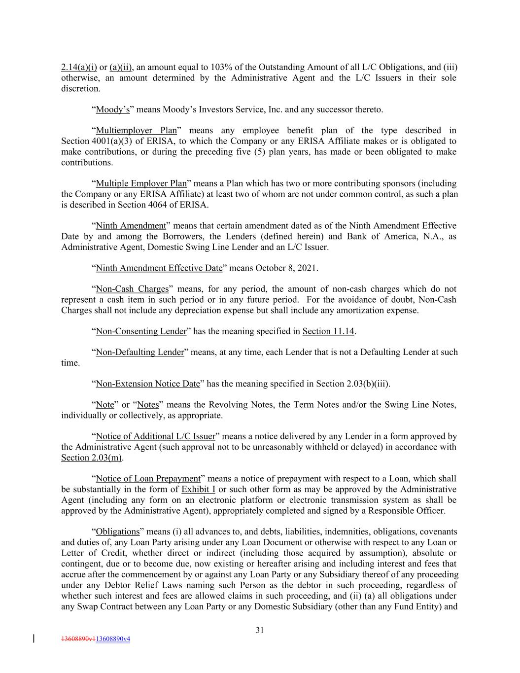 2.14(a)(i) or (a)(ii), an amount equal to 103% of the Outstanding Amount of all L/C Obligations, and (iii) otherwise, an amount determined by the Administrative Agent and the L/C Issuers in their sole discretion. “Moody’s” means Moody’s Investors Service, Inc. and any successor thereto. “Multiemployer Plan” means any employee benefit plan of the type described in Section 4001(a)(3) of ERISA, to which the Company or any ERISA Affiliate makes or is obligated to make contributions, or during the preceding five (5) plan years, has made or been obligated to make contributions. “Multiple Employer Plan” means a Plan which has two or more contributing sponsors (including the Company or any ERISA Affiliate) at least two of whom are not under common control, as such a plan is described in Section 4064 of ERISA. “Ninth Amendment” means that certain amendment dated as of the Ninth Amendment Effective Date by and among the Borrowers, the Lenders (defined herein) and Bank of America, N.A., as Administrative Agent, Domestic Swing Line Lender and an L/C Issuer. “Ninth Amendment Effective Date” means October 8, 2021. “Non-Cash Charges” means, for any period, the amount of non-cash charges which do not represent a cash item in such period or in any future period. For the avoidance of doubt, Non-Cash Charges shall not include any depreciation expense but shall include any amortization expense. “Non-Consenting Lender” has the meaning specified in Section 11.14. “Non-Defaulting Lender” means, at any time, each Lender that is not a Defaulting Lender at such time. “Non-Extension Notice Date” has the meaning specified in Section 2.03(b)(iii). “Note” or “Notes” means the Revolving Notes, the Term Notes and/or the Swing Line Notes, individually or collectively, as appropriate. “Notice of Additional L/C Issuer” means a notice delivered by any Lender in a form approved by the Administrative Agent (such approval not to be unreasonably withheld or delayed) in accordance with Section 2.03(m). “Notice of Loan Prepayment” means a notice of prepayment with respect to a Loan, which shall be substantially in the form of Exhibit I or such other form as may be approved by the Administrative Agent (including any form on an electronic platform or electronic transmission system as shall be approved by the Administrative Agent), appropriately completed and signed by a Responsible Officer. “Obligations” means (i) all advances to, and debts, liabilities, indemnities, obligations, covenants and duties of, any Loan Party arising under any Loan Document or otherwise with respect to any Loan or Letter of Credit, whether direct or indirect (including those acquired by assumption), absolute or contingent, due or to become due, now existing or hereafter arising and including interest and fees that accrue after the commencement by or against any Loan Party or any Subsidiary thereof of any proceeding under any Debtor Relief Laws naming such Person as the debtor in such proceeding, regardless of whether such interest and fees are allowed claims in such proceeding, and (ii) (a) all obligations under any Swap Contract between any Loan Party or any Domestic Subsidiary (other than any Fund Entity) and 31 13608890v113608890v4