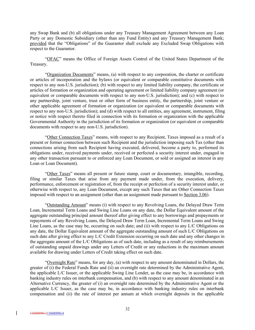 any Swap Bank and (b) all obligations under any Treasury Management Agreement between any Loan Party or any Domestic Subsidiary (other than any Fund Entity) and any Treasury Management Bank; provided that the “Obligations” of the Guarantor shall exclude any Excluded Swap Obligations with respect to the Guarantor. “OFAC” means the Office of Foreign Assets Control of the United States Department of the Treasury. “Organization Documents” means, (a) with respect to any corporation, the charter or certificate or articles of incorporation and the bylaws (or equivalent or comparable constitutive documents with respect to any non-U.S. jurisdiction); (b) with respect to any limited liability company, the certificate or articles of formation or organization and operating agreement or limited liability company agreement (or equivalent or comparable documents with respect to any non-U.S. jurisdiction); and (c) with respect to any partnership, joint venture, trust or other form of business entity, the partnership, joint venture or other applicable agreement of formation or organization (or equivalent or comparable documents with respect to any non-U.S. jurisdiction); and (d) with respect to all entities, any agreement, instrument, filing or notice with respect thereto filed in connection with its formation or organization with the applicable Governmental Authority in the jurisdiction of its formation or organization (or equivalent or comparable documents with respect to any non-U.S. jurisdiction). “Other Connection Taxes” means, with respect to any Recipient, Taxes imposed as a result of a present or former connection between such Recipient and the jurisdiction imposing such Tax (other than connections arising from such Recipient having executed, delivered, become a party to, performed its obligations under, received payments under, received or perfected a security interest under, engaged in any other transaction pursuant to or enforced any Loan Document, or sold or assigned an interest in any Loan or Loan Document). “Other Taxes” means all present or future stamp, court or documentary, intangible, recording, filing or similar Taxes that arise from any payment made under, from the execution, delivery, performance, enforcement or registration of, from the receipt or perfection of a security interest under, or otherwise with respect to, any Loan Document, except any such Taxes that are Other Connection Taxes imposed with respect to an assignment (other than an assignment made pursuant to Section 3.06). “Outstanding Amount” means (i) with respect to any Revolving Loans, the Delayed Draw Term Loan, Incremental Term Loans and Swing Line Loans on any date, the Dollar Equivalent amount of the aggregate outstanding principal amount thereof after giving effect to any borrowings and prepayments or repayments of any Revolving Loans, the Delayed Draw Term Loan, Incremental Term Loans and Swing Line Loans, as the case may be, occurring on such date; and (ii) with respect to any L/C Obligations on any date, the Dollar Equivalent amount of the aggregate outstanding amount of such L/C Obligations on such date after giving effect to any L/C Credit Extension occurring on such date and any other changes in the aggregate amount of the L/C Obligations as of such date, including as a result of any reimbursements of outstanding unpaid drawings under any Letters of Credit or any reductions in the maximum amount available for drawing under Letters of Credit taking effect on such date. “Overnight Rate” means, for any day, (a) with respect to any amount denominated in Dollars, the greater of (i) the Federal Funds Rate and (ii) an overnight rate determined by the Administrative Agent, the applicable L/C Issuer, or the applicable Swing Line Lender, as the case may be, in accordance with banking industry rules on interbank compensation, and (b) with respect to any amount denominated in an Alternative Currency, the greater of (i) an overnight rate determined by the Administrative Agent or the applicable L/C Issuer, as the case may be, in accordance with banking industry rules on interbank compensation and (ii) the rate of interest per annum at which overnight deposits in the applicable 32 13608890v113608890v4