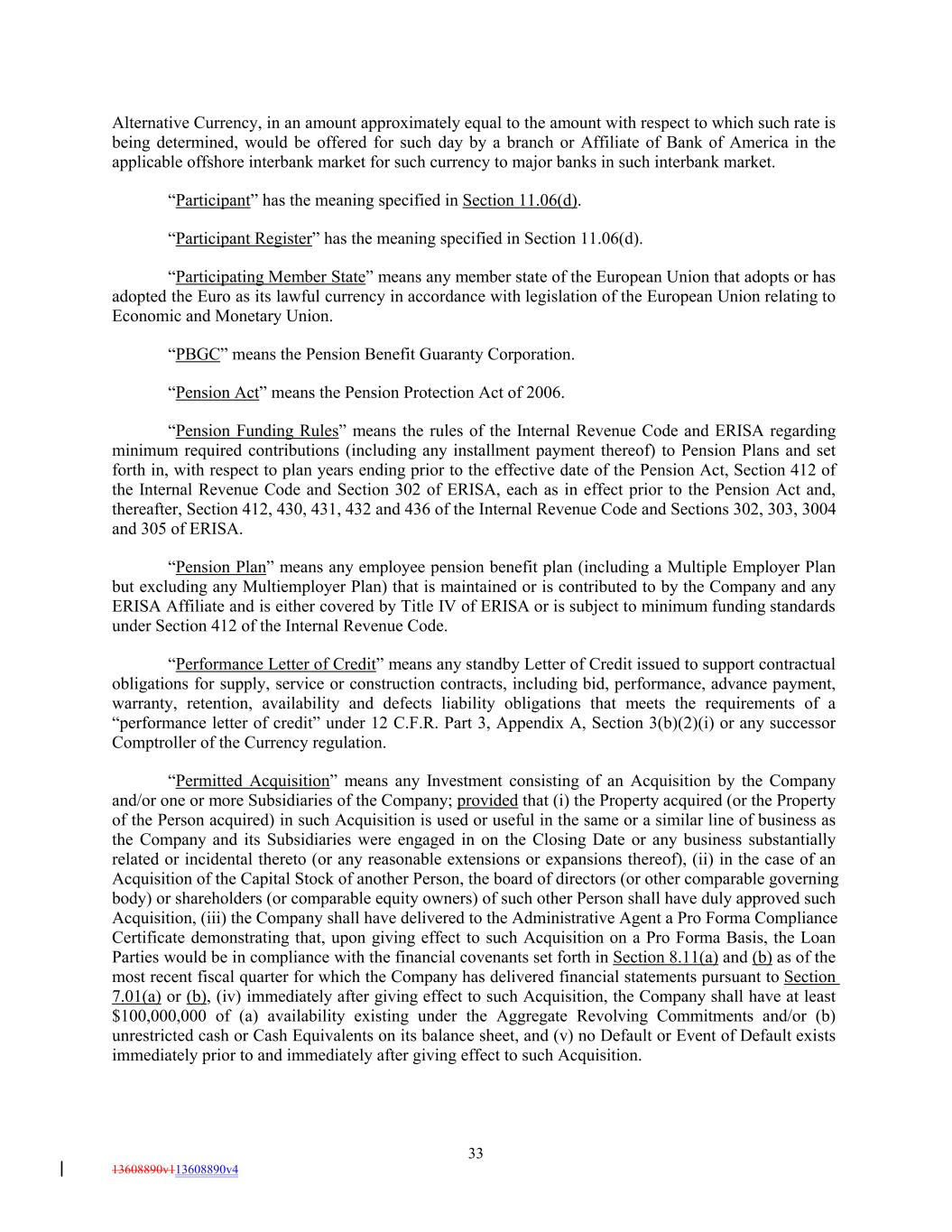 Alternative Currency, in an amount approximately equal to the amount with respect to which such rate is being determined, would be offered for such day by a branch or Affiliate of Bank of America in the applicable offshore interbank market for such currency to major banks in such interbank market. “Participant” has the meaning specified in Section 11.06(d). “Participant Register” has the meaning specified in Section 11.06(d). “Participating Member State” means any member state of the European Union that adopts or has adopted the Euro as its lawful currency in accordance with legislation of the European Union relating to Economic and Monetary Union. “PBGC” means the Pension Benefit Guaranty Corporation. “Pension Act” means the Pension Protection Act of 2006. “Pension Funding Rules” means the rules of the Internal Revenue Code and ERISA regarding minimum required contributions (including any installment payment thereof) to Pension Plans and set forth in, with respect to plan years ending prior to the effective date of the Pension Act, Section 412 of the Internal Revenue Code and Section 302 of ERISA, each as in effect prior to the Pension Act and, thereafter, Section 412, 430, 431, 432 and 436 of the Internal Revenue Code and Sections 302, 303, 3004 and 305 of ERISA. “Pension Plan” means any employee pension benefit plan (including a Multiple Employer Plan but excluding any Multiemployer Plan) that is maintained or is contributed to by the Company and any ERISA Affiliate and is either covered by Title IV of ERISA or is subject to minimum funding standards under Section 412 of the Internal Revenue Code. “Performance Letter of Credit” means any standby Letter of Credit issued to support contractual obligations for supply, service or construction contracts, including bid, performance, advance payment, warranty, retention, availability and defects liability obligations that meets the requirements of a “performance letter of credit” under 12 C.F.R. Part 3, Appendix A, Section 3(b)(2)(i) or any successor Comptroller of the Currency regulation. “Permitted Acquisition” means any Investment consisting of an Acquisition by the Company and/or one or more Subsidiaries of the Company; provided that (i) the Property acquired (or the Property of the Person acquired) in such Acquisition is used or useful in the same or a similar line of business as the Company and its Subsidiaries were engaged in on the Closing Date or any business substantially related or incidental thereto (or any reasonable extensions or expansions thereof), (ii) in the case of an Acquisition of the Capital Stock of another Person, the board of directors (or other comparable governing body) or shareholders (or comparable equity owners) of such other Person shall have duly approved such Acquisition, (iii) the Company shall have delivered to the Administrative Agent a Pro Forma Compliance Certificate demonstrating that, upon giving effect to such Acquisition on a Pro Forma Basis, the Loan Parties would be in compliance with the financial covenants set forth in Section 8.11(a) and (b) as of the most recent fiscal quarter for which the Company has delivered financial statements pursuant to Section 7.01(a) or (b), (iv) immediately after giving effect to such Acquisition, the Company shall have at least $100,000,000 of (a) availability existing under the Aggregate Revolving Commitments and/or (b) unrestricted cash or Cash Equivalents on its balance sheet, and (v) no Default or Event of Default exists immediately prior to and immediately after giving effect to such Acquisition. 33 13608890v113608890v4