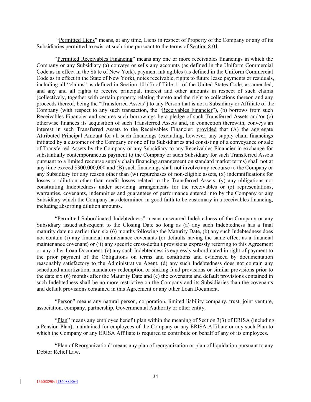 “Permitted Liens” means, at any time, Liens in respect of Property of the Company or any of its Subsidiaries permitted to exist at such time pursuant to the terms of Section 8.01. “Permitted Receivables Financing” means any one or more receivables financings in which the Company or any Subsidiary (a) conveys or sells any accounts (as defined in the Uniform Commercial Code as in effect in the State of New York), payment intangibles (as defined in the Uniform Commercial Code as in effect in the State of New York), notes receivable, rights to future lease payments or residuals, including all “claims” as defined in Section 101(5) of Title 11 of the United States Code, as amended, and any and all rights to receive principal, interest and other amounts in respect of such claims (collectively, together with certain property relating thereto and the right to collections thereon and any proceeds thereof, being the “Transferred Assets”) to any Person that is not a Subsidiary or Affiliate of the Company (with respect to any such transaction, the “Receivables Financier”), (b) borrows from such Receivables Financier and secures such borrowings by a pledge of such Transferred Assets and/or (c) otherwise finances its acquisition of such Transferred Assets and, in connection therewith, conveys an interest in such Transferred Assets to the Receivables Financier; provided that (A) the aggregate Attributed Principal Amount for all such financings (excluding, however, any supply chain financings initiated by a customer of the Company or one of its Subsidiaries and consisting of a conveyance or sale of Transferred Assets by the Company or any Subsidiary to any Receivables Financier in exchange for substantially contemporaneous payment to the Company or such Subsidiary for such Transferred Assets pursuant to a limited recourse supply chain financing arrangement on standard market terms) shall not at any time exceed $300,000,000 and (B) such financings shall not involve any recourse to the Company or any Subsidiary for any reason other than (w) repurchases of non-eligible assets, (x) indemnifications for losses or dilution other than credit losses related to the Transferred Assets, (y) any obligations not constituting Indebtedness under servicing arrangements for the receivables or (z) representations, warranties, covenants, indemnities and guarantees of performance entered into by the Company or any Subsidiary which the Company has determined in good faith to be customary in a receivables financing, including absorbing dilution amounts. “Permitted Subordinated Indebtedness” means unsecured Indebtedness of the Company or any Subsidiary issued subsequent to the Closing Date so long as (a) any such Indebtedness has a final maturity date no earlier than six (6) months following the Maturity Date, (b) any such Indebtedness does not contain (i) any financial maintenance covenants (or defaults having the same effect as a financial maintenance covenant) or (ii) any specific cross-default provisions expressly referring to this Agreement or any other Loan Document, (c) any such Indebtedness is expressly subordinated in right of payment to the prior payment of the Obligations on terms and conditions and evidenced by documentation reasonably satisfactory to the Administrative Agent, (d) any such Indebtedness does not contain any scheduled amortization, mandatory redemption or sinking fund provisions or similar provisions prior to the date six (6) months after the Maturity Date and (e) the covenants and default provisions contained in such Indebtedness shall be no more restrictive on the Company and its Subsidiaries than the covenants and default provisions contained in this Agreement or any other Loan Document. “Person” means any natural person, corporation, limited liability company, trust, joint venture, association, company, partnership, Governmental Authority or other entity. “Plan” means any employee benefit plan within the meaning of Section 3(3) of ERISA (including a Pension Plan), maintained for employees of the Company or any ERISA Affiliate or any such Plan to which the Company or any ERISA Affiliate is required to contribute on behalf of any of its employees. “Plan of Reorganization” means any plan of reorganization or plan of liquidation pursuant to any Debtor Relief Law. 34 13608890v113608890v4