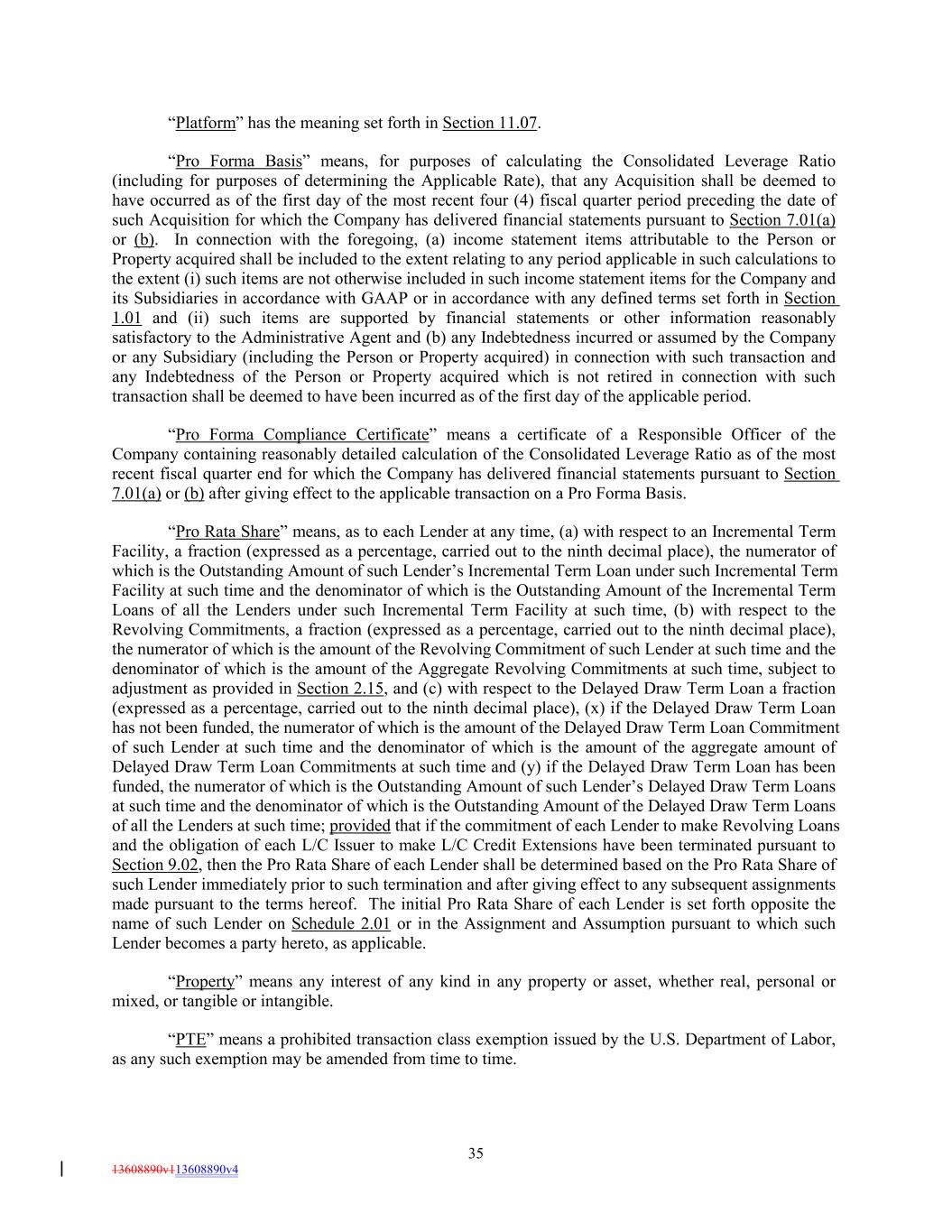 “Platform” has the meaning set forth in Section 11.07. “Pro Forma Basis” means, for purposes of calculating the Consolidated Leverage Ratio (including for purposes of determining the Applicable Rate), that any Acquisition shall be deemed to have occurred as of the first day of the most recent four (4) fiscal quarter period preceding the date of such Acquisition for which the Company has delivered financial statements pursuant to Section 7.01(a) or (b). In connection with the foregoing, (a) income statement items attributable to the Person or Property acquired shall be included to the extent relating to any period applicable in such calculations to the extent (i) such items are not otherwise included in such income statement items for the Company and its Subsidiaries in accordance with GAAP or in accordance with any defined terms set forth in Section 1.01 and (ii) such items are supported by financial statements or other information reasonably satisfactory to the Administrative Agent and (b) any Indebtedness incurred or assumed by the Company or any Subsidiary (including the Person or Property acquired) in connection with such transaction and any Indebtedness of the Person or Property acquired which is not retired in connection with such transaction shall be deemed to have been incurred as of the first day of the applicable period. “Pro Forma Compliance Certificate” means a certificate of a Responsible Officer of the Company containing reasonably detailed calculation of the Consolidated Leverage Ratio as of the most recent fiscal quarter end for which the Company has delivered financial statements pursuant to Section 7.01(a) or (b) after giving effect to the applicable transaction on a Pro Forma Basis. “Pro Rata Share” means, as to each Lender at any time, (a) with respect to an Incremental Term Facility, a fraction (expressed as a percentage, carried out to the ninth decimal place), the numerator of which is the Outstanding Amount of such Lender’s Incremental Term Loan under such Incremental Term Facility at such time and the denominator of which is the Outstanding Amount of the Incremental Term Loans of all the Lenders under such Incremental Term Facility at such time, (b) with respect to the Revolving Commitments, a fraction (expressed as a percentage, carried out to the ninth decimal place), the numerator of which is the amount of the Revolving Commitment of such Lender at such time and the denominator of which is the amount of the Aggregate Revolving Commitments at such time, subject to adjustment as provided in Section 2.15, and (c) with respect to the Delayed Draw Term Loan a fraction (expressed as a percentage, carried out to the ninth decimal place), (x) if the Delayed Draw Term Loan has not been funded, the numerator of which is the amount of the Delayed Draw Term Loan Commitment of such Lender at such time and the denominator of which is the amount of the aggregate amount of Delayed Draw Term Loan Commitments at such time and (y) if the Delayed Draw Term Loan has been funded, the numerator of which is the Outstanding Amount of such Lender’s Delayed Draw Term Loans at such time and the denominator of which is the Outstanding Amount of the Delayed Draw Term Loans of all the Lenders at such time; provided that if the commitment of each Lender to make Revolving Loans and the obligation of each L/C Issuer to make L/C Credit Extensions have been terminated pursuant to Section 9.02, then the Pro Rata Share of each Lender shall be determined based on the Pro Rata Share of such Lender immediately prior to such termination and after giving effect to any subsequent assignments made pursuant to the terms hereof. The initial Pro Rata Share of each Lender is set forth opposite the name of such Lender on Schedule 2.01 or in the Assignment and Assumption pursuant to which such Lender becomes a party hereto, as applicable. “Property” means any interest of any kind in any property or asset, whether real, personal or mixed, or tangible or intangible. “PTE” means a prohibited transaction class exemption issued by the U.S. Department of Labor, as any such exemption may be amended from time to time. 35 13608890v113608890v4