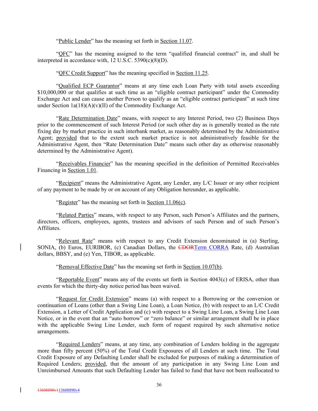 “Public Lender” has the meaning set forth in Section 11.07. “QFC” has the meaning assigned to the term “qualified financial contract” in, and shall be interpreted in accordance with, 12 U.S.C. 5390(c)(8)(D). “QFC Credit Support” has the meaning specified in Section 11.25. “Qualified ECP Guarantor” means at any time each Loan Party with total assets exceeding $10,000,000 or that qualifies at such time as an “eligible contract participant” under the Commodity Exchange Act and can cause another Person to qualify as an “eligible contract participant” at such time under Section 1a(18)(A)(v)(II) of the Commodity Exchange Act. “Rate Determination Date” means, with respect to any Interest Period, two (2) Business Days prior to the commencement of such Interest Period (or such other day as is generally treated as the rate fixing day by market practice in such interbank market, as reasonably determined by the Administrative Agent; provided that to the extent such market practice is not administratively feasible for the Administrative Agent, then “Rate Determination Date” means such other day as otherwise reasonably determined by the Administrative Agent). “Receivables Financier” has the meaning specified in the definition of Permitted Receivables Financing in Section 1.01. “Recipient” means the Administrative Agent, any Lender, any L/C Issuer or any other recipient of any payment to be made by or on account of any Obligation hereunder, as applicable. “Register” has the meaning set forth in Section 11.06(c). “Related Parties” means, with respect to any Person, such Person’s Affiliates and the partners, directors, officers, employees, agents, trustees and advisors of such Person and of such Person’s Affiliates. “Relevant Rate” means with respect to any Credit Extension denominated in (a) Sterling, SONIA, (b) Euros, EURIBOR, (c) Canadian Dollars, the CDORTerm CORRA Rate, (d) Australian dollars, BBSY, and (e) Yen, TIBOR, as applicable. “Removal Effective Date” has the meaning set forth in Section 10.07(b). “Reportable Event” means any of the events set forth in Section 4043(c) of ERISA, other than events for which the thirty-day notice period has been waived. “Request for Credit Extension” means (a) with respect to a Borrowing or the conversion or continuation of Loans (other than a Swing Line Loan), a Loan Notice, (b) with respect to an L/C Credit Extension, a Letter of Credit Application and (c) with respect to a Swing Line Loan, a Swing Line Loan Notice, or in the event that an “auto borrow” or “zero balance” or similar arrangement shall be in place with the applicable Swing Line Lender, such form of request required by such alternative notice arrangements. “Required Lenders” means, at any time, any combination of Lenders holding in the aggregate more than fifty percent (50%) of the Total Credit Exposures of all Lenders at such time. The Total Credit Exposure of any Defaulting Lender shall be excluded for purposes of making a determination of Required Lenders; provided, that the amount of any participation in any Swing Line Loan and Unreimbursed Amounts that such Defaulting Lender has failed to fund that have not been reallocated to 36 13608890v113608890v4