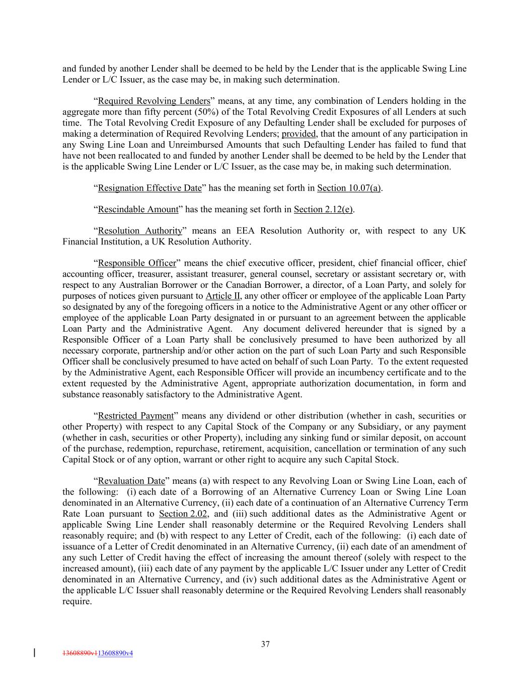 and funded by another Lender shall be deemed to be held by the Lender that is the applicable Swing Line Lender or L/C Issuer, as the case may be, in making such determination. “Required Revolving Lenders” means, at any time, any combination of Lenders holding in the aggregate more than fifty percent (50%) of the Total Revolving Credit Exposures of all Lenders at such time. The Total Revolving Credit Exposure of any Defaulting Lender shall be excluded for purposes of making a determination of Required Revolving Lenders; provided, that the amount of any participation in any Swing Line Loan and Unreimbursed Amounts that such Defaulting Lender has failed to fund that have not been reallocated to and funded by another Lender shall be deemed to be held by the Lender that is the applicable Swing Line Lender or L/C Issuer, as the case may be, in making such determination. “Resignation Effective Date” has the meaning set forth in Section 10.07(a). “Rescindable Amount” has the meaning set forth in Section 2.12(e). “Resolution Authority” means an EEA Resolution Authority or, with respect to any UK Financial Institution, a UK Resolution Authority. “Responsible Officer” means the chief executive officer, president, chief financial officer, chief accounting officer, treasurer, assistant treasurer, general counsel, secretary or assistant secretary or, with respect to any Australian Borrower or the Canadian Borrower, a director, of a Loan Party, and solely for purposes of notices given pursuant to Article II, any other officer or employee of the applicable Loan Party so designated by any of the foregoing officers in a notice to the Administrative Agent or any other officer or employee of the applicable Loan Party designated in or pursuant to an agreement between the applicable Loan Party and the Administrative Agent. Any document delivered hereunder that is signed by a Responsible Officer of a Loan Party shall be conclusively presumed to have been authorized by all necessary corporate, partnership and/or other action on the part of such Loan Party and such Responsible Officer shall be conclusively presumed to have acted on behalf of such Loan Party. To the extent requested by the Administrative Agent, each Responsible Officer will provide an incumbency certificate and to the extent requested by the Administrative Agent, appropriate authorization documentation, in form and substance reasonably satisfactory to the Administrative Agent. “Restricted Payment” means any dividend or other distribution (whether in cash, securities or other Property) with respect to any Capital Stock of the Company or any Subsidiary, or any payment (whether in cash, securities or other Property), including any sinking fund or similar deposit, on account of the purchase, redemption, repurchase, retirement, acquisition, cancellation or termination of any such Capital Stock or of any option, warrant or other right to acquire any such Capital Stock. “Revaluation Date” means (a) with respect to any Revolving Loan or Swing Line Loan, each of the following: (i) each date of a Borrowing of an Alternative Currency Loan or Swing Line Loan denominated in an Alternative Currency, (ii) each date of a continuation of an Alternative Currency Term Rate Loan pursuant to Section 2.02, and (iii) such additional dates as the Administrative Agent or applicable Swing Line Lender shall reasonably determine or the Required Revolving Lenders shall reasonably require; and (b) with respect to any Letter of Credit, each of the following: (i) each date of issuance of a Letter of Credit denominated in an Alternative Currency, (ii) each date of an amendment of any such Letter of Credit having the effect of increasing the amount thereof (solely with respect to the increased amount), (iii) each date of any payment by the applicable L/C Issuer under any Letter of Credit denominated in an Alternative Currency, and (iv) such additional dates as the Administrative Agent or the applicable L/C Issuer shall reasonably determine or the Required Revolving Lenders shall reasonably require. 37 13608890v113608890v4