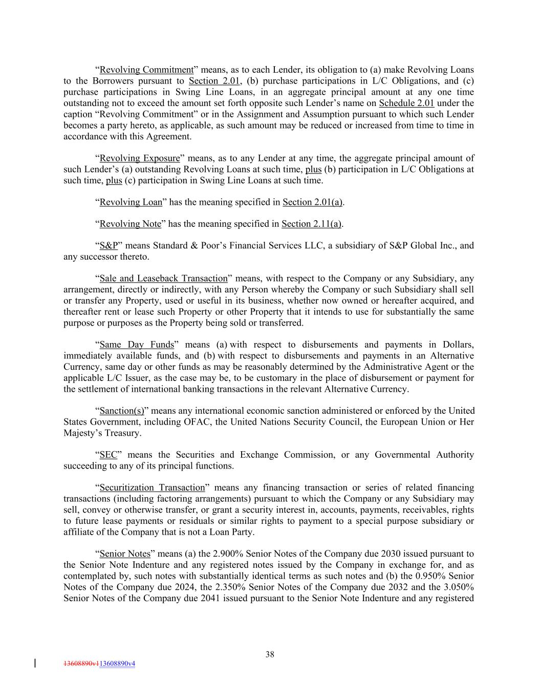 “Revolving Commitment” means, as to each Lender, its obligation to (a) make Revolving Loans to the Borrowers pursuant to Section 2.01, (b) purchase participations in L/C Obligations, and (c) purchase participations in Swing Line Loans, in an aggregate principal amount at any one time outstanding not to exceed the amount set forth opposite such Lender’s name on Schedule 2.01 under the caption “Revolving Commitment” or in the Assignment and Assumption pursuant to which such Lender becomes a party hereto, as applicable, as such amount may be reduced or increased from time to time in accordance with this Agreement. “Revolving Exposure” means, as to any Lender at any time, the aggregate principal amount of such Lender’s (a) outstanding Revolving Loans at such time, plus (b) participation in L/C Obligations at such time, plus (c) participation in Swing Line Loans at such time. “Revolving Loan” has the meaning specified in Section 2.01(a). “Revolving Note” has the meaning specified in Section 2.11(a). “S&P” means Standard & Poor’s Financial Services LLC, a subsidiary of S&P Global Inc., and any successor thereto. “Sale and Leaseback Transaction” means, with respect to the Company or any Subsidiary, any arrangement, directly or indirectly, with any Person whereby the Company or such Subsidiary shall sell or transfer any Property, used or useful in its business, whether now owned or hereafter acquired, and thereafter rent or lease such Property or other Property that it intends to use for substantially the same purpose or purposes as the Property being sold or transferred. “Same Day Funds” means (a) with respect to disbursements and payments in Dollars, immediately available funds, and (b) with respect to disbursements and payments in an Alternative Currency, same day or other funds as may be reasonably determined by the Administrative Agent or the applicable L/C Issuer, as the case may be, to be customary in the place of disbursement or payment for the settlement of international banking transactions in the relevant Alternative Currency. “Sanction(s)” means any international economic sanction administered or enforced by the United States Government, including OFAC, the United Nations Security Council, the European Union or Her Majesty’s Treasury. “SEC” means the Securities and Exchange Commission, or any Governmental Authority succeeding to any of its principal functions. “Securitization Transaction” means any financing transaction or series of related financing transactions (including factoring arrangements) pursuant to which the Company or any Subsidiary may sell, convey or otherwise transfer, or grant a security interest in, accounts, payments, receivables, rights to future lease payments or residuals or similar rights to payment to a special purpose subsidiary or affiliate of the Company that is not a Loan Party. “Senior Notes” means (a) the 2.900% Senior Notes of the Company due 2030 issued pursuant to the Senior Note Indenture and any registered notes issued by the Company in exchange for, and as contemplated by, such notes with substantially identical terms as such notes and (b) the 0.950% Senior Notes of the Company due 2024, the 2.350% Senior Notes of the Company due 2032 and the 3.050% Senior Notes of the Company due 2041 issued pursuant to the Senior Note Indenture and any registered 38 13608890v113608890v4