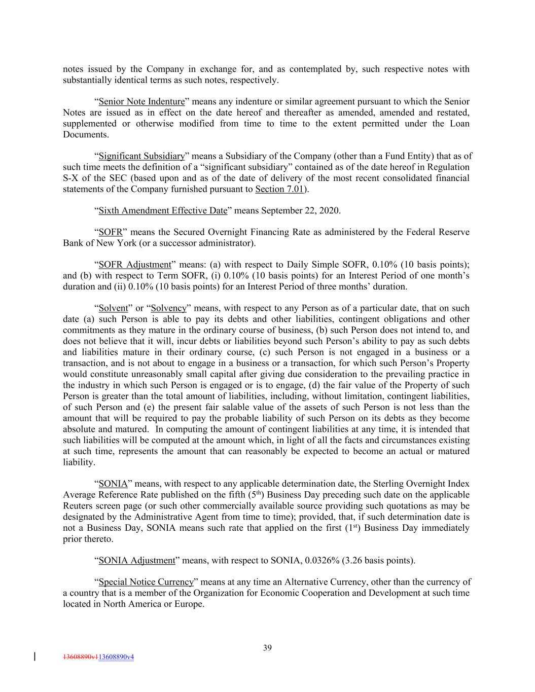 notes issued by the Company in exchange for, and as contemplated by, such respective notes with substantially identical terms as such notes, respectively. “Senior Note Indenture” means any indenture or similar agreement pursuant to which the Senior Notes are issued as in effect on the date hereof and thereafter as amended, amended and restated, supplemented or otherwise modified from time to time to the extent permitted under the Loan Documents. “Significant Subsidiary” means a Subsidiary of the Company (other than a Fund Entity) that as of such time meets the definition of a “significant subsidiary” contained as of the date hereof in Regulation S-X of the SEC (based upon and as of the date of delivery of the most recent consolidated financial statements of the Company furnished pursuant to Section 7.01). “Sixth Amendment Effective Date” means September 22, 2020. “SOFR” means the Secured Overnight Financing Rate as administered by the Federal Reserve Bank of New York (or a successor administrator). “SOFR Adjustment” means: (a) with respect to Daily Simple SOFR, 0.10% (10 basis points); and (b) with respect to Term SOFR, (i) 0.10% (10 basis points) for an Interest Period of one month’s duration and (ii) 0.10% (10 basis points) for an Interest Period of three months’ duration. “Solvent” or “Solvency” means, with respect to any Person as of a particular date, that on such date (a) such Person is able to pay its debts and other liabilities, contingent obligations and other commitments as they mature in the ordinary course of business, (b) such Person does not intend to, and does not believe that it will, incur debts or liabilities beyond such Person’s ability to pay as such debts and liabilities mature in their ordinary course, (c) such Person is not engaged in a business or a transaction, and is not about to engage in a business or a transaction, for which such Person’s Property would constitute unreasonably small capital after giving due consideration to the prevailing practice in the industry in which such Person is engaged or is to engage, (d) the fair value of the Property of such Person is greater than the total amount of liabilities, including, without limitation, contingent liabilities, of such Person and (e) the present fair salable value of the assets of such Person is not less than the amount that will be required to pay the probable liability of such Person on its debts as they become absolute and matured. In computing the amount of contingent liabilities at any time, it is intended that such liabilities will be computed at the amount which, in light of all the facts and circumstances existing at such time, represents the amount that can reasonably be expected to become an actual or matured liability. “SONIA” means, with respect to any applicable determination date, the Sterling Overnight Index Average Reference Rate published on the fifth (5th) Business Day preceding such date on the applicable Reuters screen page (or such other commercially available source providing such quotations as may be designated by the Administrative Agent from time to time); provided, that, if such determination date is not a Business Day, SONIA means such rate that applied on the first (1st) Business Day immediately prior thereto. “SONIA Adjustment” means, with respect to SONIA, 0.0326% (3.26 basis points). “Special Notice Currency” means at any time an Alternative Currency, other than the currency of a country that is a member of the Organization for Economic Cooperation and Development at such time located in North America or Europe. 39 13608890v113608890v4