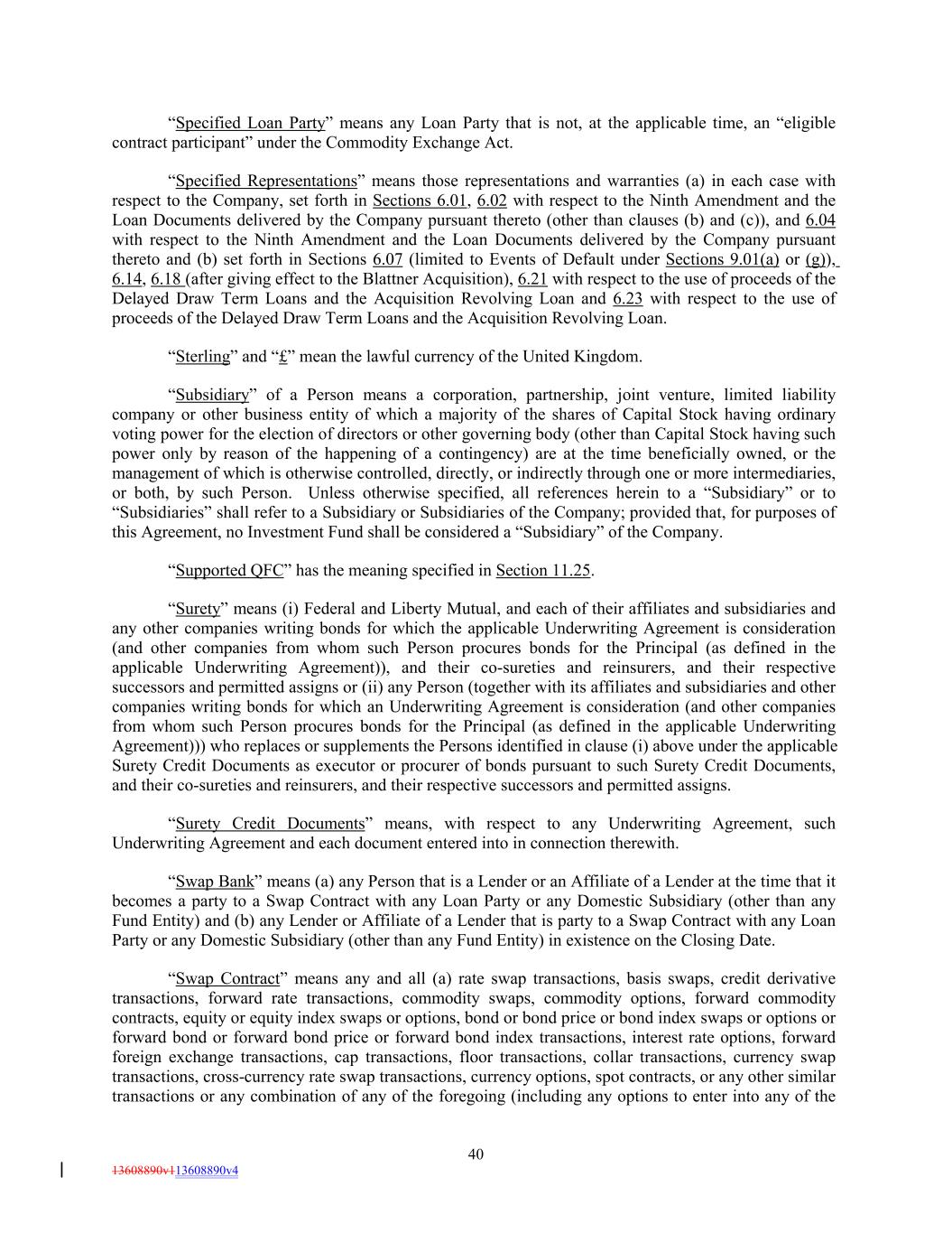 “Specified Loan Party” means any Loan Party that is not, at the applicable time, an “eligible contract participant” under the Commodity Exchange Act. “Specified Representations” means those representations and warranties (a) in each case with respect to the Company, set forth in Sections 6.01, 6.02 with respect to the Ninth Amendment and the Loan Documents delivered by the Company pursuant thereto (other than clauses (b) and (c)), and 6.04 with respect to the Ninth Amendment and the Loan Documents delivered by the Company pursuant thereto and (b) set forth in Sections 6.07 (limited to Events of Default under Sections 9.01(a) or (g)), 6.14, 6.18 (after giving effect to the Blattner Acquisition), 6.21 with respect to the use of proceeds of the Delayed Draw Term Loans and the Acquisition Revolving Loan and 6.23 with respect to the use of proceeds of the Delayed Draw Term Loans and the Acquisition Revolving Loan. “Sterling” and “£” mean the lawful currency of the United Kingdom. “Subsidiary” of a Person means a corporation, partnership, joint venture, limited liability company or other business entity of which a majority of the shares of Capital Stock having ordinary voting power for the election of directors or other governing body (other than Capital Stock having such power only by reason of the happening of a contingency) are at the time beneficially owned, or the management of which is otherwise controlled, directly, or indirectly through one or more intermediaries, or both, by such Person. Unless otherwise specified, all references herein to a “Subsidiary” or to “Subsidiaries” shall refer to a Subsidiary or Subsidiaries of the Company; provided that, for purposes of this Agreement, no Investment Fund shall be considered a “Subsidiary” of the Company. “Supported QFC” has the meaning specified in Section 11.25. “Surety” means (i) Federal and Liberty Mutual, and each of their affiliates and subsidiaries and any other companies writing bonds for which the applicable Underwriting Agreement is consideration (and other companies from whom such Person procures bonds for the Principal (as defined in the applicable Underwriting Agreement)), and their co-sureties and reinsurers, and their respective successors and permitted assigns or (ii) any Person (together with its affiliates and subsidiaries and other companies writing bonds for which an Underwriting Agreement is consideration (and other companies from whom such Person procures bonds for the Principal (as defined in the applicable Underwriting Agreement))) who replaces or supplements the Persons identified in clause (i) above under the applicable Surety Credit Documents as executor or procurer of bonds pursuant to such Surety Credit Documents, and their co-sureties and reinsurers, and their respective successors and permitted assigns. “Surety Credit Documents” means, with respect to any Underwriting Agreement, such Underwriting Agreement and each document entered into in connection therewith. “Swap Bank” means (a) any Person that is a Lender or an Affiliate of a Lender at the time that it becomes a party to a Swap Contract with any Loan Party or any Domestic Subsidiary (other than any Fund Entity) and (b) any Lender or Affiliate of a Lender that is party to a Swap Contract with any Loan Party or any Domestic Subsidiary (other than any Fund Entity) in existence on the Closing Date. “Swap Contract” means any and all (a) rate swap transactions, basis swaps, credit derivative transactions, forward rate transactions, commodity swaps, commodity options, forward commodity contracts, equity or equity index swaps or options, bond or bond price or bond index swaps or options or forward bond or forward bond price or forward bond index transactions, interest rate options, forward foreign exchange transactions, cap transactions, floor transactions, collar transactions, currency swap transactions, cross-currency rate swap transactions, currency options, spot contracts, or any other similar transactions or any combination of any of the foregoing (including any options to enter into any of the 40 13608890v113608890v4