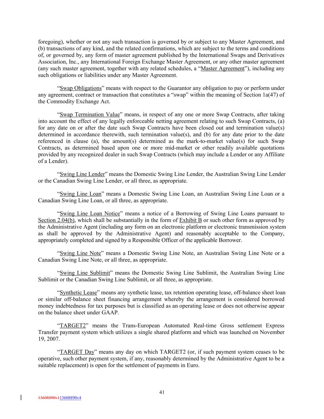 foregoing), whether or not any such transaction is governed by or subject to any Master Agreement, and (b) transactions of any kind, and the related confirmations, which are subject to the terms and conditions of, or governed by, any form of master agreement published by the International Swaps and Derivatives Association, Inc., any International Foreign Exchange Master Agreement, or any other master agreement (any such master agreement, together with any related schedules, a “Master Agreement”), including any such obligations or liabilities under any Master Agreement. “Swap Obligations” means with respect to the Guarantor any obligation to pay or perform under any agreement, contract or transaction that constitutes a “swap” within the meaning of Section 1a(47) of the Commodity Exchange Act. “Swap Termination Value” means, in respect of any one or more Swap Contracts, after taking into account the effect of any legally enforceable netting agreement relating to such Swap Contracts, (a) for any date on or after the date such Swap Contracts have been closed out and termination value(s) determined in accordance therewith, such termination value(s), and (b) for any date prior to the date referenced in clause (a), the amount(s) determined as the mark-to-market value(s) for such Swap Contracts, as determined based upon one or more mid-market or other readily available quotations provided by any recognized dealer in such Swap Contracts (which may include a Lender or any Affiliate of a Lender). “Swing Line Lender” means the Domestic Swing Line Lender, the Australian Swing Line Lender or the Canadian Swing Line Lender, or all three, as appropriate. “Swing Line Loan” means a Domestic Swing Line Loan, an Australian Swing Line Loan or a Canadian Swing Line Loan, or all three, as appropriate. “Swing Line Loan Notice” means a notice of a Borrowing of Swing Line Loans pursuant to Section 2.04(b), which shall be substantially in the form of Exhibit B or such other form as approved by the Administrative Agent (including any form on an electronic platform or electronic transmission system as shall be approved by the Administrative Agent) and reasonably acceptable to the Company, appropriately completed and signed by a Responsible Officer of the applicable Borrower. “Swing Line Note” means a Domestic Swing Line Note, an Australian Swing Line Note or a Canadian Swing Line Note, or all three, as appropriate. “Swing Line Sublimit” means the Domestic Swing Line Sublimit, the Australian Swing Line Sublimit or the Canadian Swing Line Sublimit, or all three, as appropriate. “Synthetic Lease” means any synthetic lease, tax retention operating lease, off-balance sheet loan or similar off-balance sheet financing arrangement whereby the arrangement is considered borrowed money indebtedness for tax purposes but is classified as an operating lease or does not otherwise appear on the balance sheet under GAAP. “TARGET2” means the Trans-European Automated Real-time Gross settlement Express Transfer payment system which utilizes a single shared platform and which was launched on November 19, 2007. “TARGET Day” means any day on which TARGET2 (or, if such payment system ceases to be operative, such other payment system, if any, reasonably determined by the Administrative Agent to be a suitable replacement) is open for the settlement of payments in Euro. 41 13608890v113608890v4