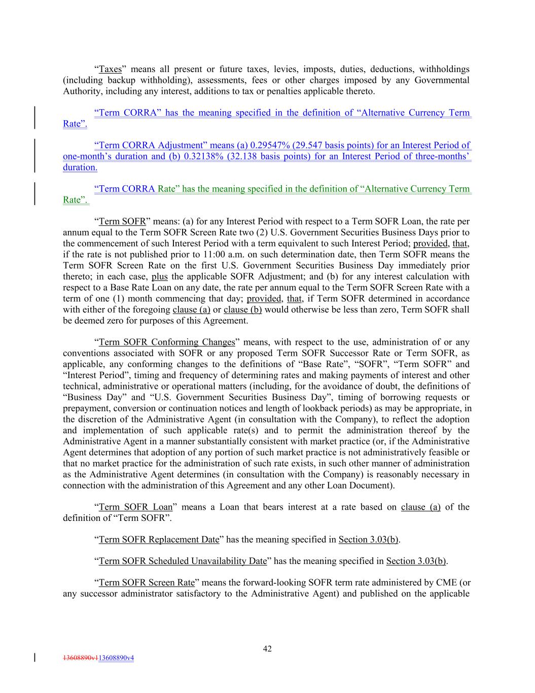 “Taxes” means all present or future taxes, levies, imposts, duties, deductions, withholdings (including backup withholding), assessments, fees or other charges imposed by any Governmental Authority, including any interest, additions to tax or penalties applicable thereto. “Term CORRA” has the meaning specified in the definition of “Alternative Currency Term Rate”. “Term CORRA Adjustment” means (a) 0.29547% (29.547 basis points) for an Interest Period of one-month’s duration and (b) 0.32138% (32.138 basis points) for an Interest Period of three-months’ duration. “Term CORRA Rate” has the meaning specified in the definition of “Alternative Currency Term Rate”. “Term SOFR” means: (a) for any Interest Period with respect to a Term SOFR Loan, the rate per annum equal to the Term SOFR Screen Rate two (2) U.S. Government Securities Business Days prior to the commencement of such Interest Period with a term equivalent to such Interest Period; provided, that, if the rate is not published prior to 11:00 a.m. on such determination date, then Term SOFR means the Term SOFR Screen Rate on the first U.S. Government Securities Business Day immediately prior thereto; in each case, plus the applicable SOFR Adjustment; and (b) for any interest calculation with respect to a Base Rate Loan on any date, the rate per annum equal to the Term SOFR Screen Rate with a term of one (1) month commencing that day; provided, that, if Term SOFR determined in accordance with either of the foregoing clause (a) or clause (b) would otherwise be less than zero, Term SOFR shall be deemed zero for purposes of this Agreement. “Term SOFR Conforming Changes” means, with respect to the use, administration of or any conventions associated with SOFR or any proposed Term SOFR Successor Rate or Term SOFR, as applicable, any conforming changes to the definitions of “Base Rate”, “SOFR”, “Term SOFR” and “Interest Period”, timing and frequency of determining rates and making payments of interest and other technical, administrative or operational matters (including, for the avoidance of doubt, the definitions of “Business Day” and “U.S. Government Securities Business Day”, timing of borrowing requests or prepayment, conversion or continuation notices and length of lookback periods) as may be appropriate, in the discretion of the Administrative Agent (in consultation with the Company), to reflect the adoption and implementation of such applicable rate(s) and to permit the administration thereof by the Administrative Agent in a manner substantially consistent with market practice (or, if the Administrative Agent determines that adoption of any portion of such market practice is not administratively feasible or that no market practice for the administration of such rate exists, in such other manner of administration as the Administrative Agent determines (in consultation with the Company) is reasonably necessary in connection with the administration of this Agreement and any other Loan Document). “Term SOFR Loan” means a Loan that bears interest at a rate based on clause (a) of the definition of “Term SOFR”. “Term SOFR Replacement Date” has the meaning specified in Section 3.03(b). “Term SOFR Scheduled Unavailability Date” has the meaning specified in Section 3.03(b). “Term SOFR Screen Rate” means the forward-looking SOFR term rate administered by CME (or any successor administrator satisfactory to the Administrative Agent) and published on the applicable 42 13608890v113608890v4